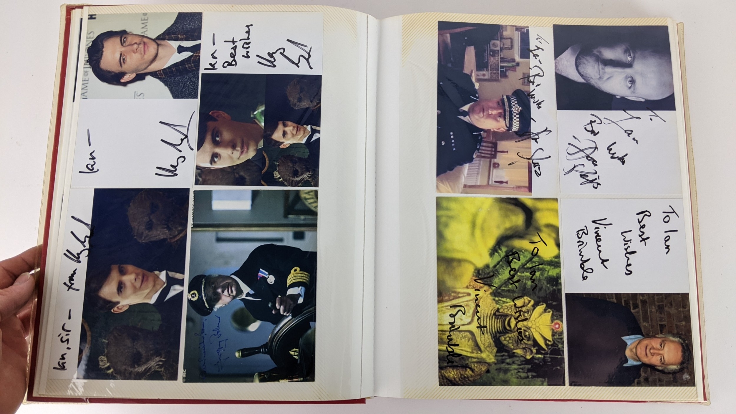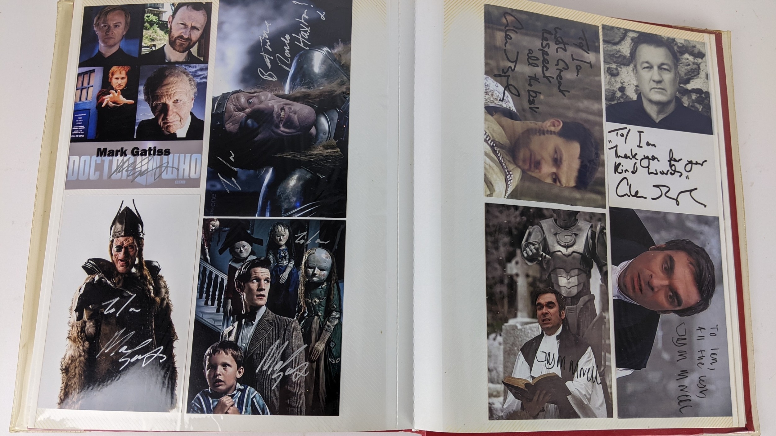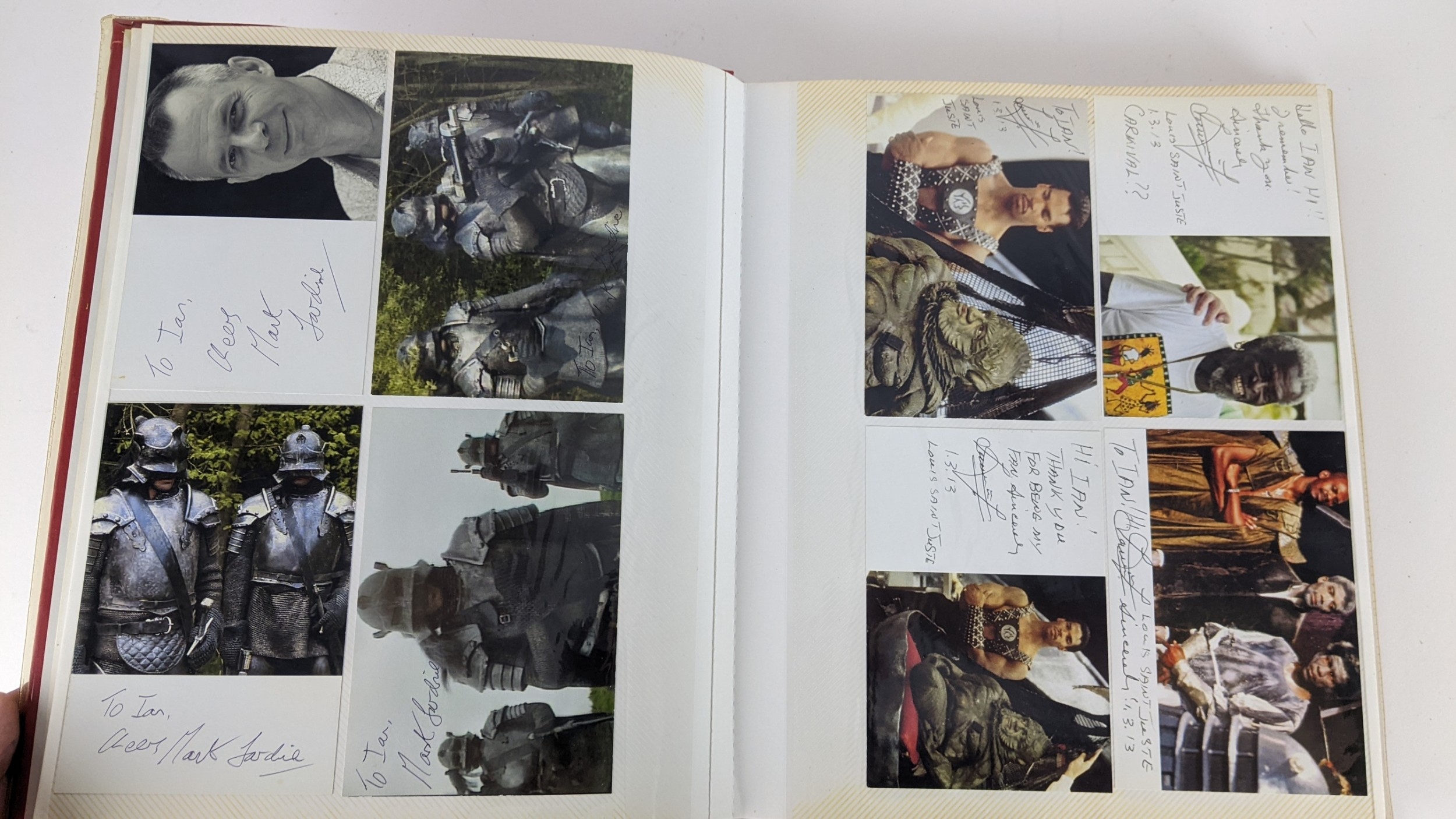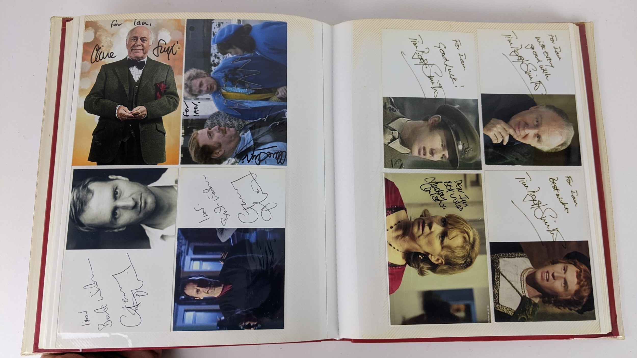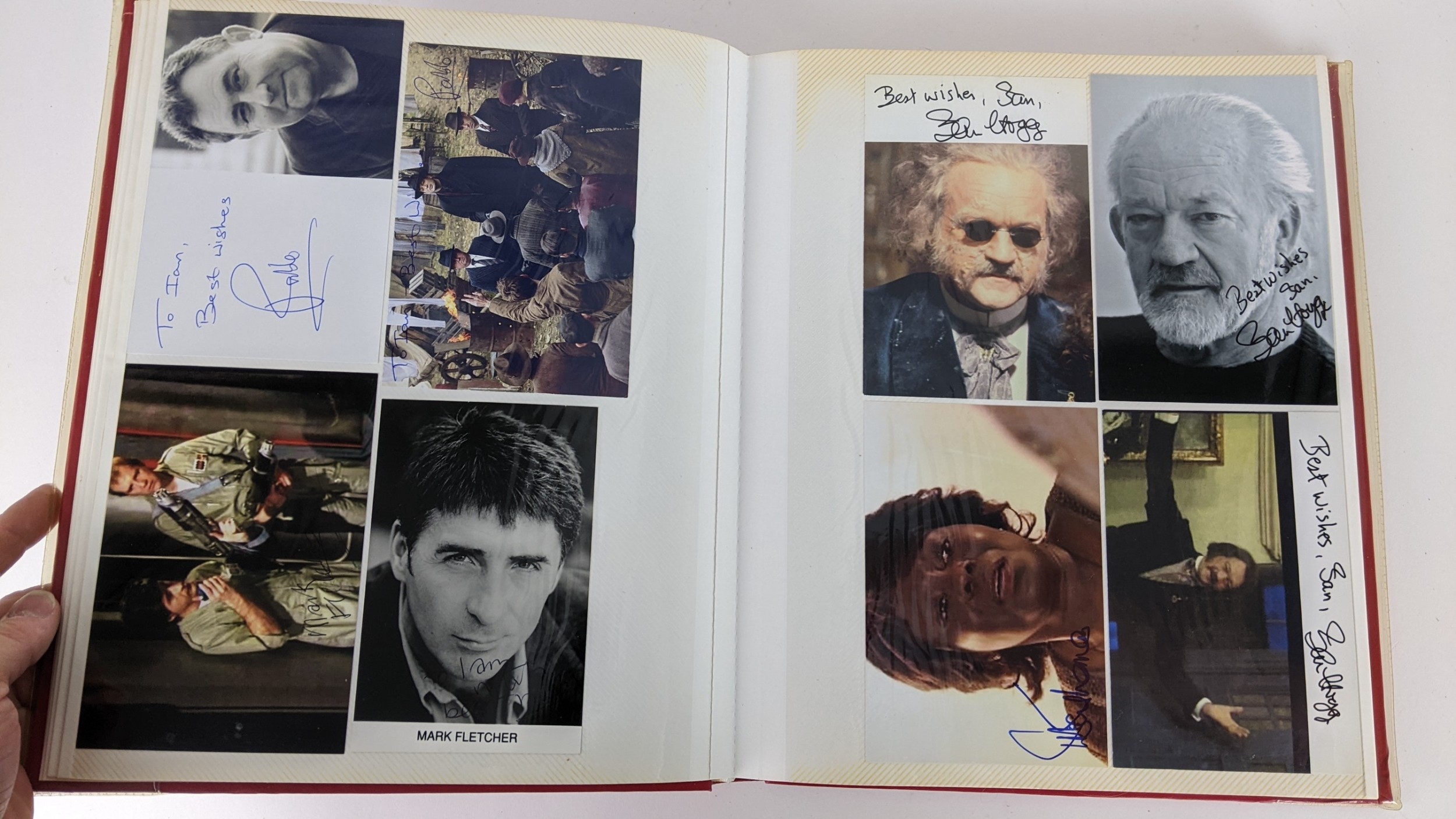 A Doctor Who album of autographs on photos, signed by several cast members to include Jacqueline Pearce, Tara Ward, Sarah Lancashire and others