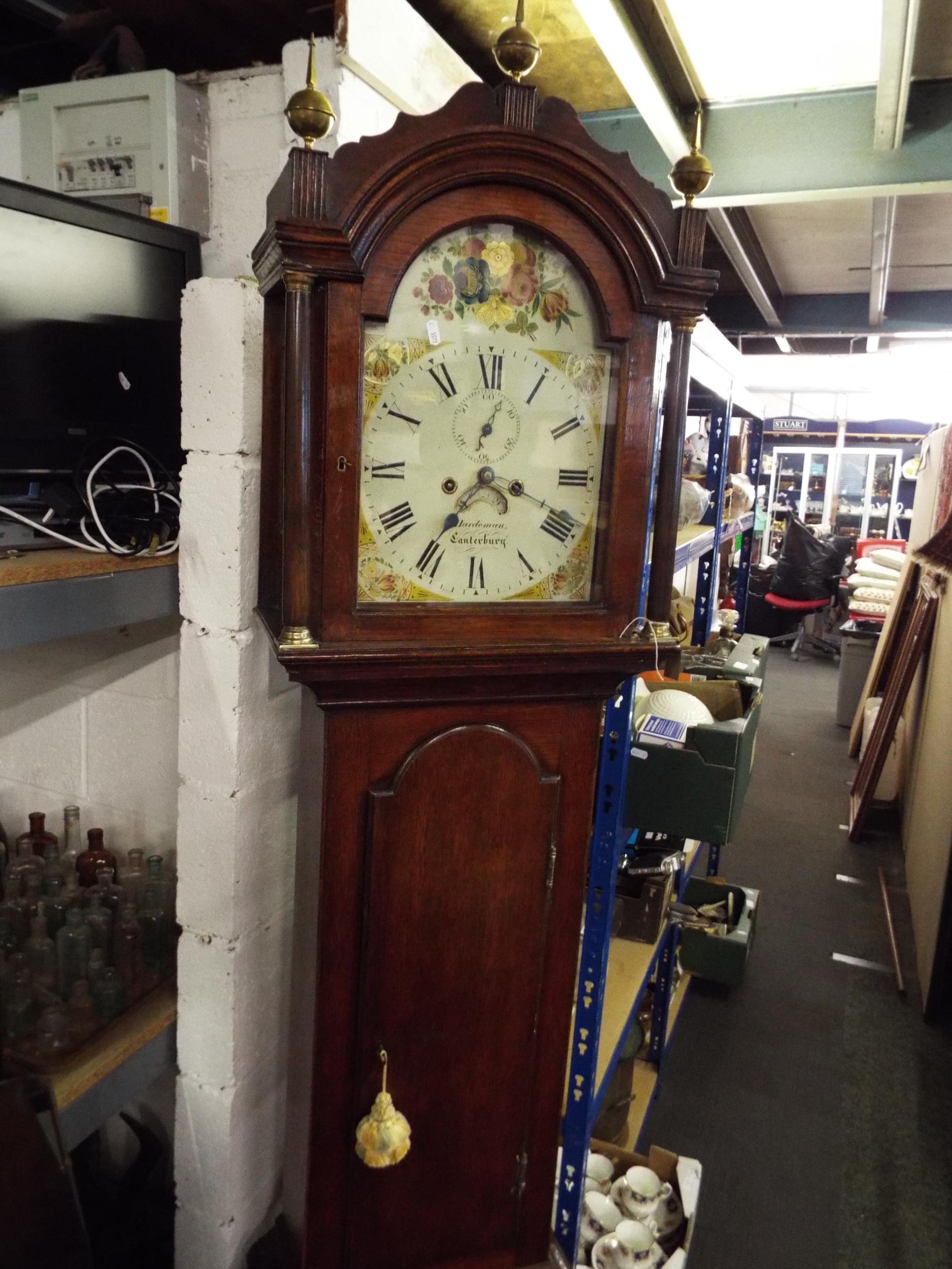 A Victorian oak case Grandfather clock with the hand-painted dial having floral spangles with secondary dial and aperture 'Hardeman Canterbury'
