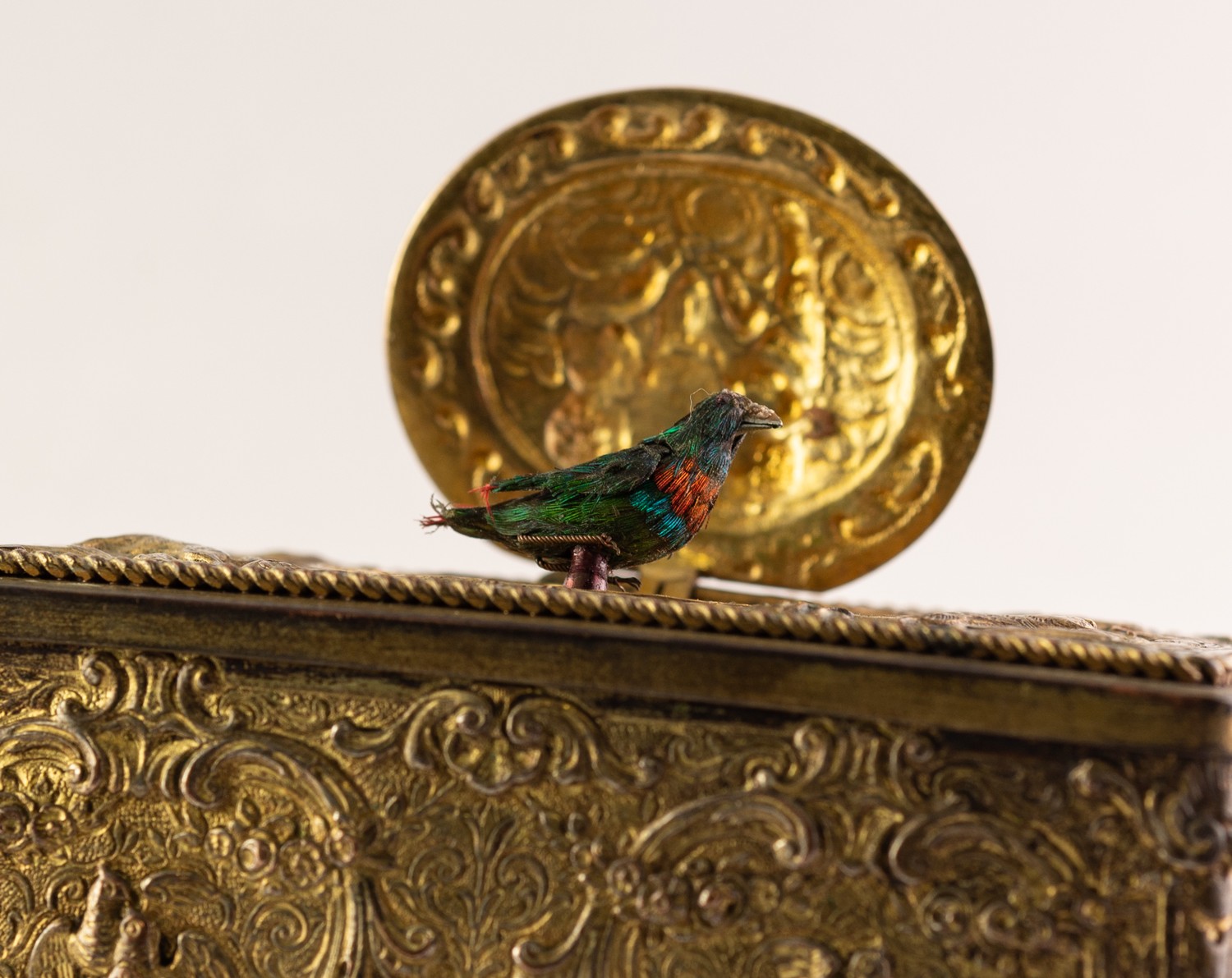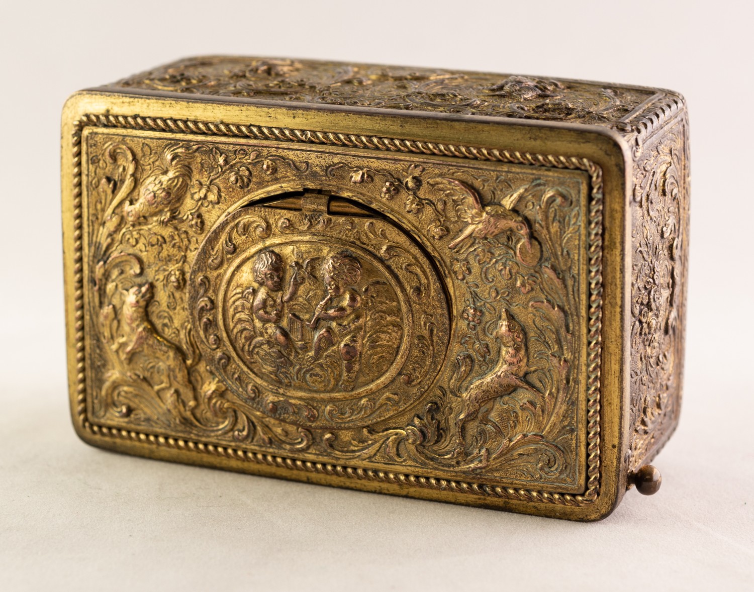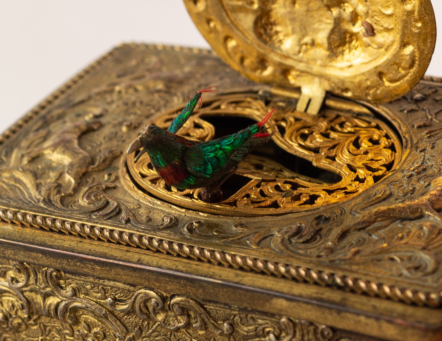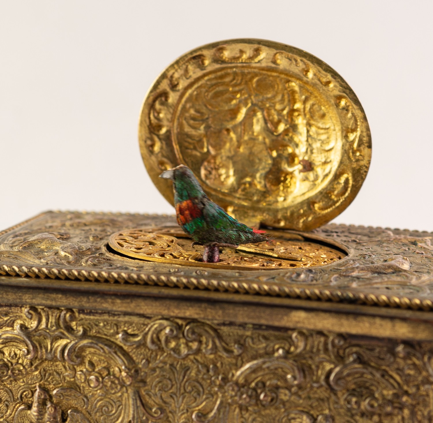 BONTEMS-TYPE SPRING DRIVEN GILT METAL AUTOMATON SINGING BIRD MUSICAL BOX, embossed with foxes and birds within a scroll work setting and cherubs, the opening oval lid, 4in (10cm) wide