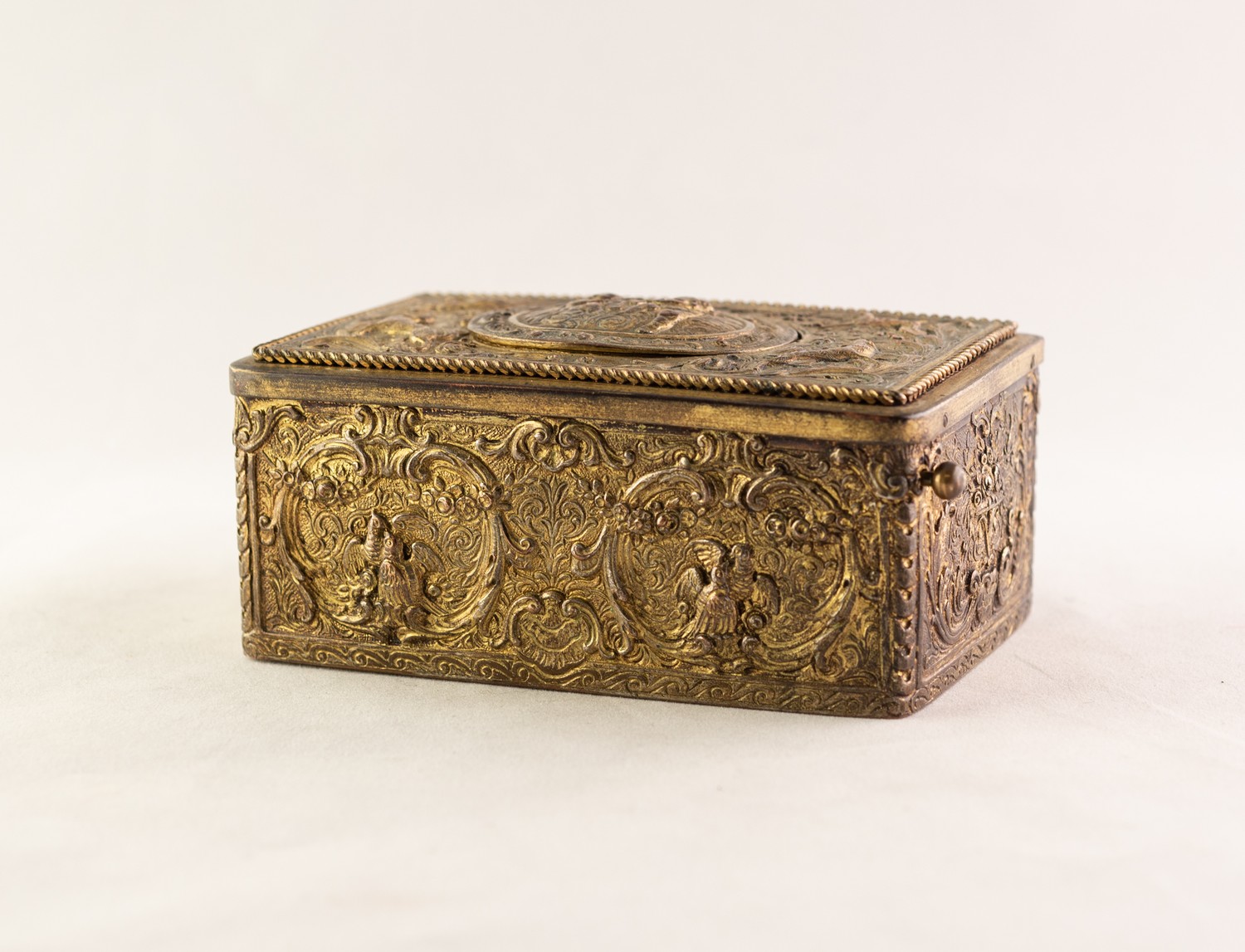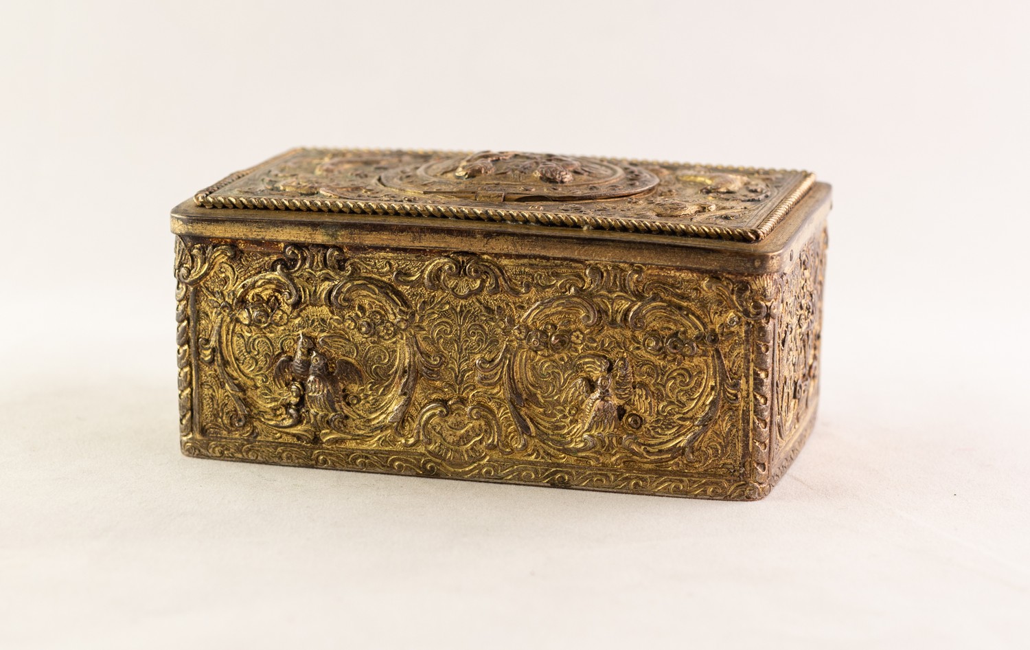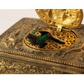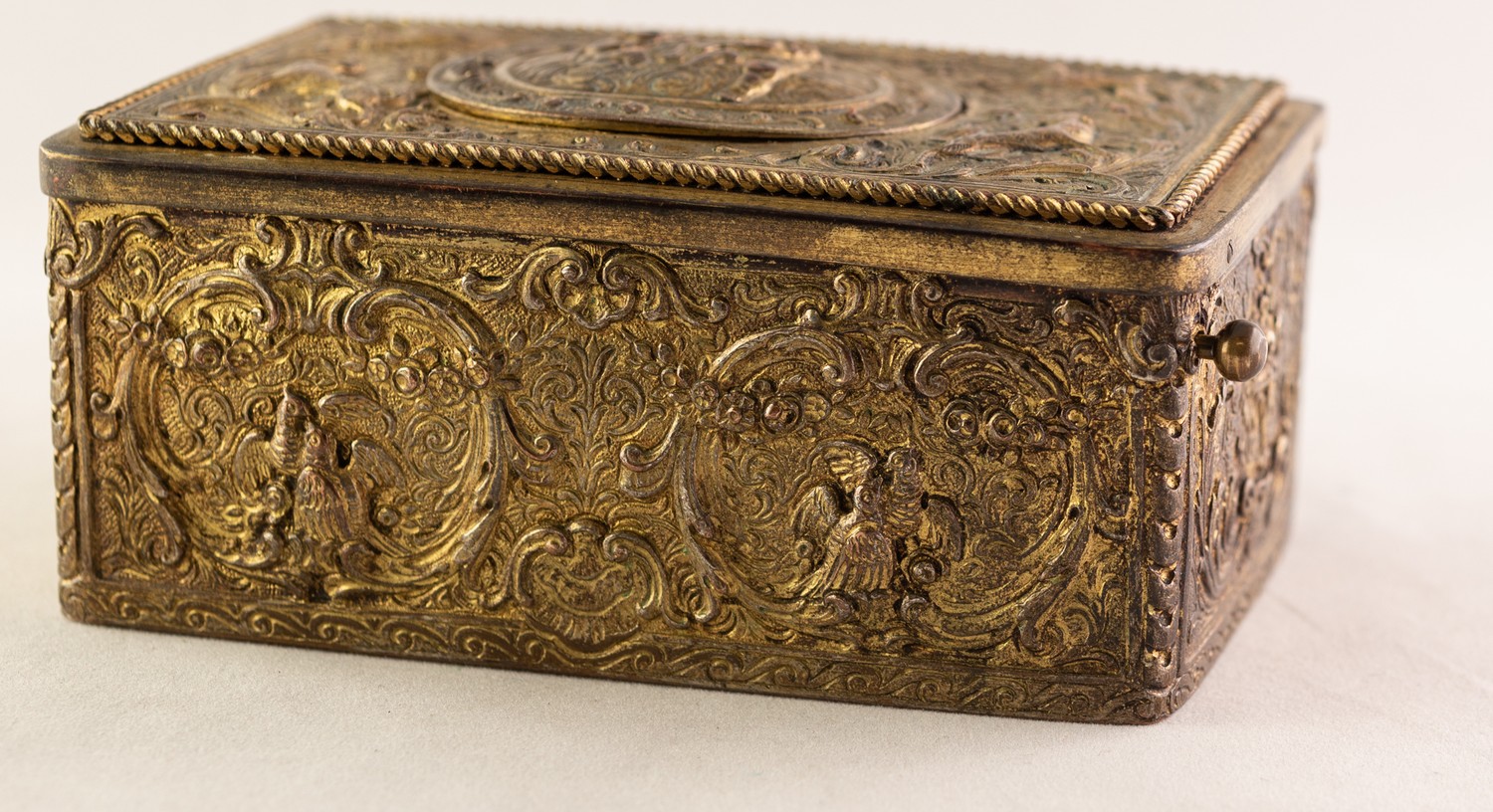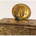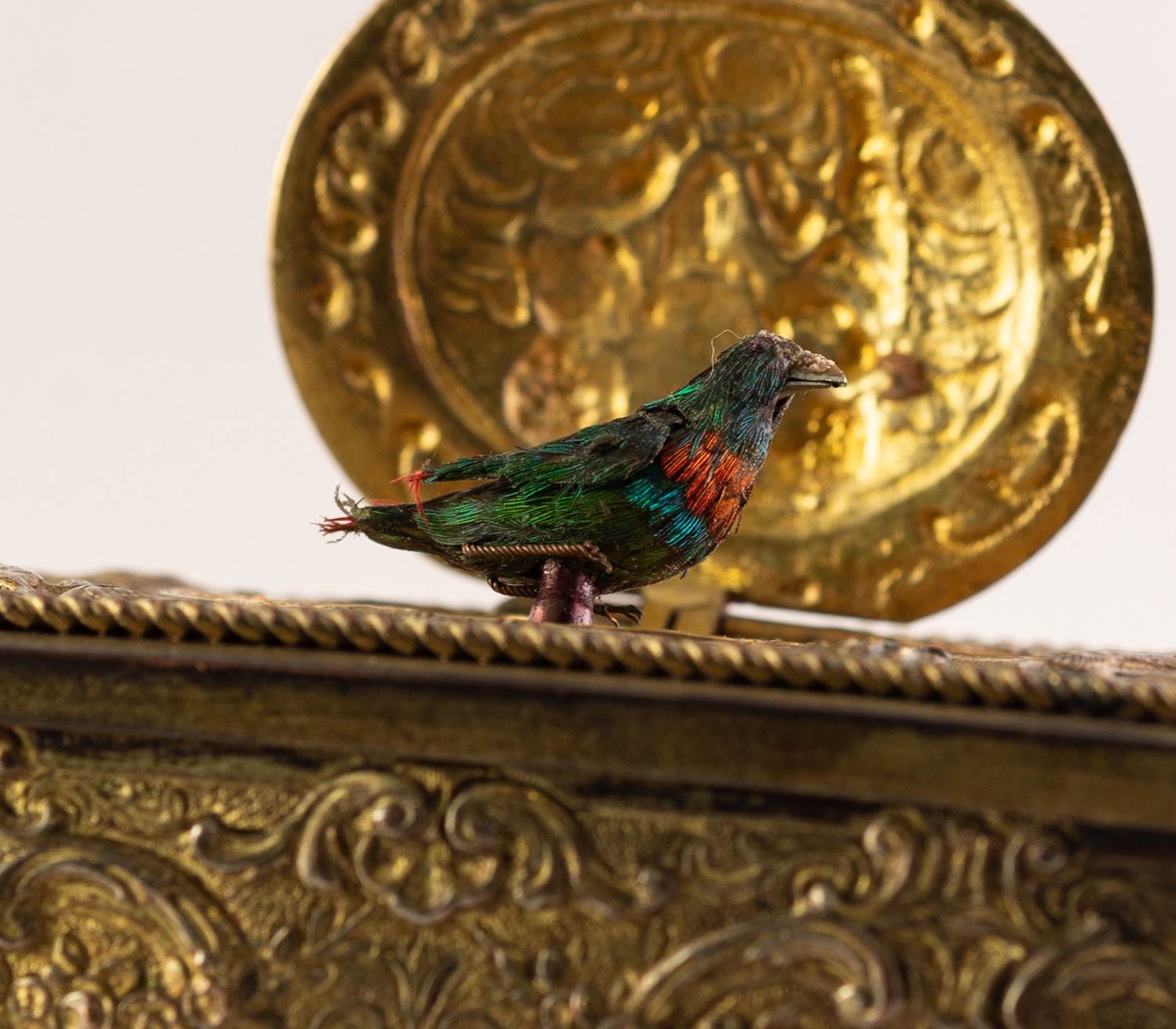 BONTEMS-TYPE SPRING DRIVEN GILT METAL AUTOMATON SINGING BIRD MUSICAL BOX, embossed with foxes and birds within a scroll work setting and cherubs, the opening oval lid, 4in (10cm) wide