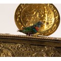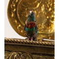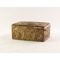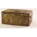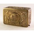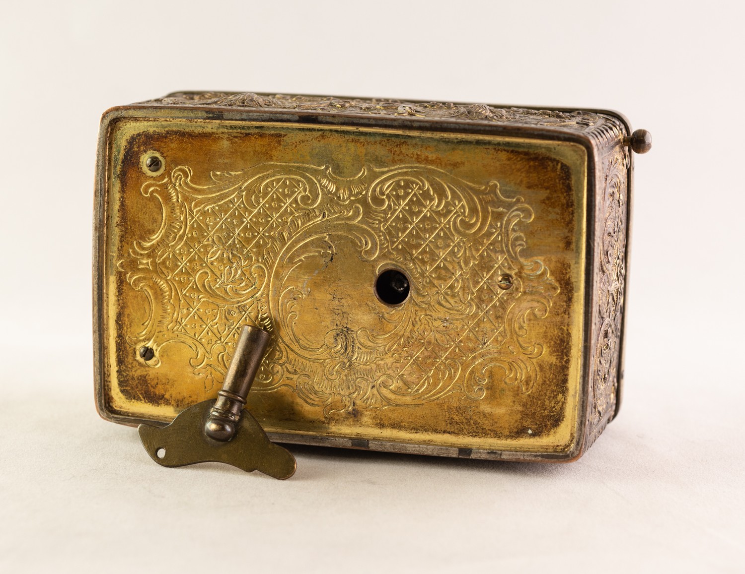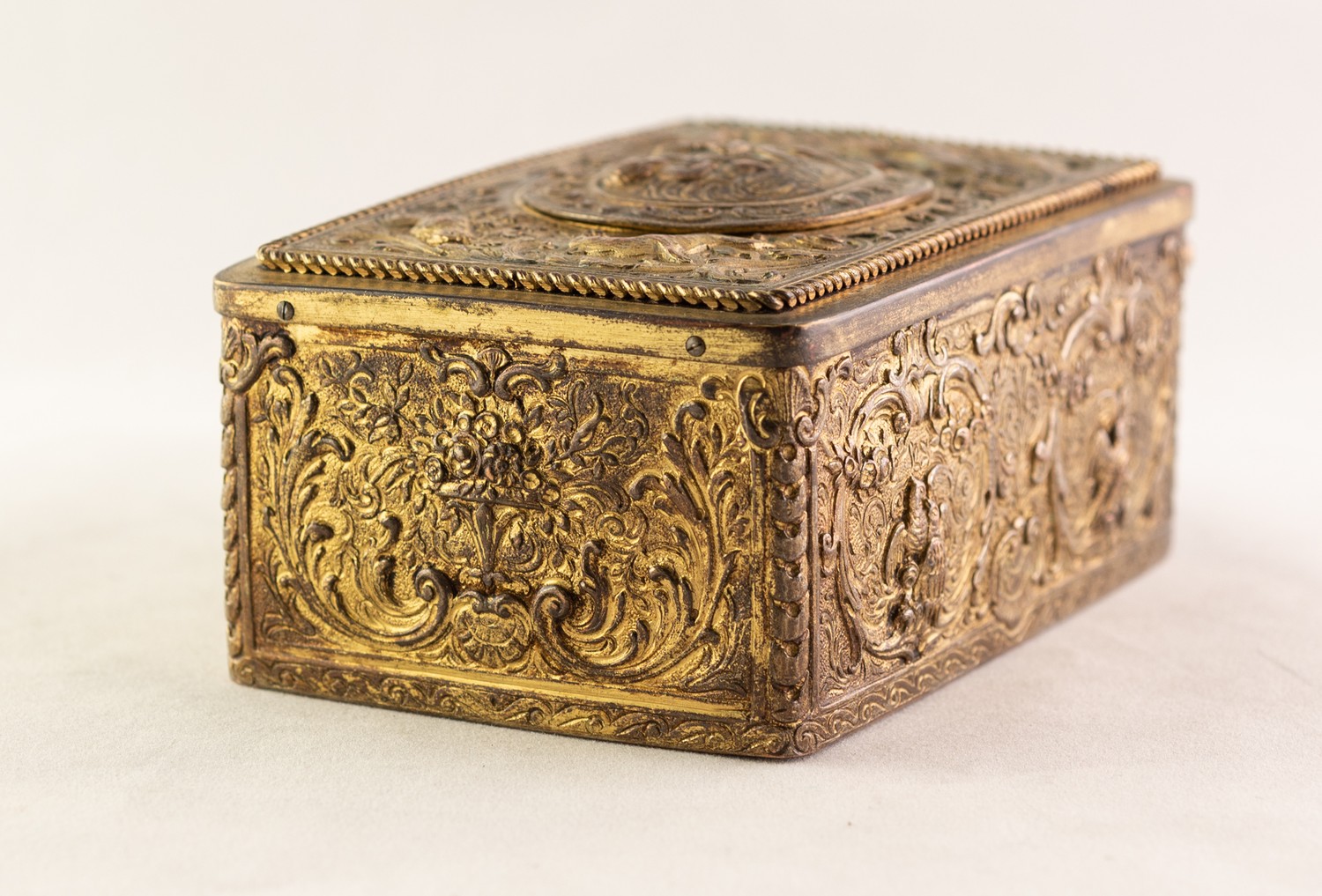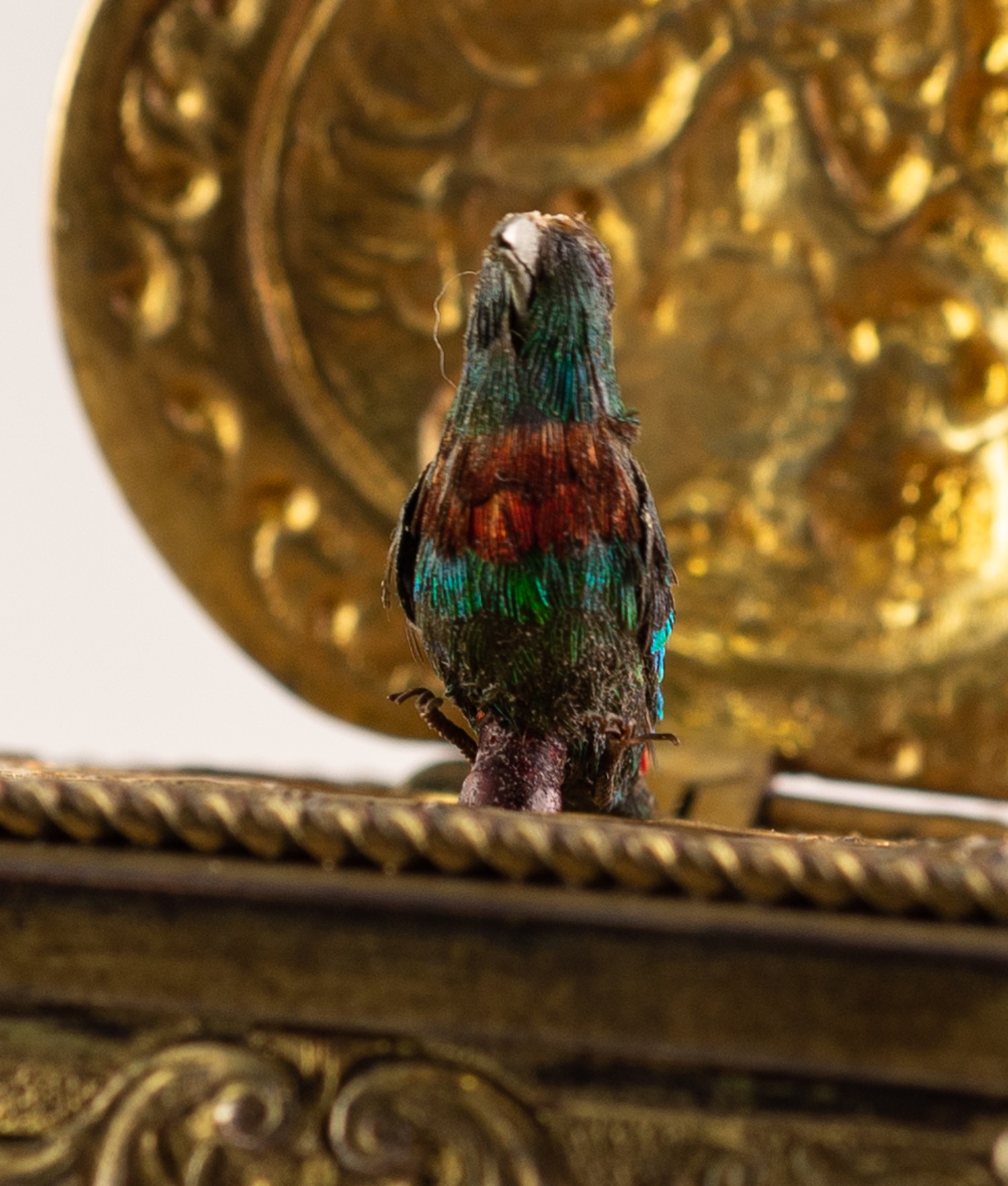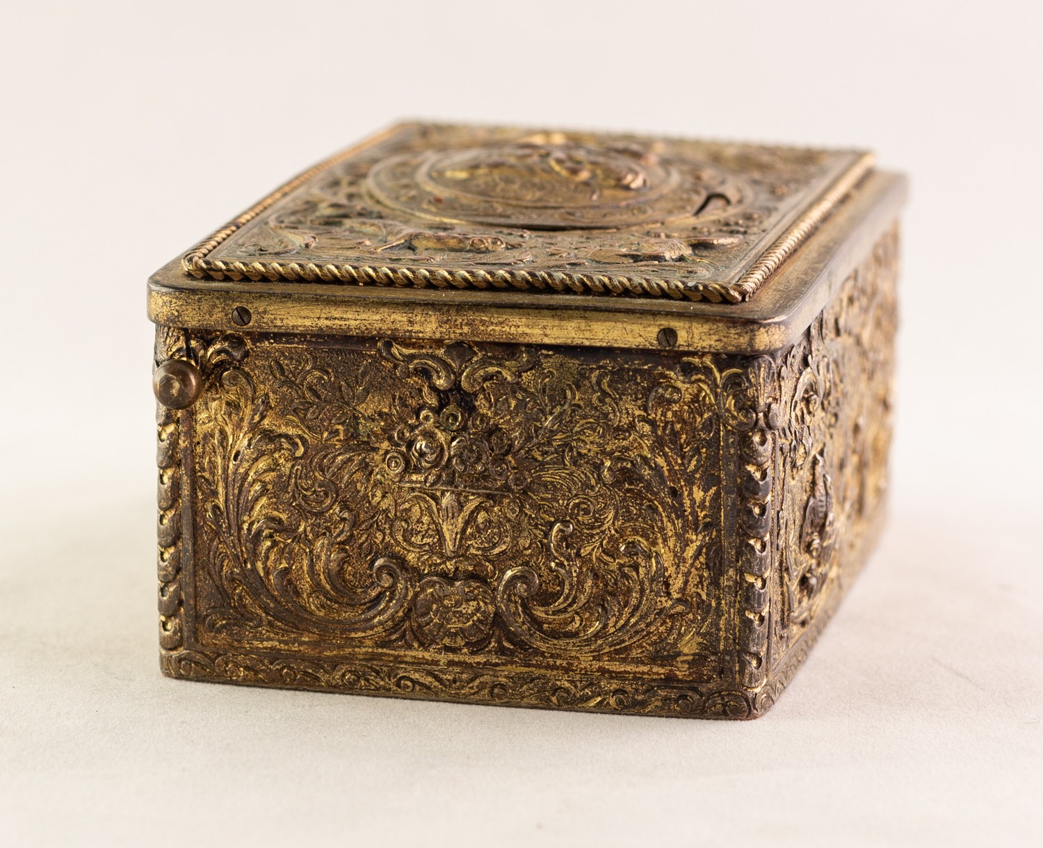 BONTEMS-TYPE SPRING DRIVEN GILT METAL AUTOMATON SINGING BIRD MUSICAL BOX, embossed with foxes and birds within a scroll work setting and cherubs, the opening oval lid, 4in (10cm) wide