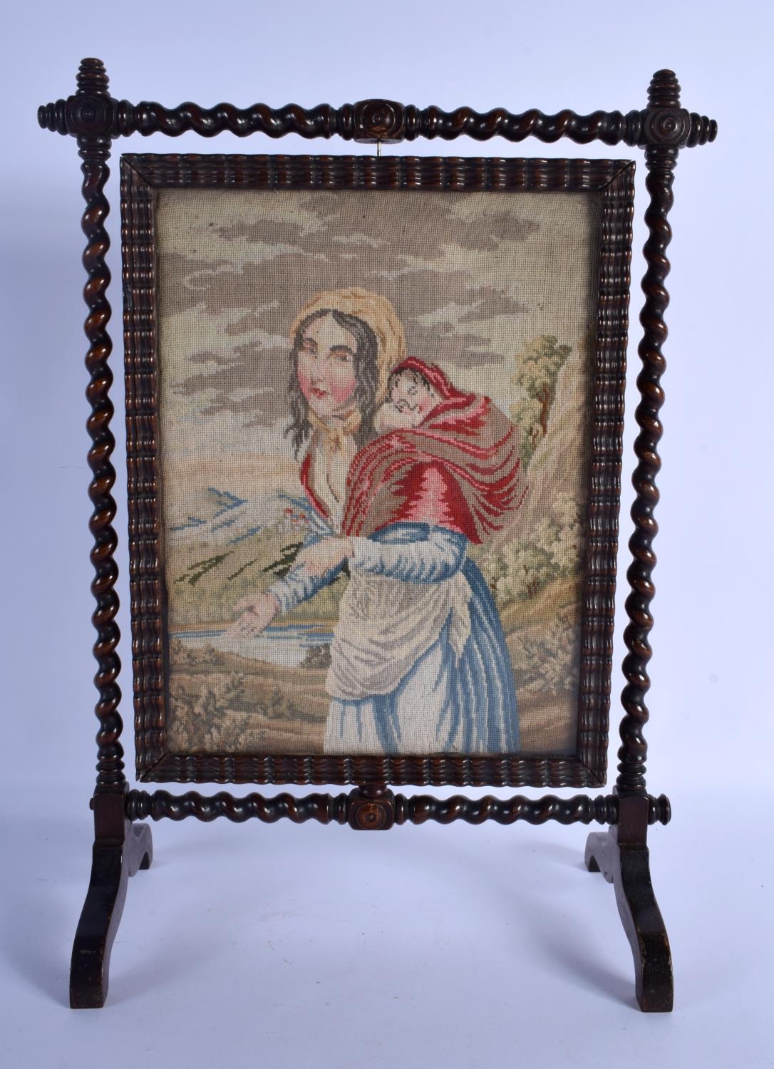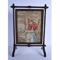 AN UNUSUAL AESTHETIC MOVEMENT REVOLVING EMBROIDERED SCREEN with turned wood supports. 38 cm x 24 cm.
