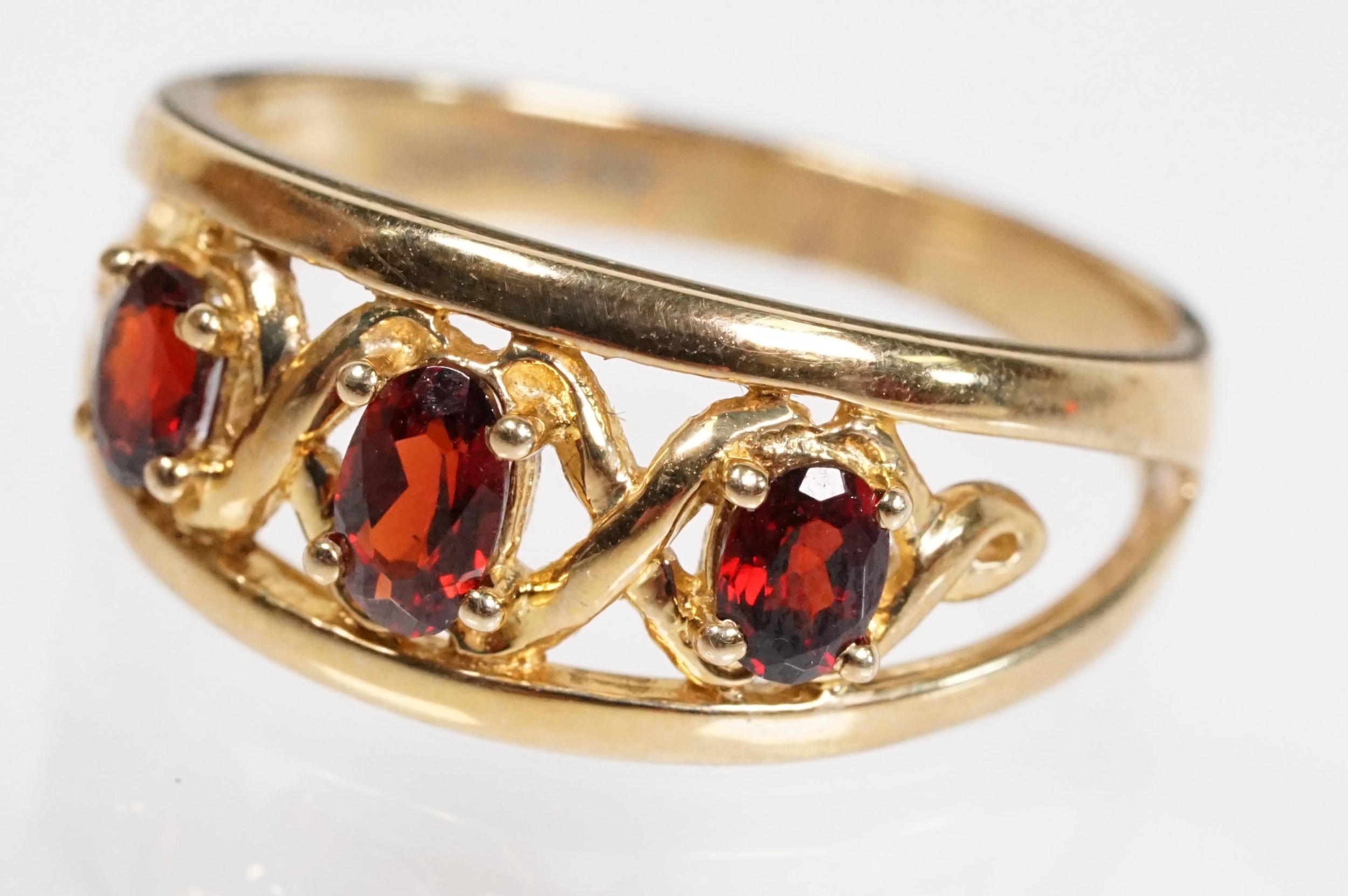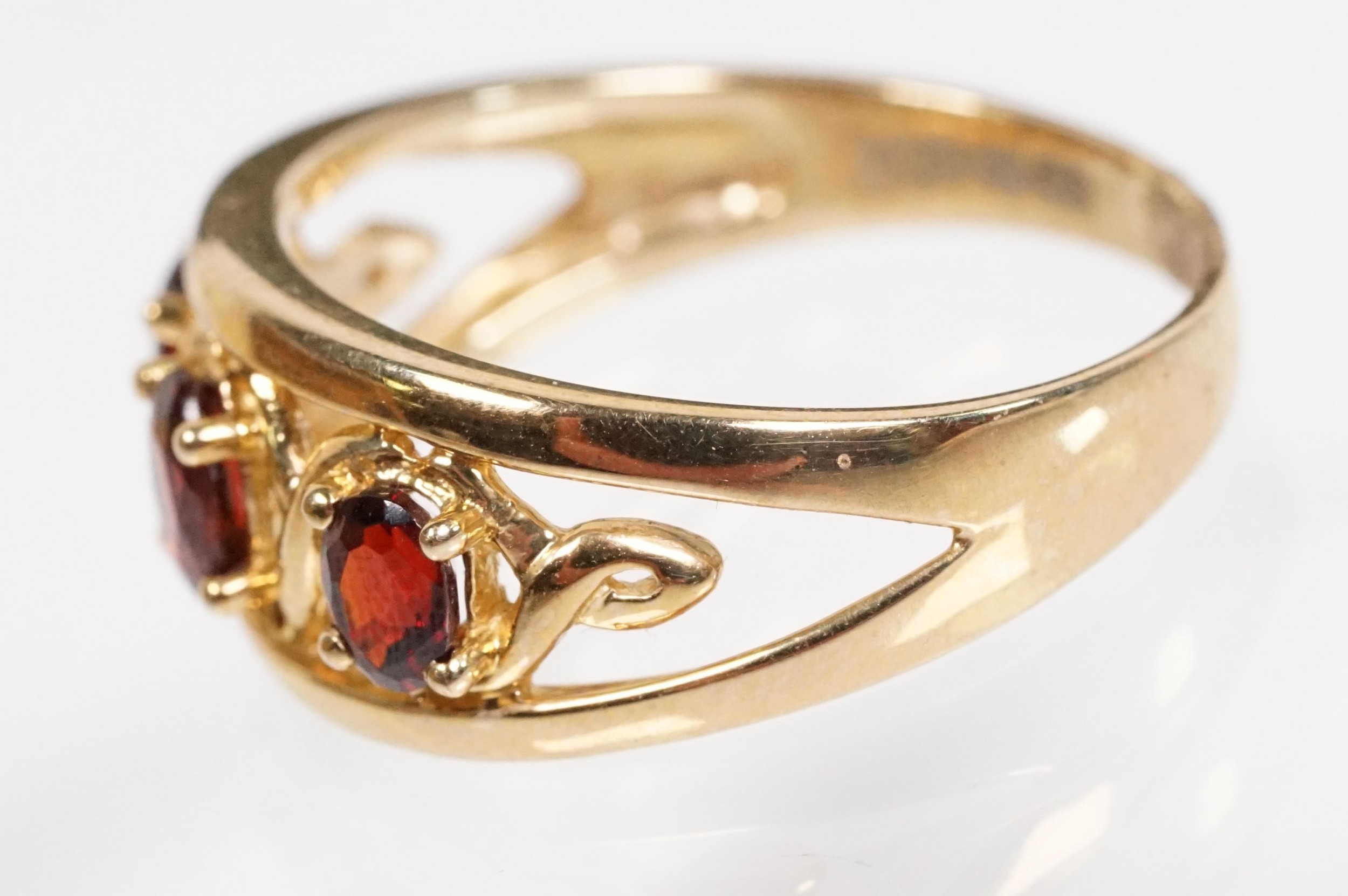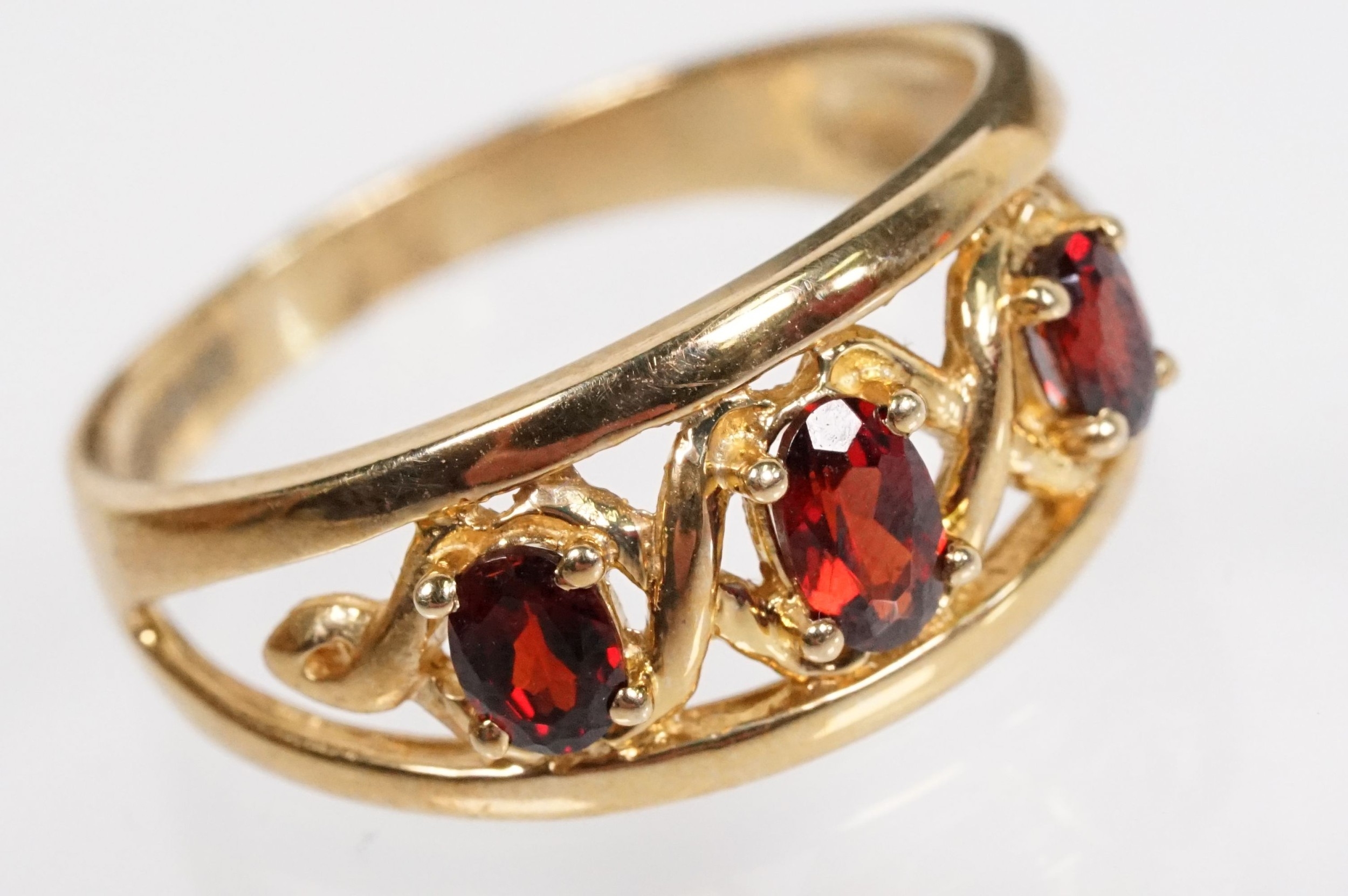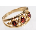 9ct gold and garnet three stone ring being set with three oval cut garnets in a pierced mount setting. Hallmarked Sheffield to shank. Size N.
