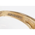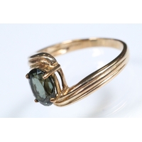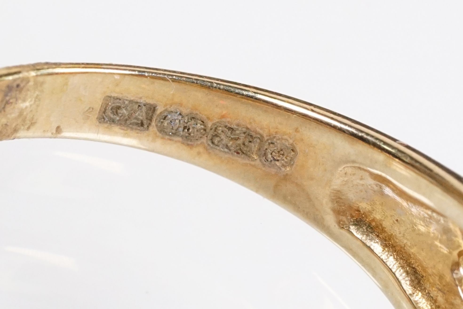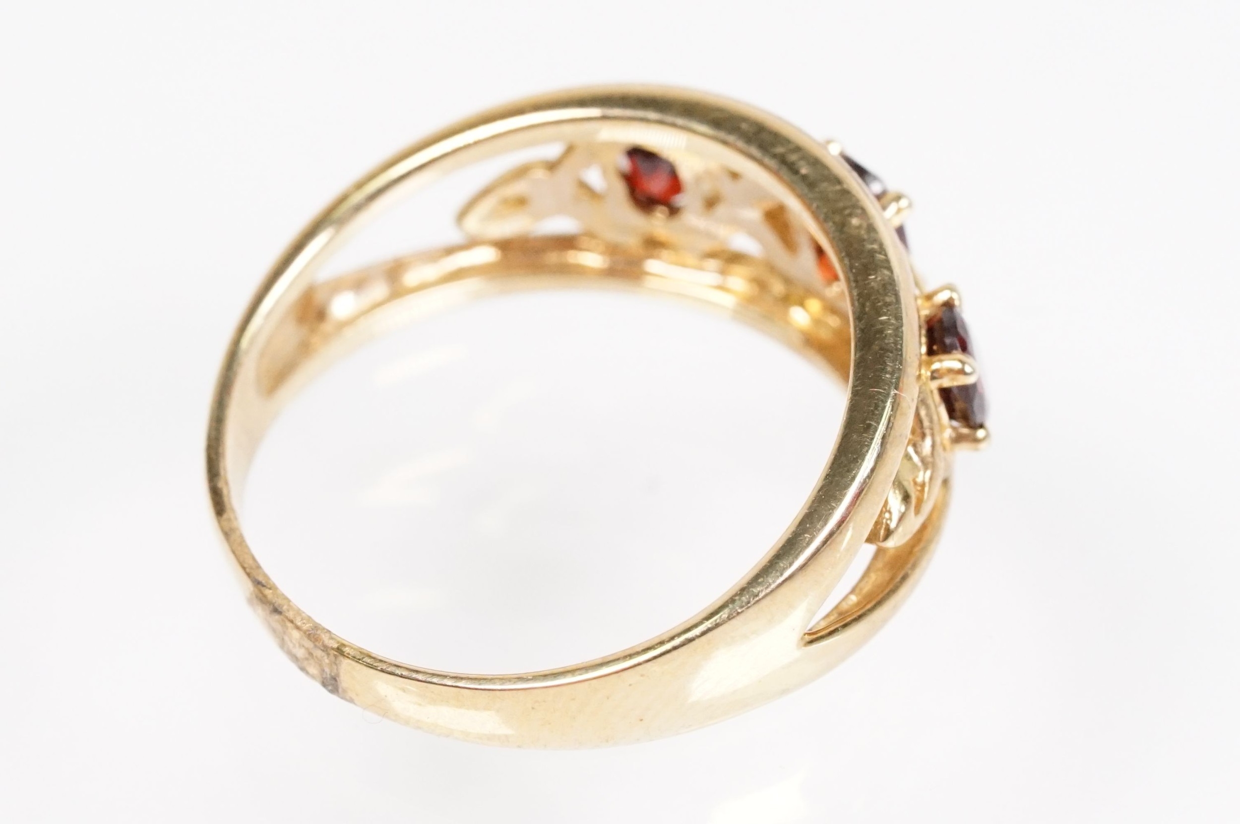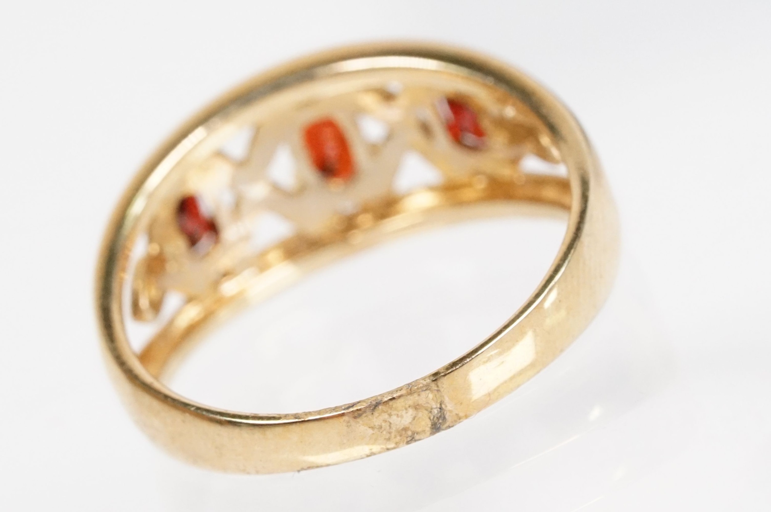 9ct gold and garnet three stone ring being set with three oval cut garnets in a pierced mount setting. Hallmarked Sheffield to shank. Size N.