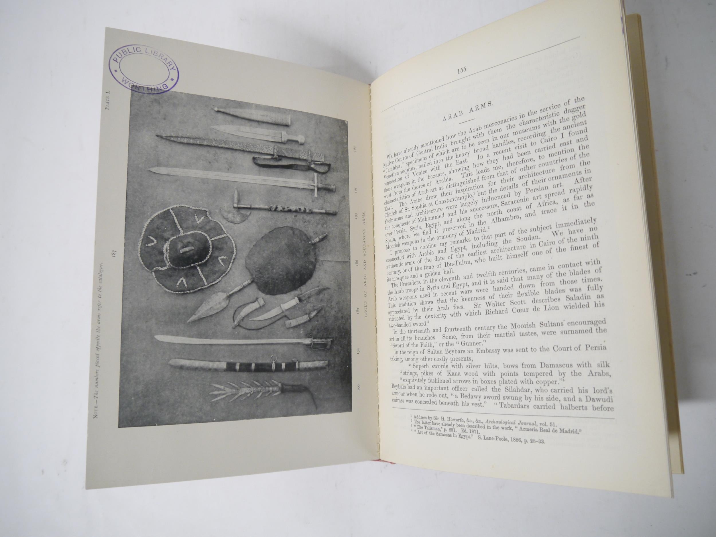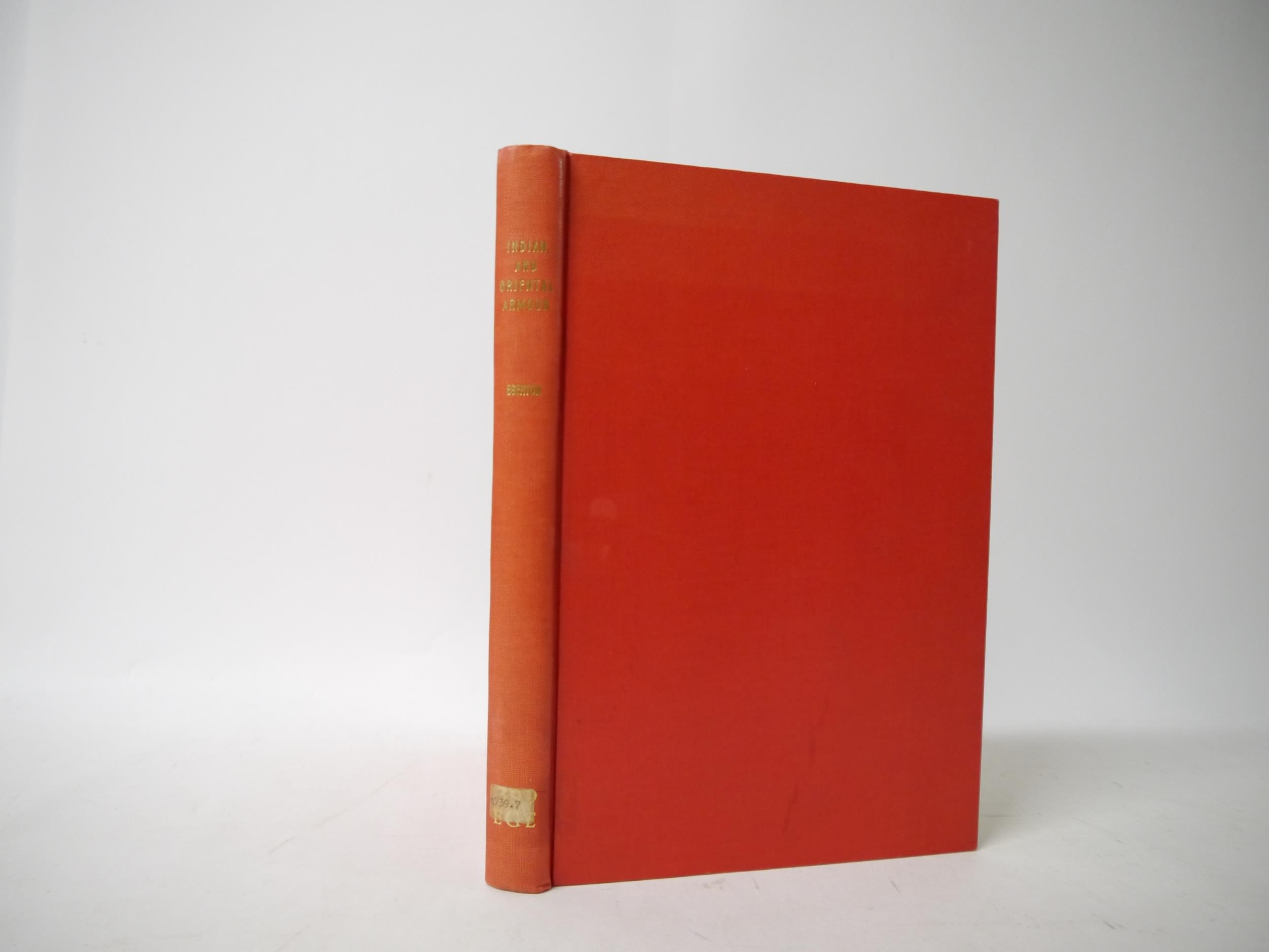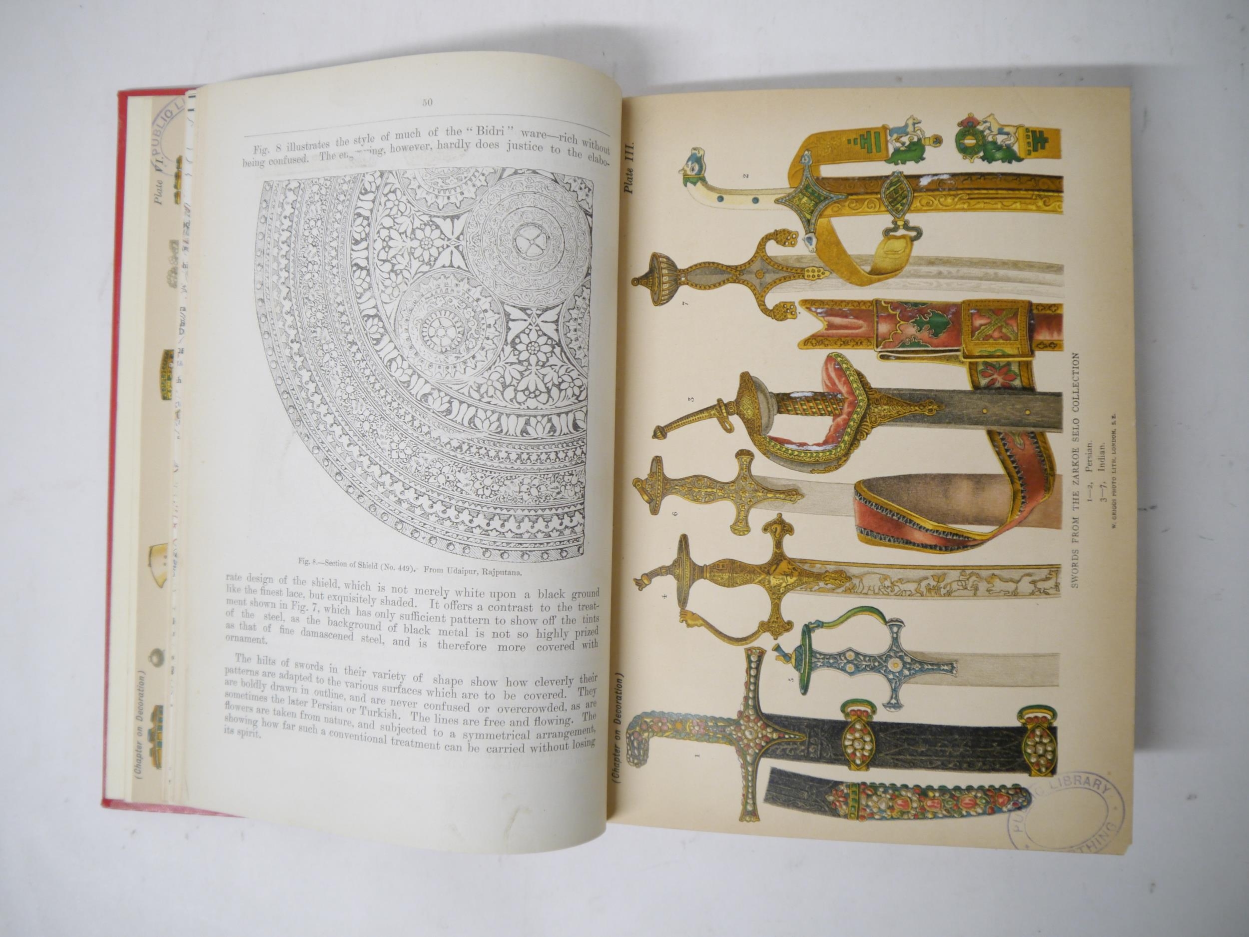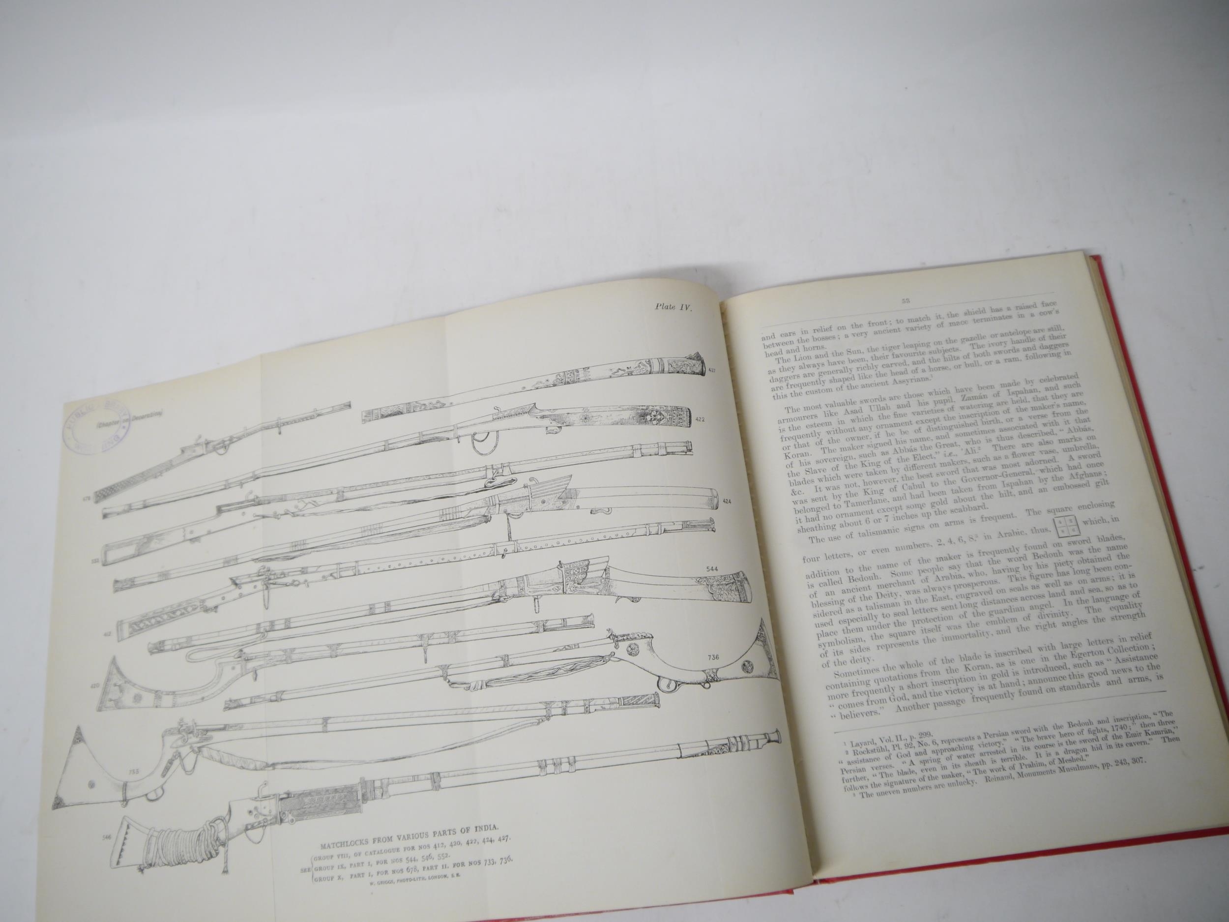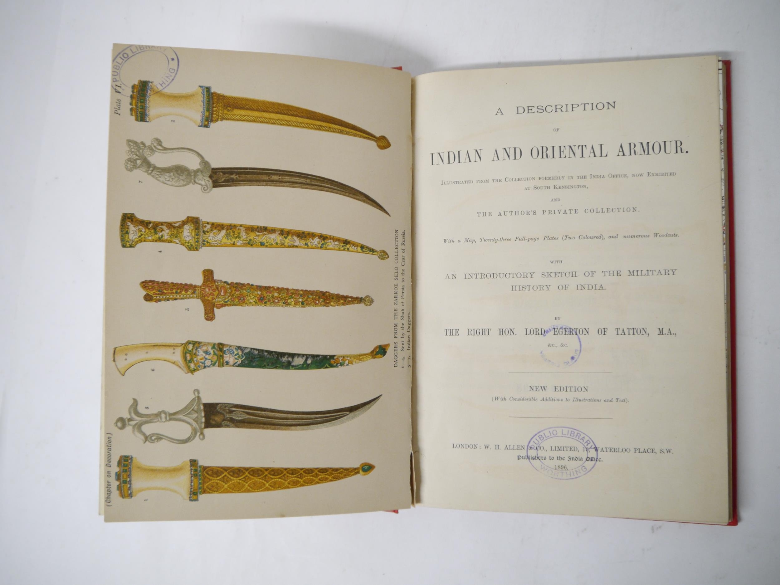 (India.) The Right Hon. Lord Egerton of Tatton: 'A Description of Indian and Oriental Armour, illustrated from the collection formerly in the India Office, now exhibited at South Kensington and the author's private collection : with an introductory sketch of the military history of India', London, W.H. Allen & Co, 1896, coloured folding map, 2 coloured plates, plus 22 further black & white plates (several folding) as called for (plates depicting Punjab arms and armour, and drawings of swords, matchlocks and helmets including an Akali turban with quoits,) ex library, viii,178pp, rebound 20th Century cloth gilt. Scarce