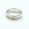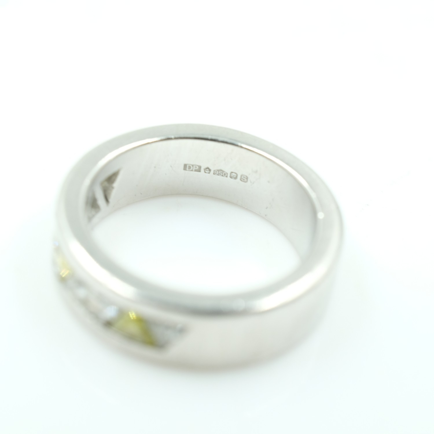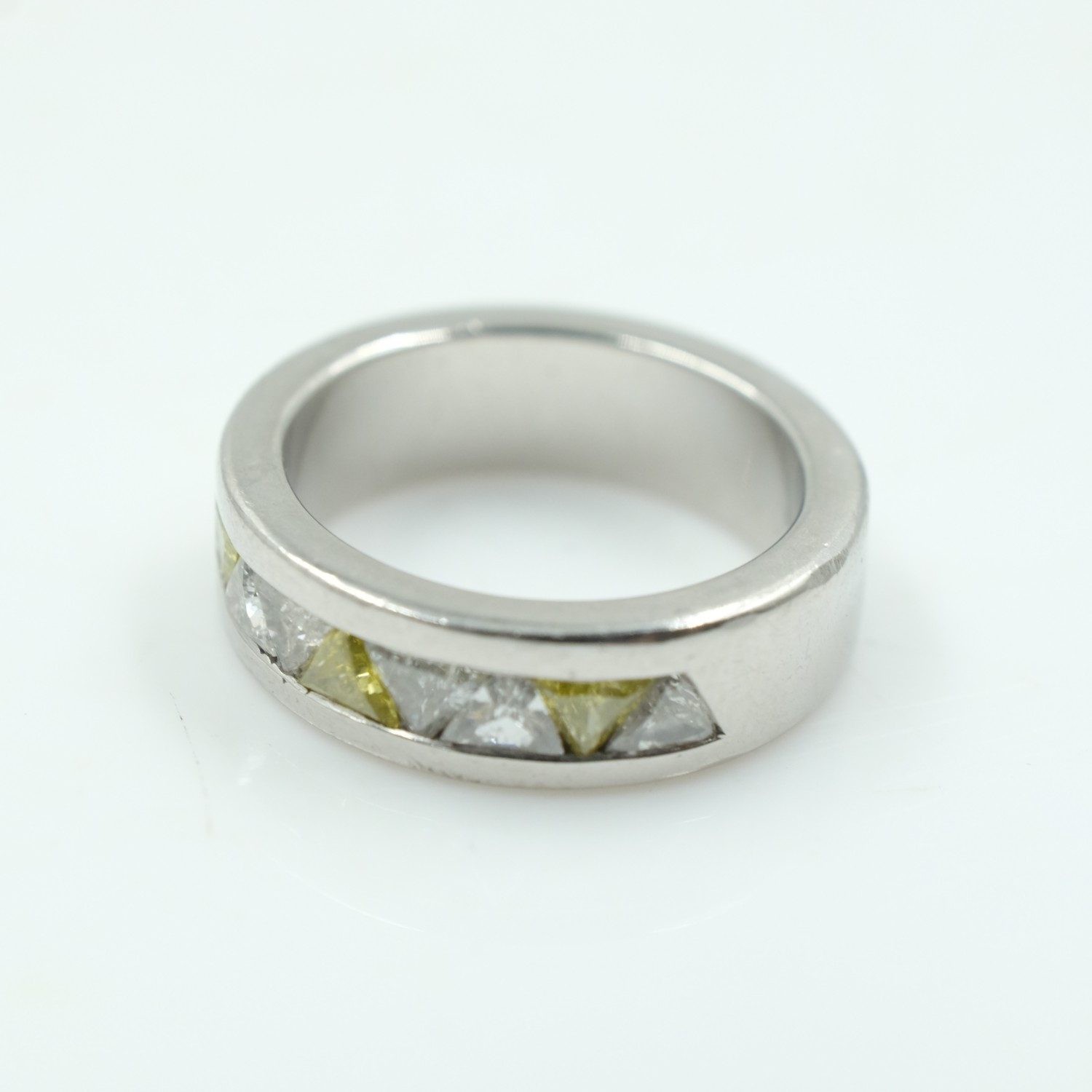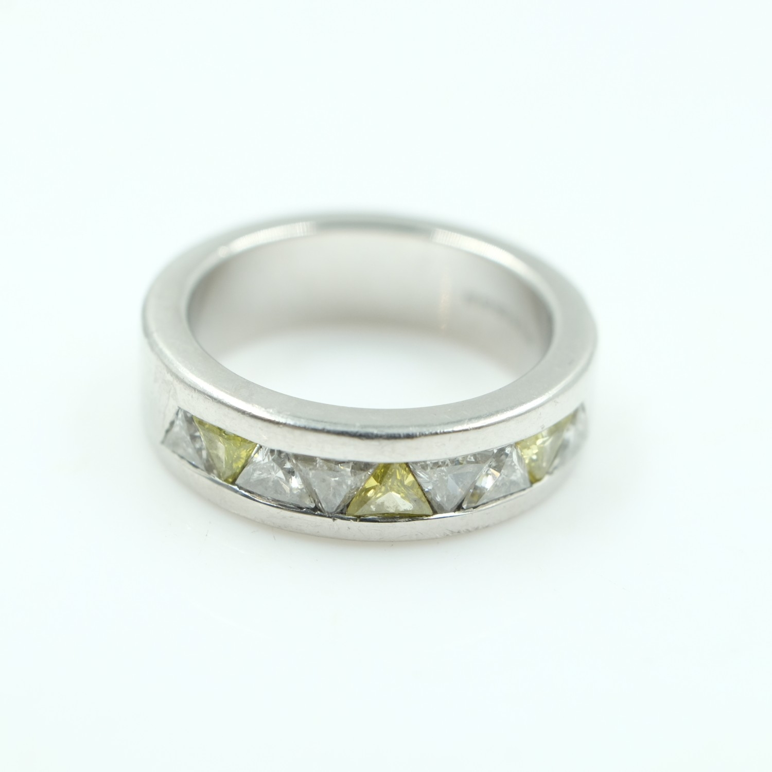 Heavy hallmarked platinum and trillion cut white and yellow diamond half eternity ring, size I/J, 11.5g. UK P&P Group 0 (£7+VAT for the first lot and £1+VAT for subsequent lots)