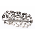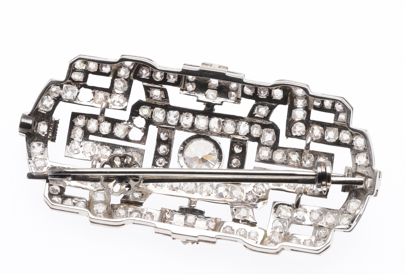 AN ART DECO DIAMOND PLAQUE BROOCH PENDANT. the rectangular-shaped openwork mount collet set with a circular old-cut diamond and overall with graduated cushion-shaped diamonds, with detachable brooch fitting, 5.6cm wide, 13 grams.