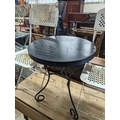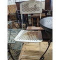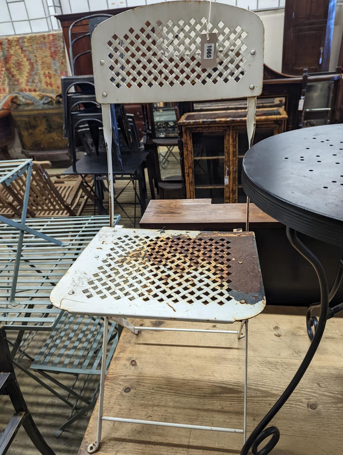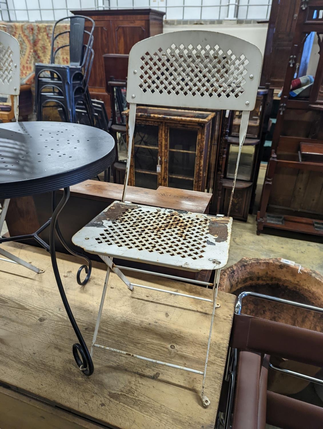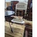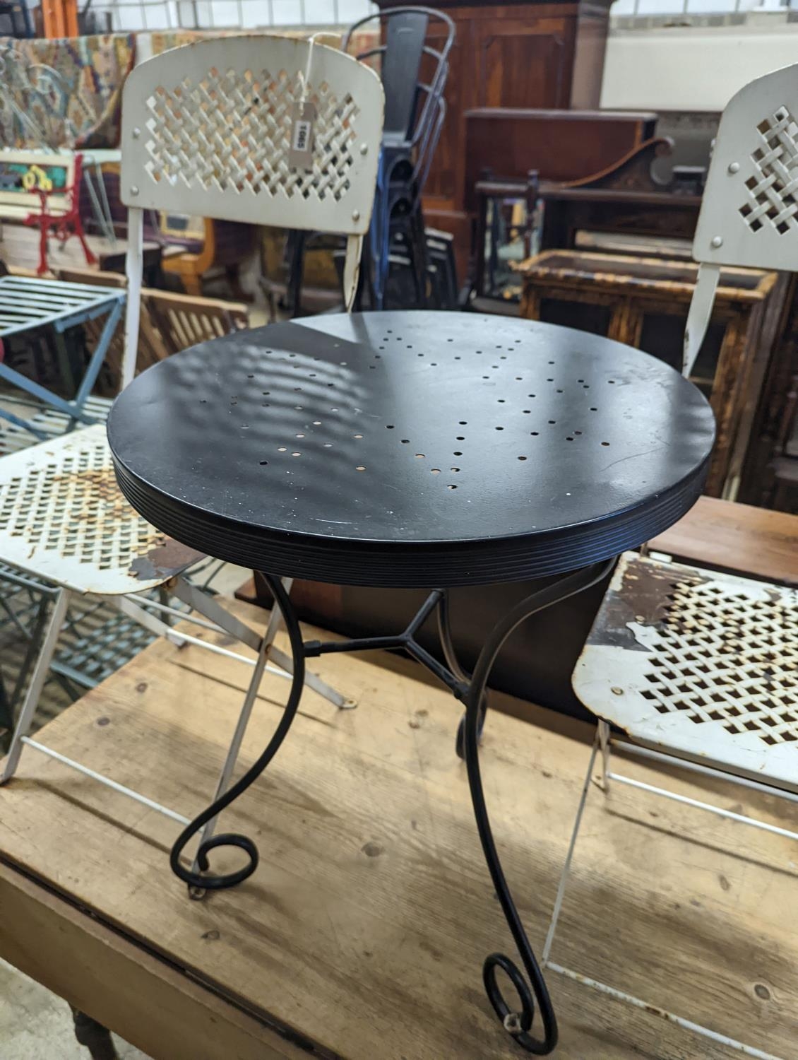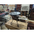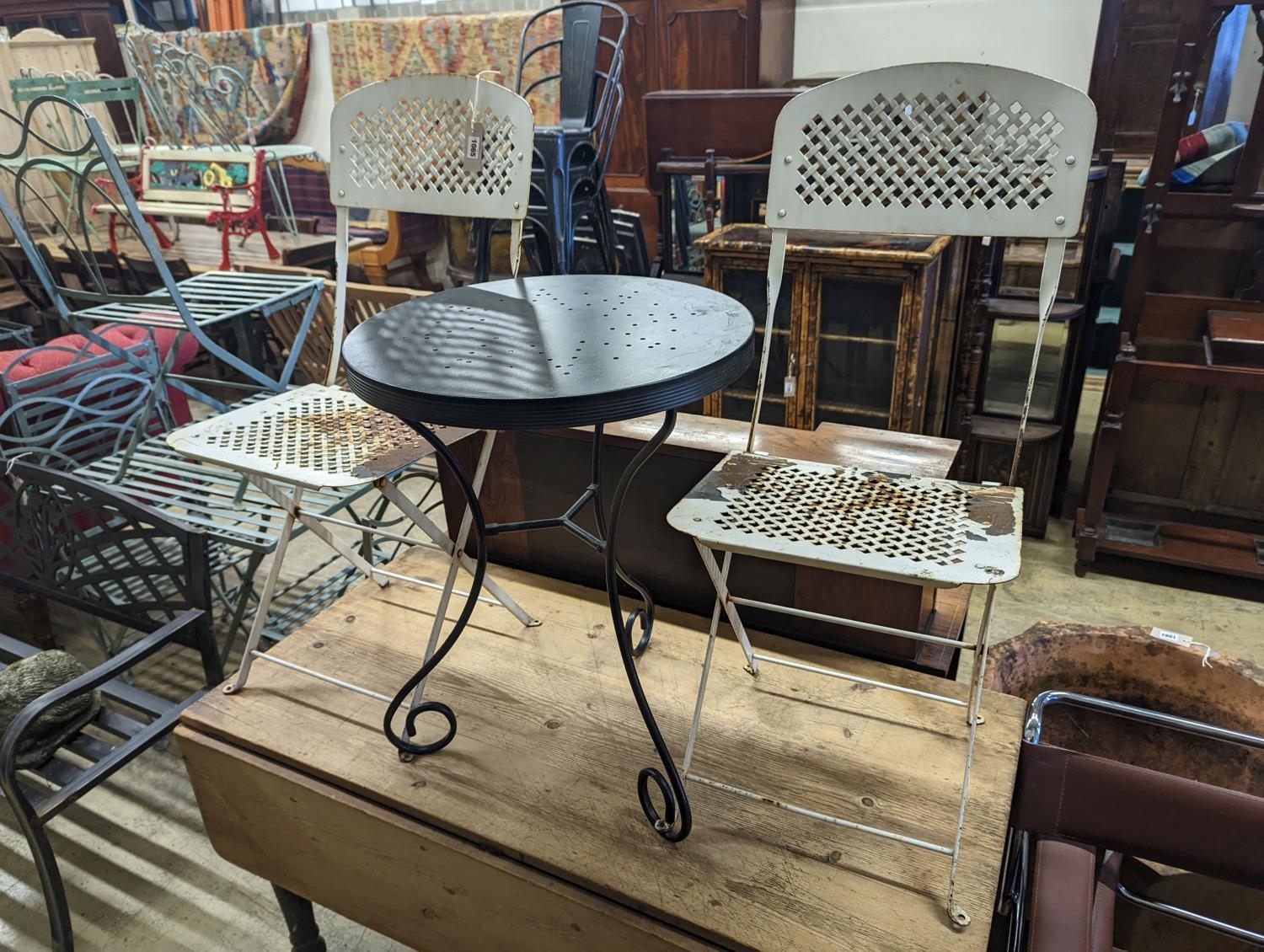 A circular metal bistro table, diameter 49cm, height 65cm and two chairs