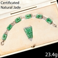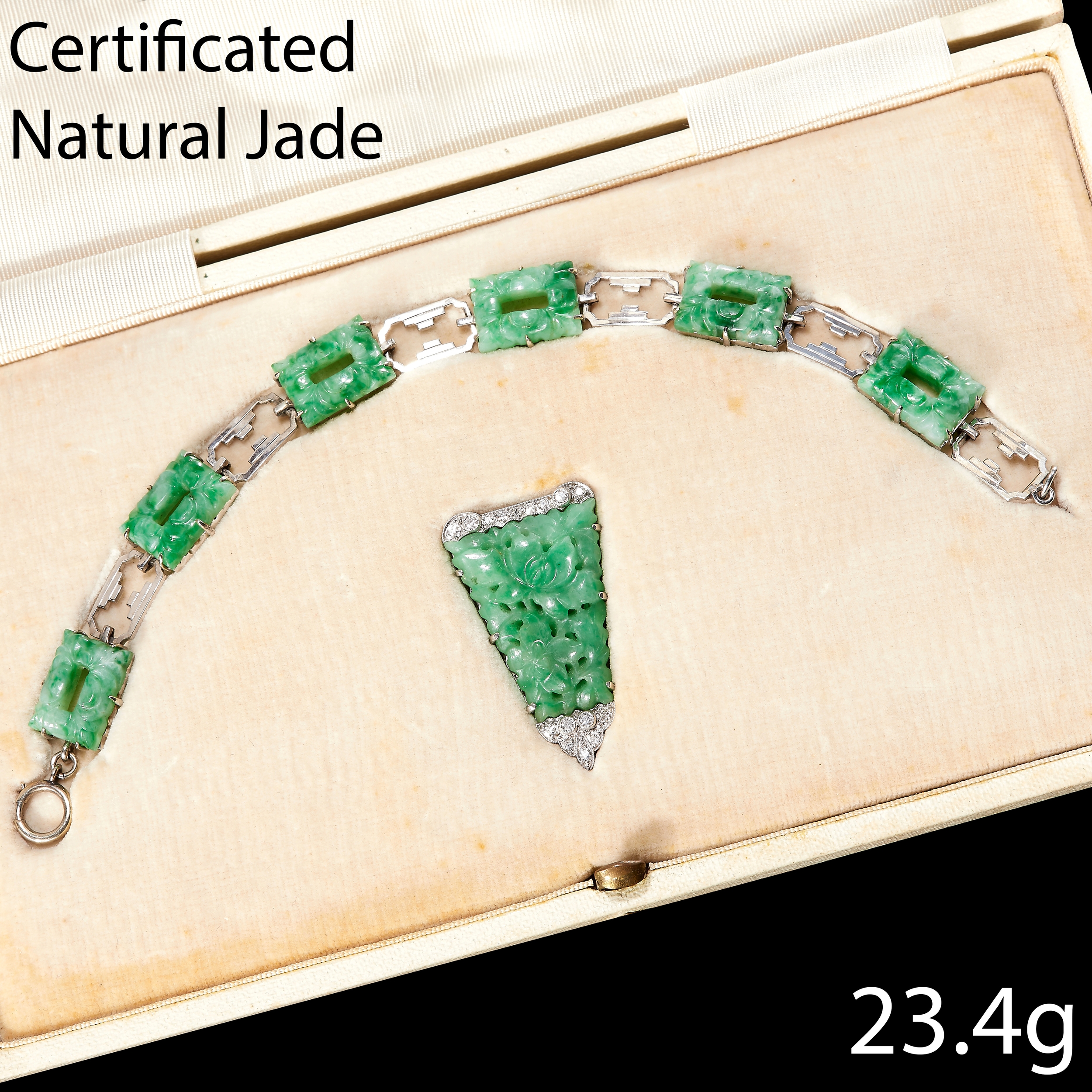 CERTIFICATED ART-DECO JADE AND DIAMOND CLIP BROOCH AND JADE BRACELET, The clip accentuated with diamonds. L. clip 3.5 cm. L. bracelet 17 cm. 23.4 grams. In fitted box. Accompanied by GCS Report No 5783-3146 and 5783-3140 stating that the jade is Natural green jadeite jade, No indication of impregnation.