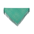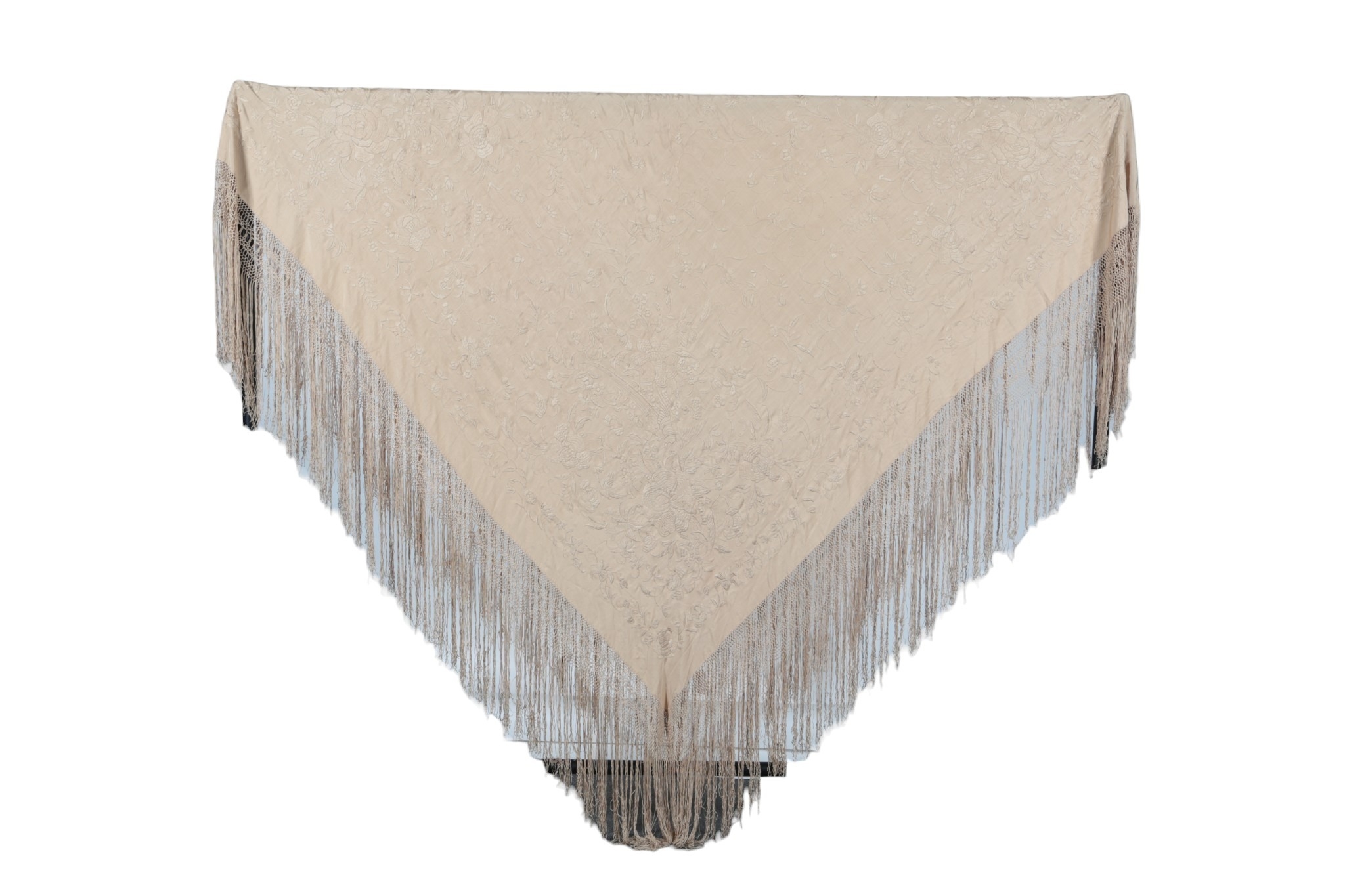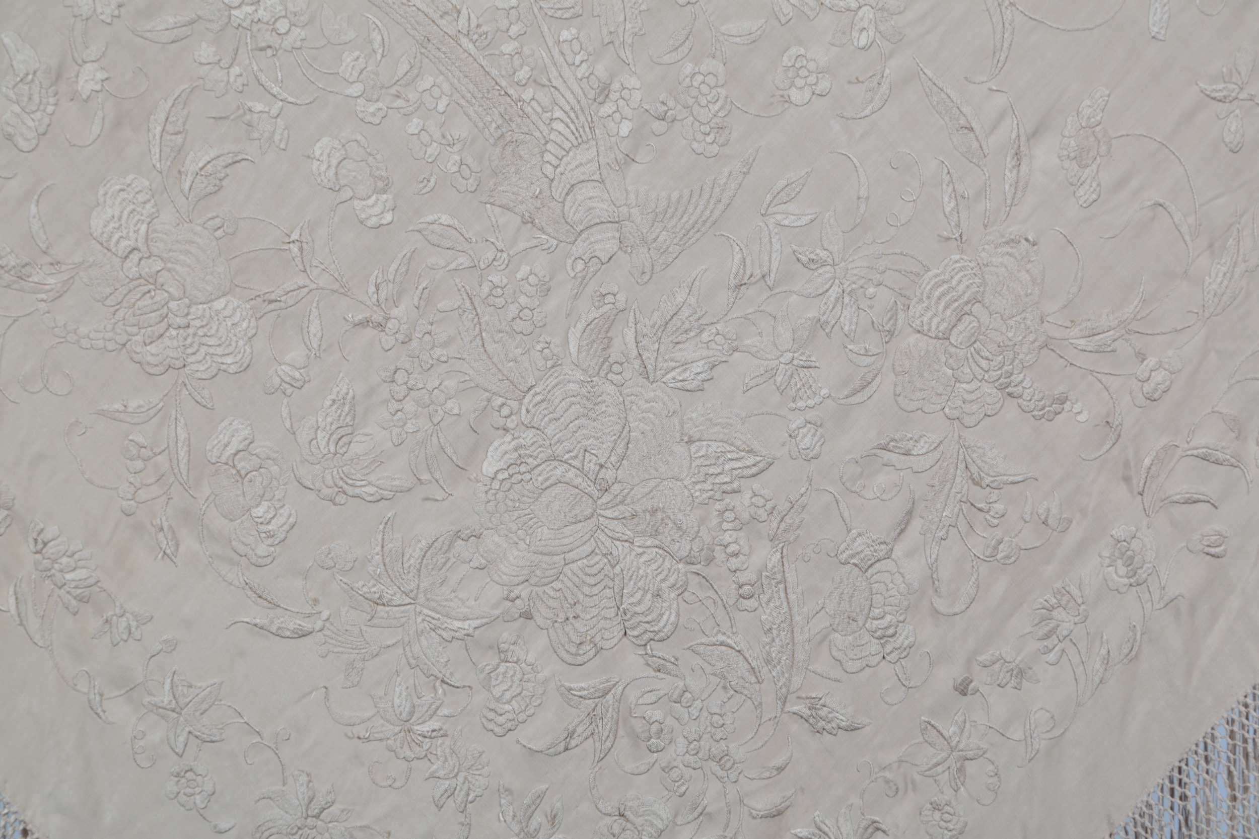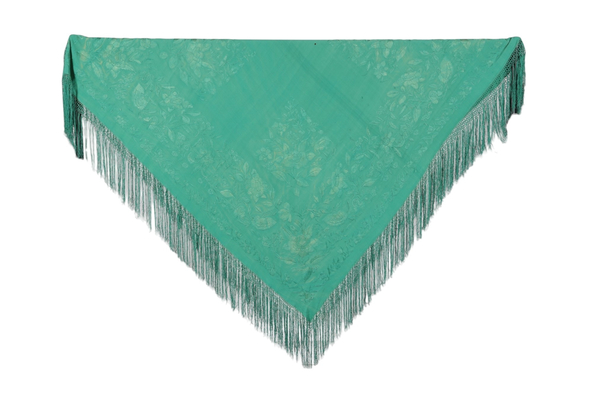 Two large 19th century Chinese silk crepe shawls, one jade green with a jade green floral embroidered border and deep silk fringe, 164cm square and a similar light beige silk crepe shawl with all over beige embroidery and a silk fringe, 164cm square.