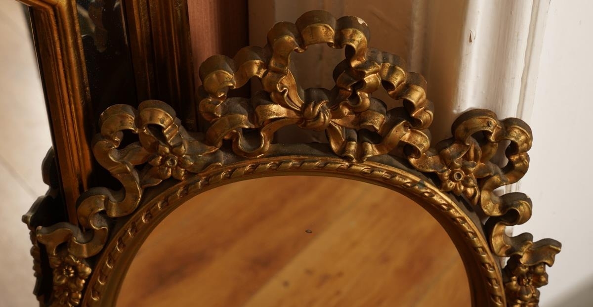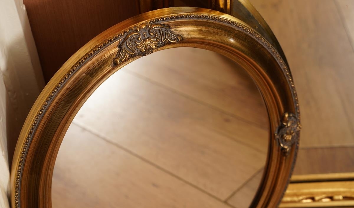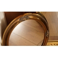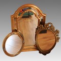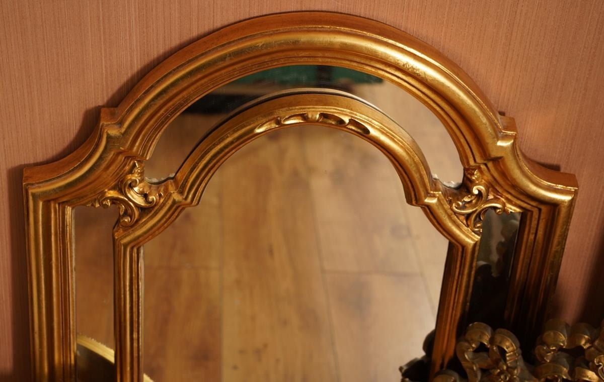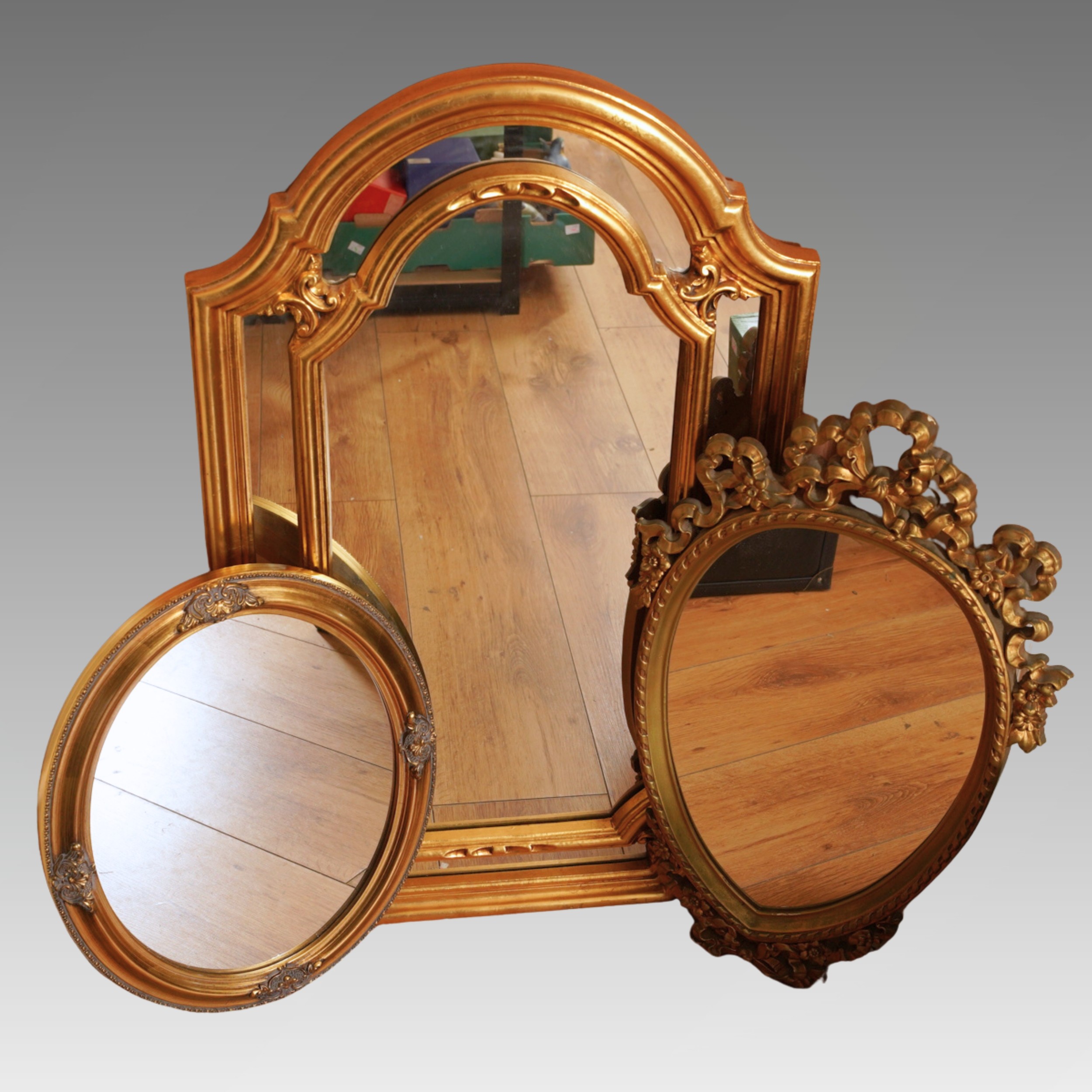 Three modern gilt framed wall mirrors, the largest of arched form with inner gilt divisions, overall measurements height 86cm x width 50.5cm approx, one with ribbons moulded top and bottom, approx height 63cm overall and a smaller oval mirror (3)