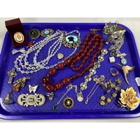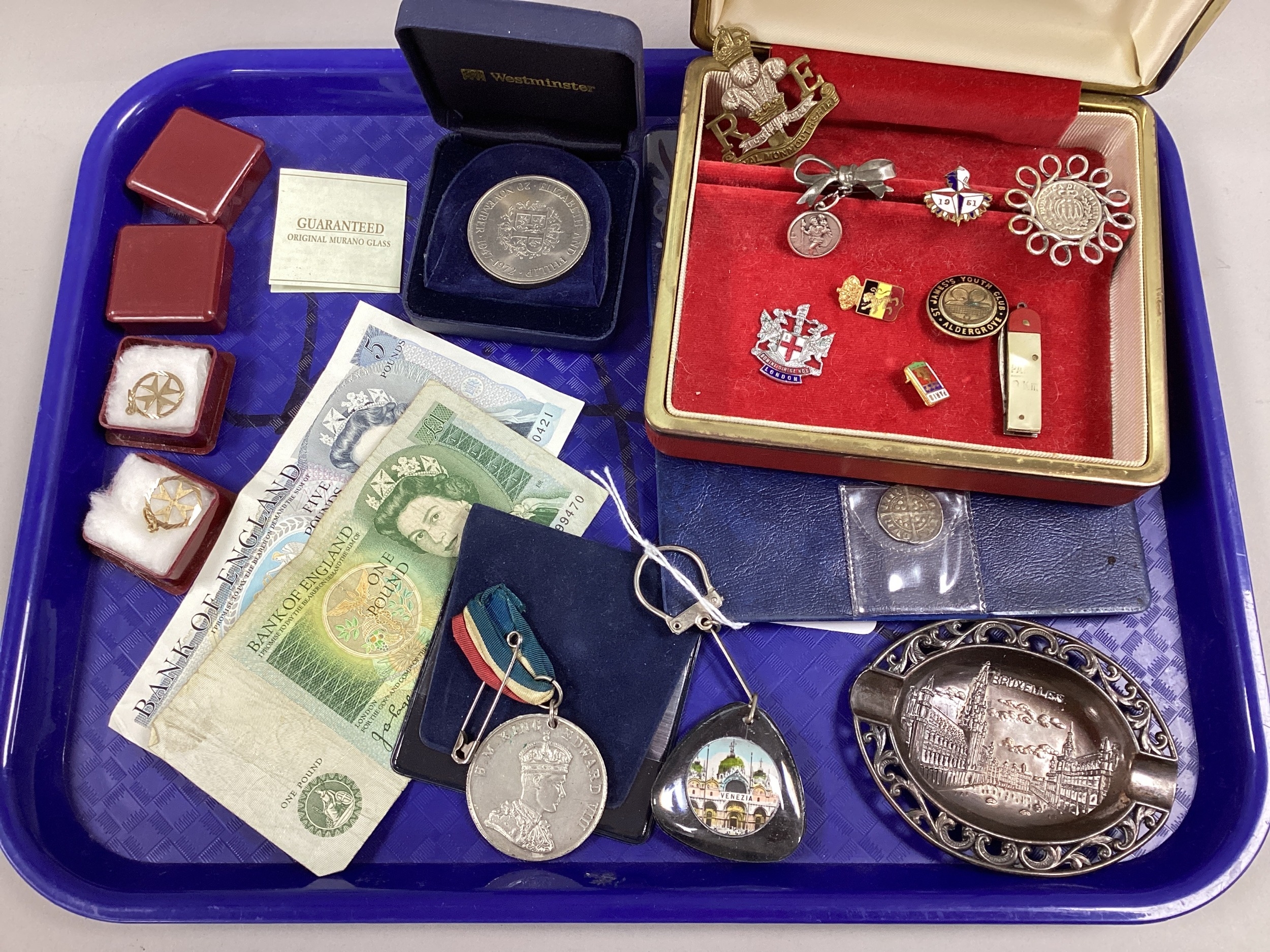 Royal Monmouthshire Cap Badge, 1951 Festival of Britain enamel badge, banknotes, Maltese Cross pendants, vintage Brussels souvenir ashtray etc :- One Tray
