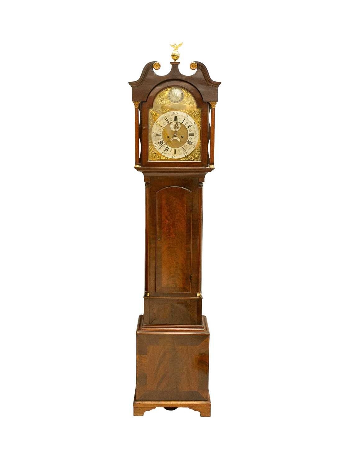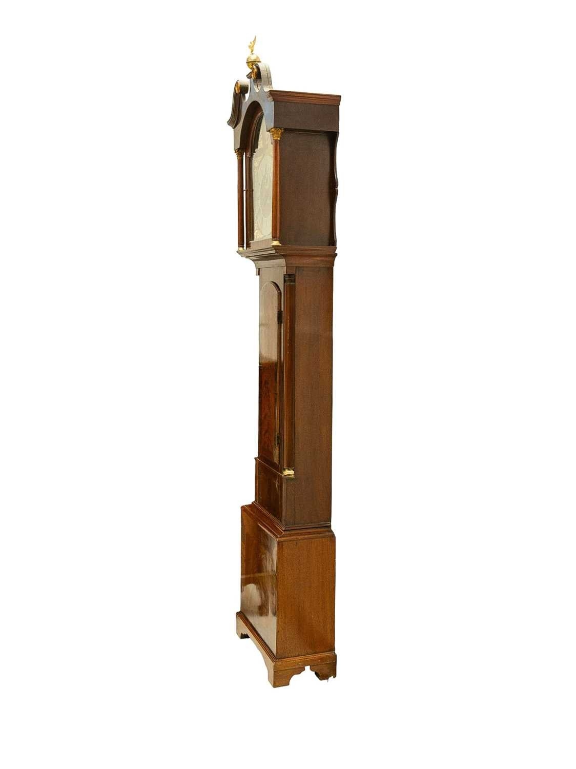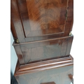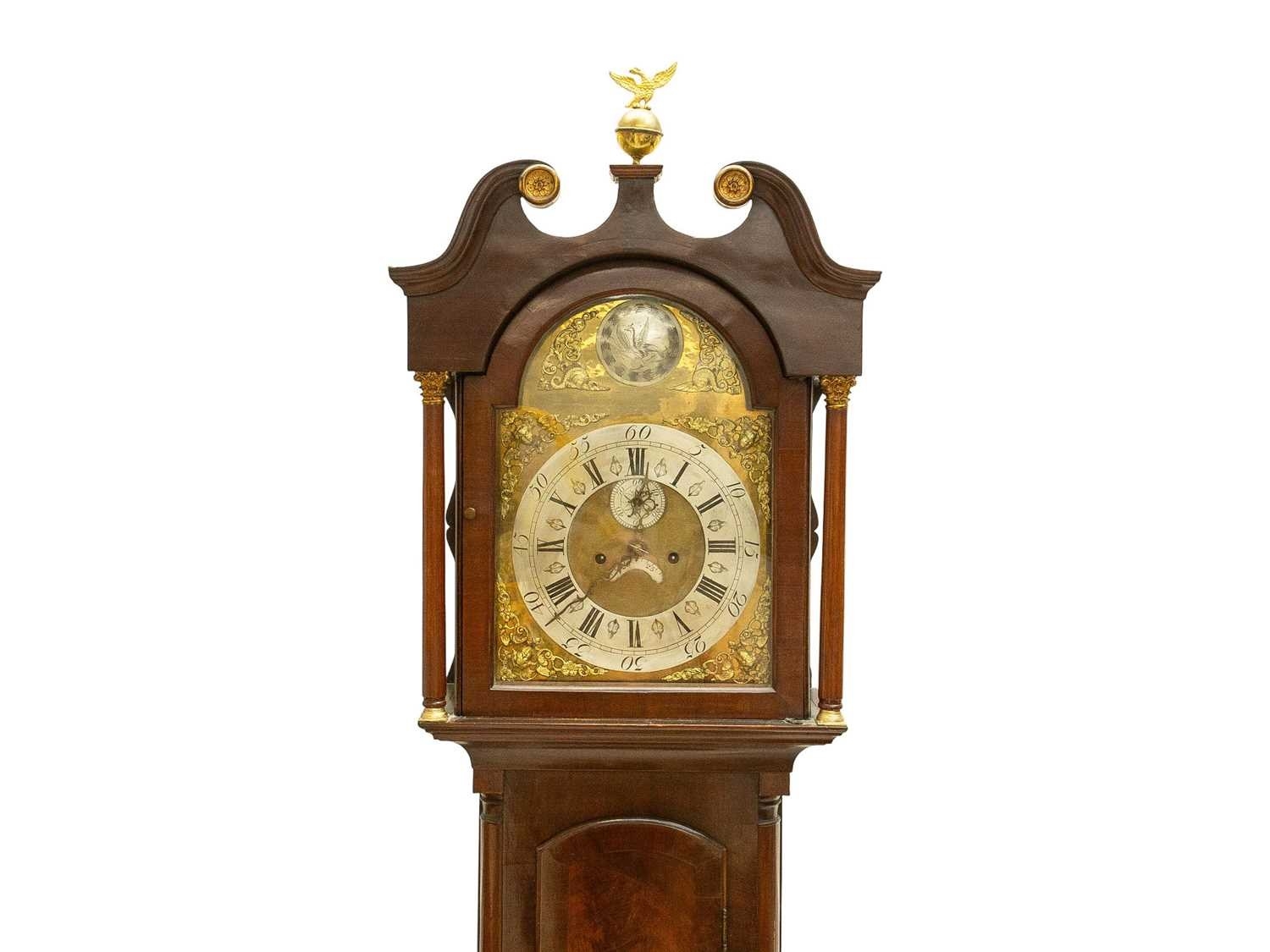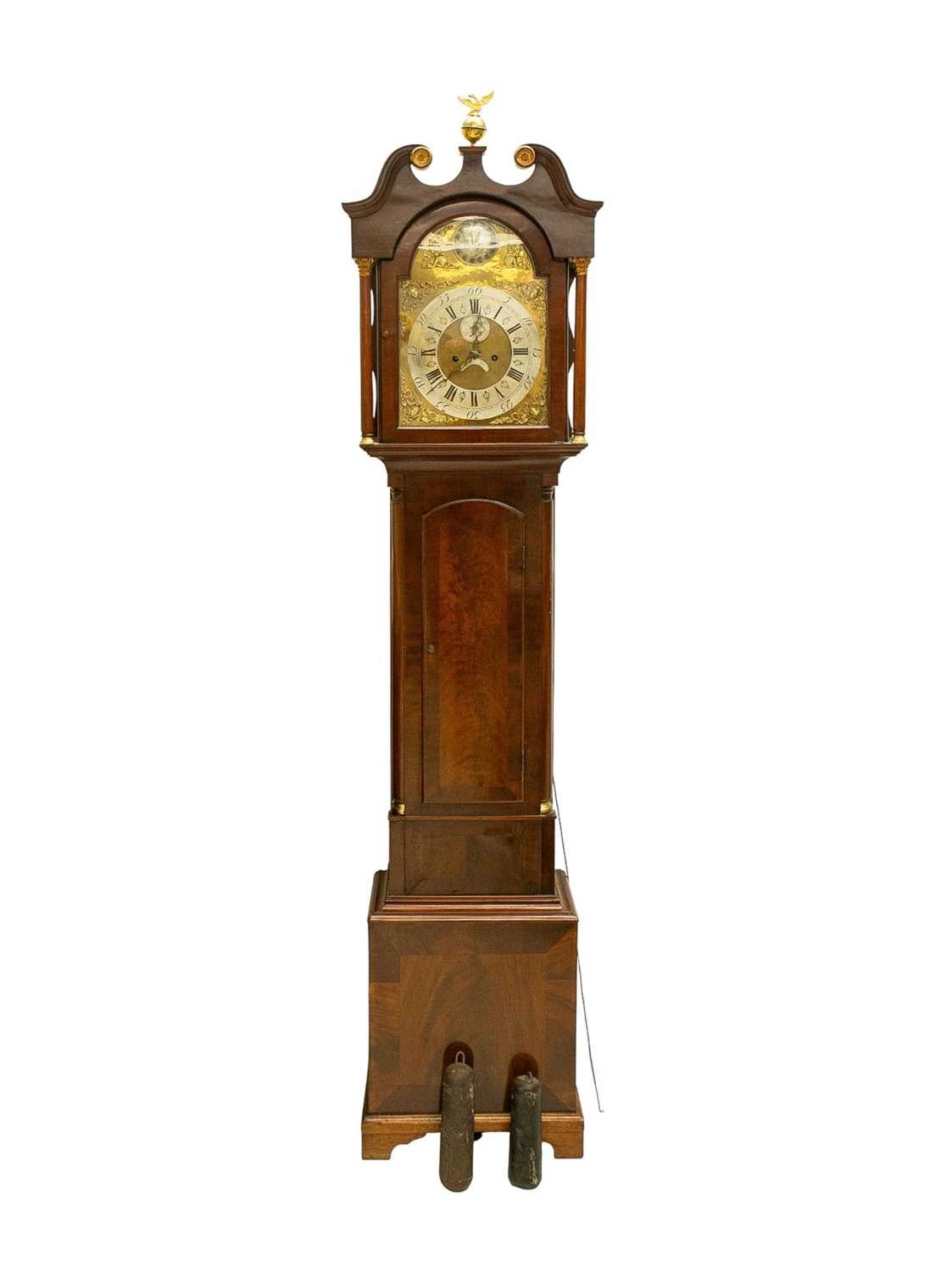 A late George III mahogany longcase clock. The arched brass 32cm dial with silvered chapter ring, calendar niche, seconds dial, and boss, with two weights and a pendulum, height 230cm. We have not seen this clock working. The bob is detached from the pendulum; there is no winding key. The case is generally good, with a little veneer lifting in places, and light scratching.