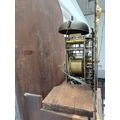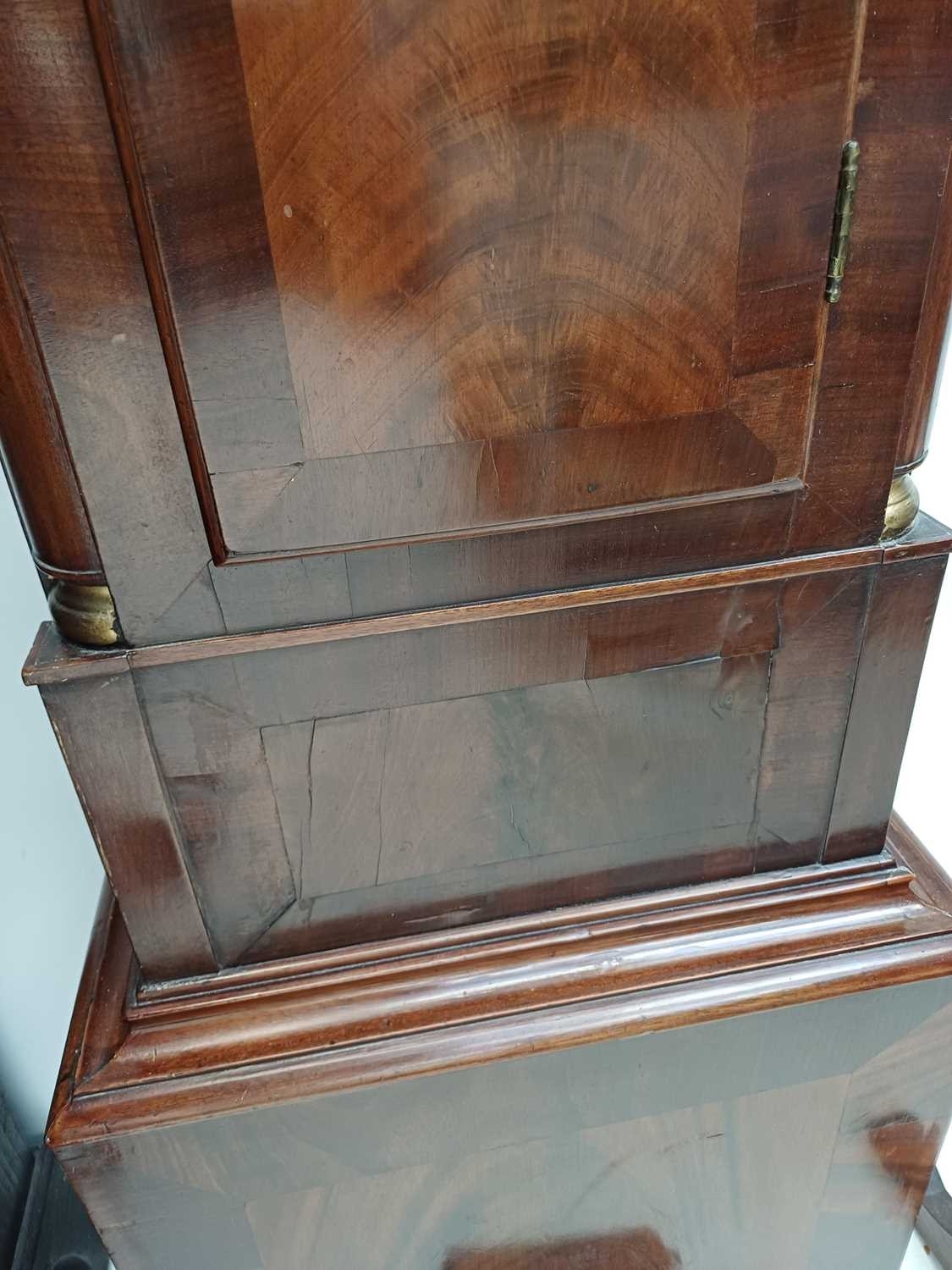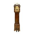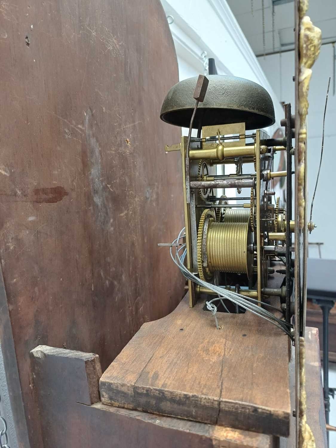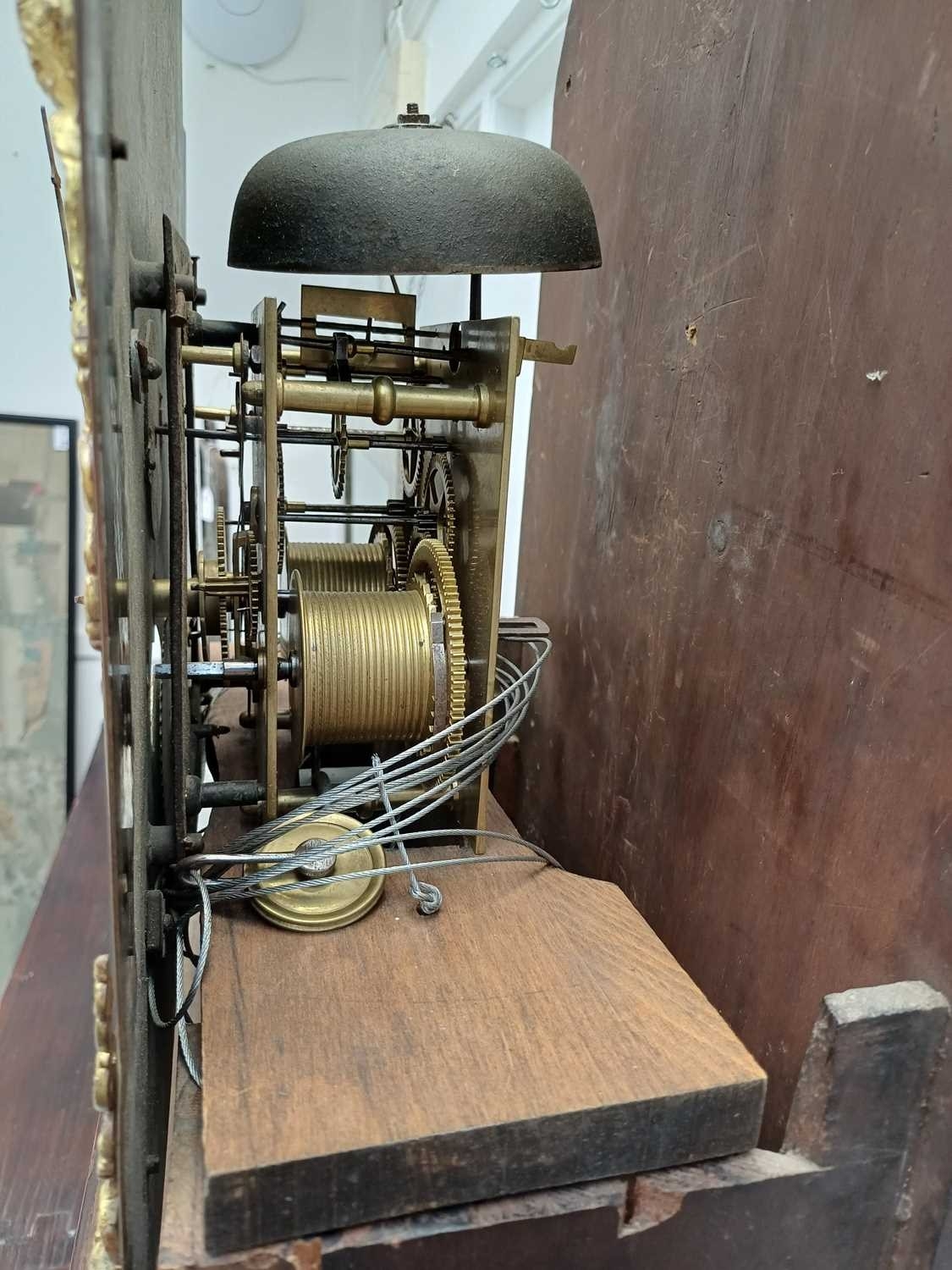A late George III mahogany longcase clock. The arched brass 32cm dial with silvered chapter ring, calendar niche, seconds dial, and boss, with two weights and a pendulum, height 230cm. We have not seen this clock working. The bob is detached from the pendulum; there is no winding key. The case is generally good, with a little veneer lifting in places, and light scratching.