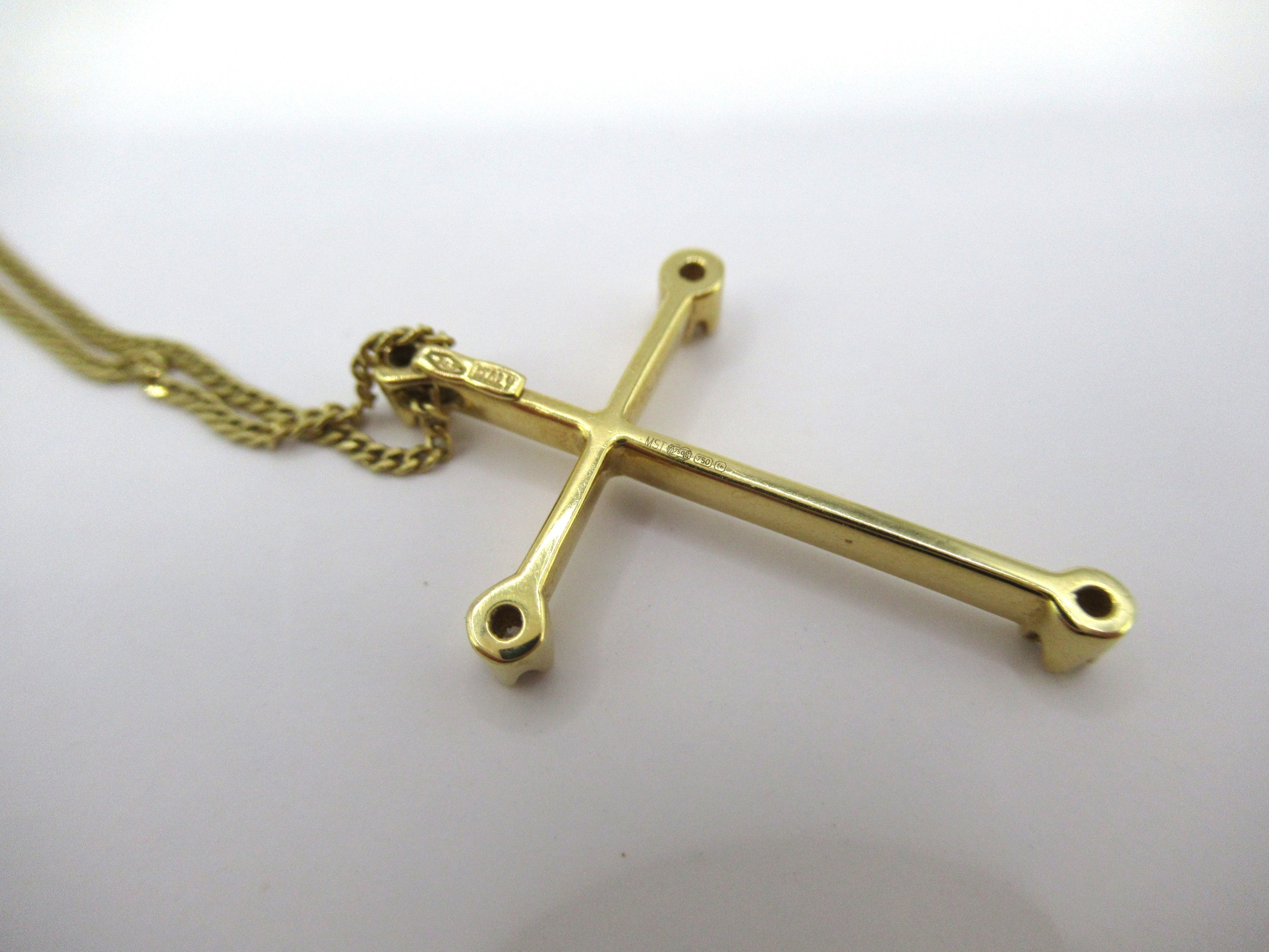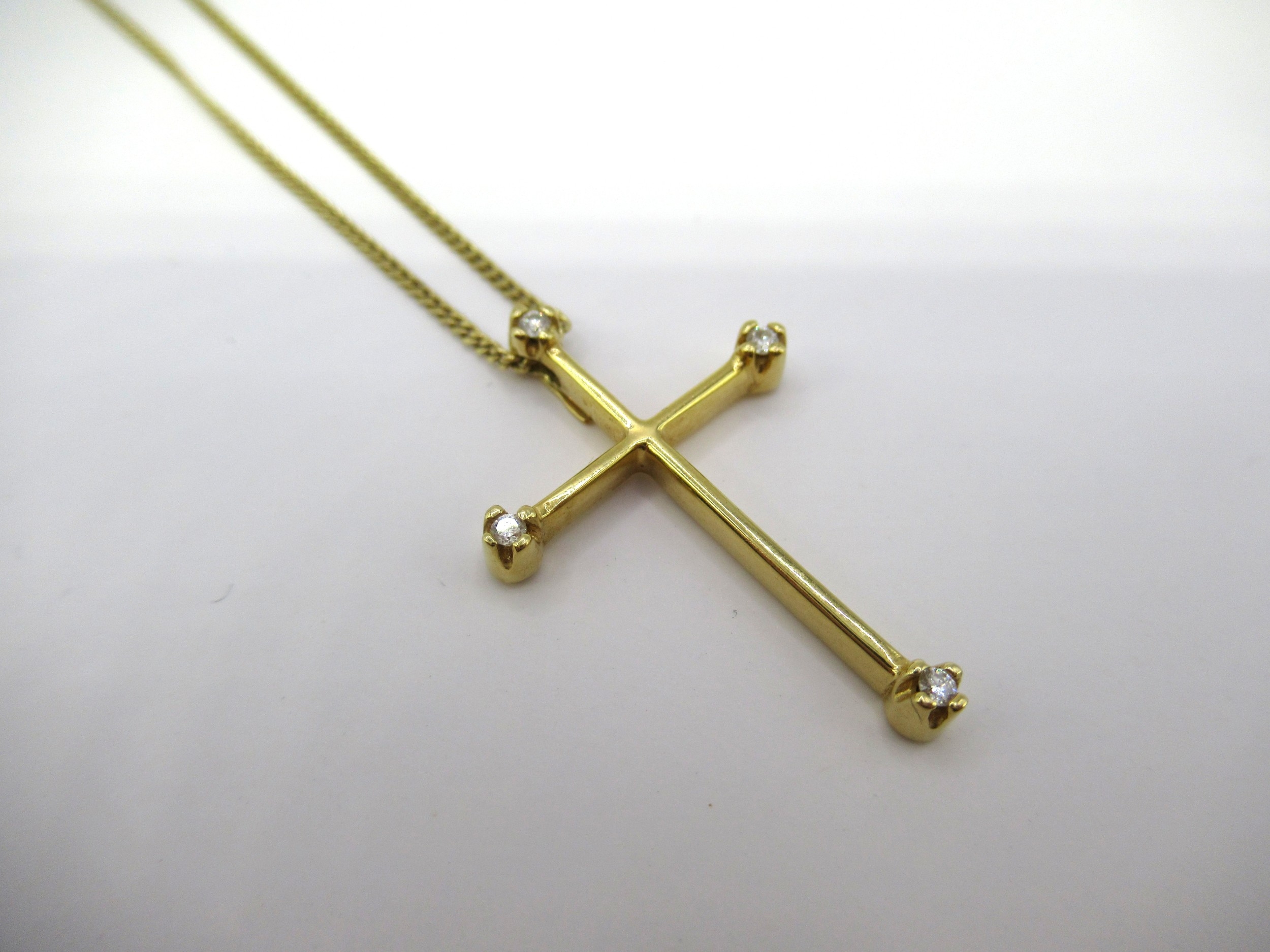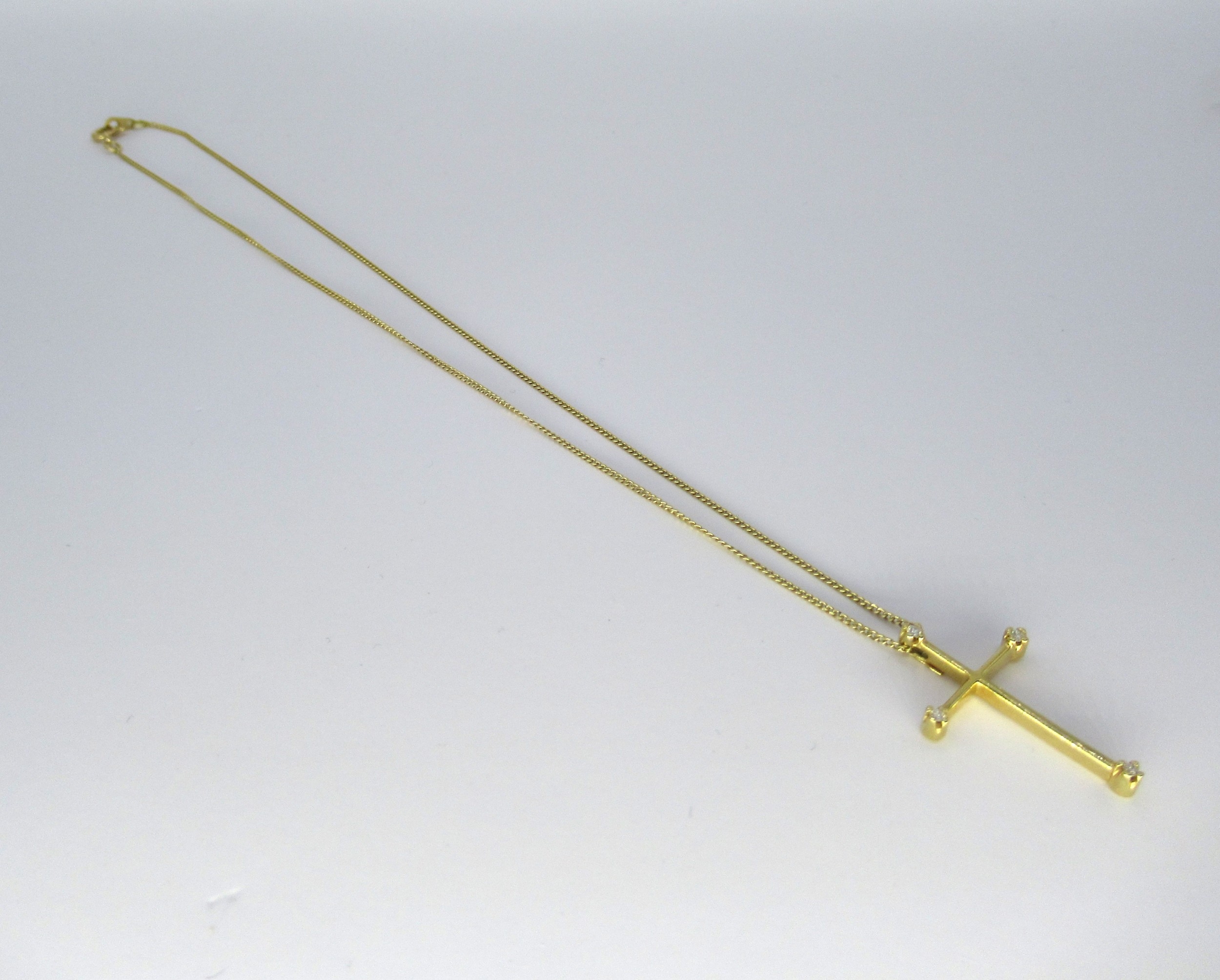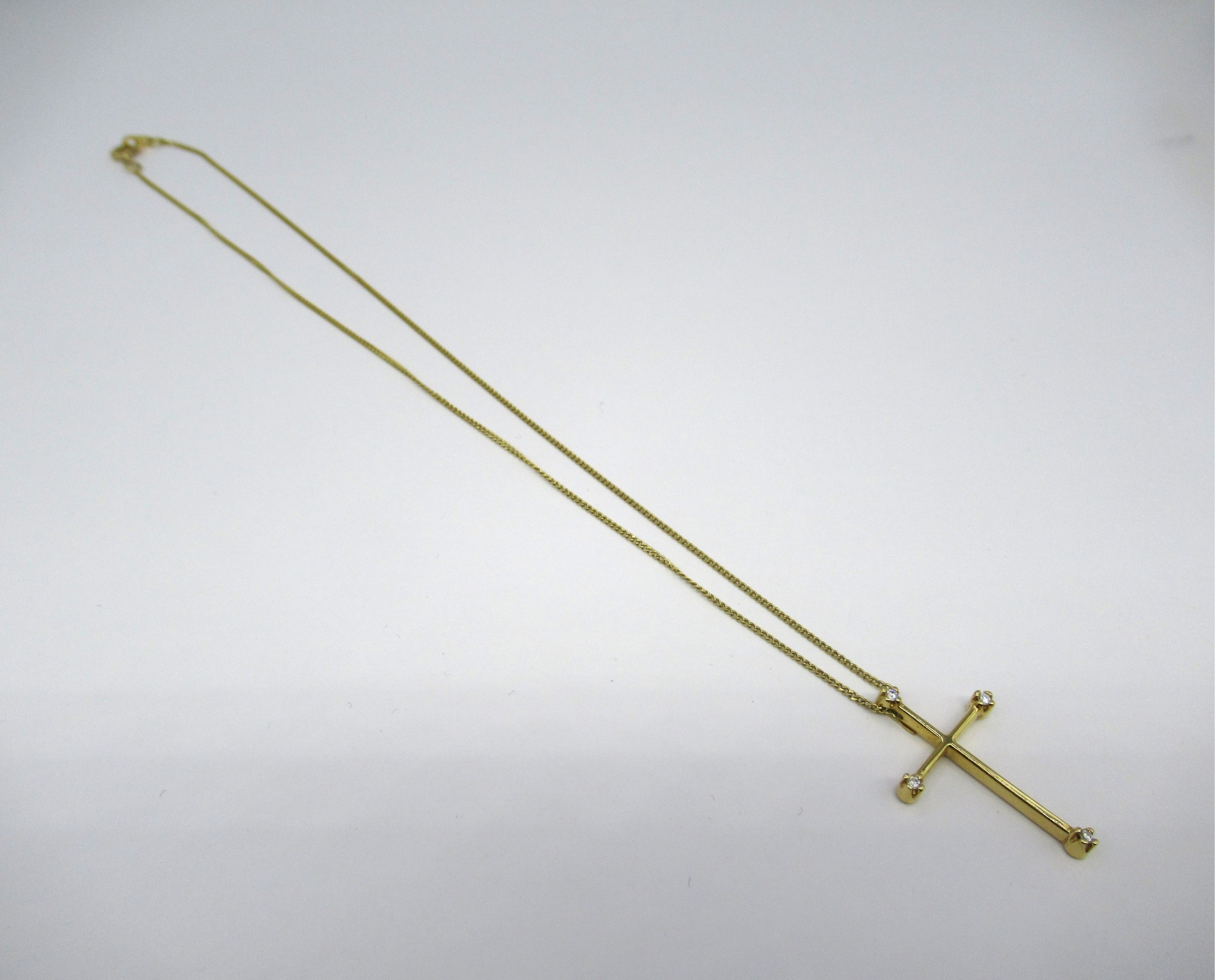 18ct Gold diamond set pendant cross on 18ct gold chain, 4.5g. The chain clasp is marked 750 (see photo). Overall length 40cm
