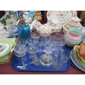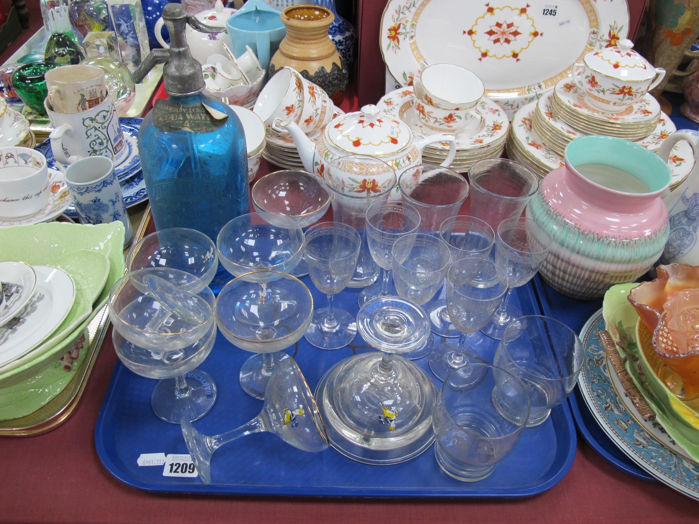 Babycham, Edward 8th and Three Cranes Sheffield drinking glasses. Blue glass soda syphon for J.F Eardley, Sheffield, etc:- One Tray.