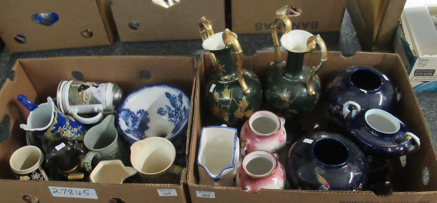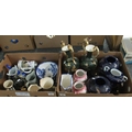 Two boxes of assorted china to include: green and gilt two-handled pedestal vases, a pair of Rockingham Pottery, Staffordshire lidded urns decorated in pink and gilt with pink roses, large blue ginger jars, decorated with exotic birds, marked C. B. Italy, Queen china Imari style jug, Garman beer stein and a lidded Davenport 'The Hero' by Derek William Ward beer steins, German novelty tea pot in the form of a begging dog, Ridgway & Abington Parian ware jug, jug and basin set etc. (2)