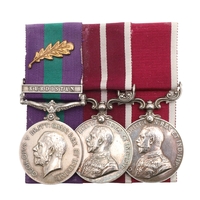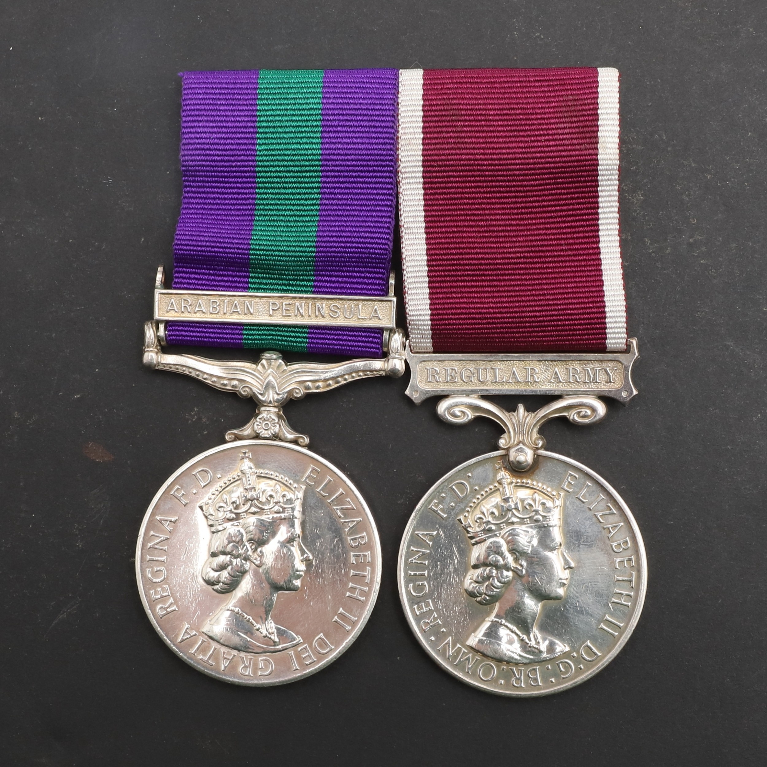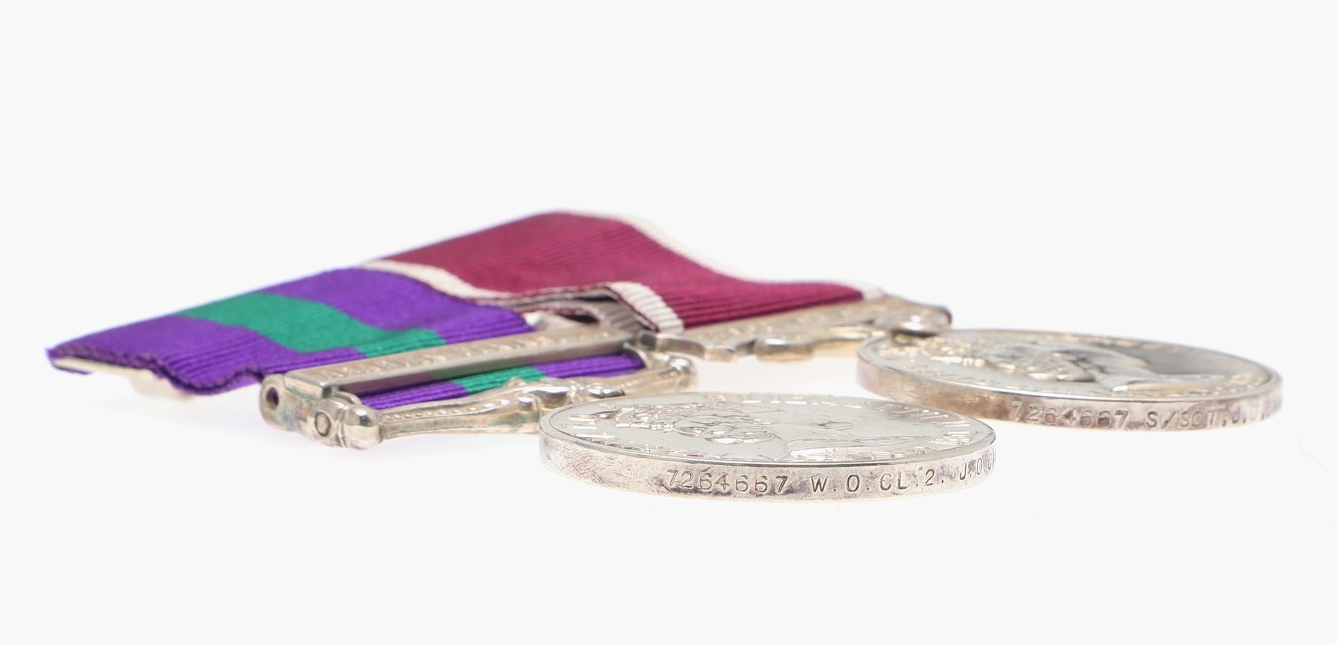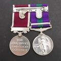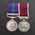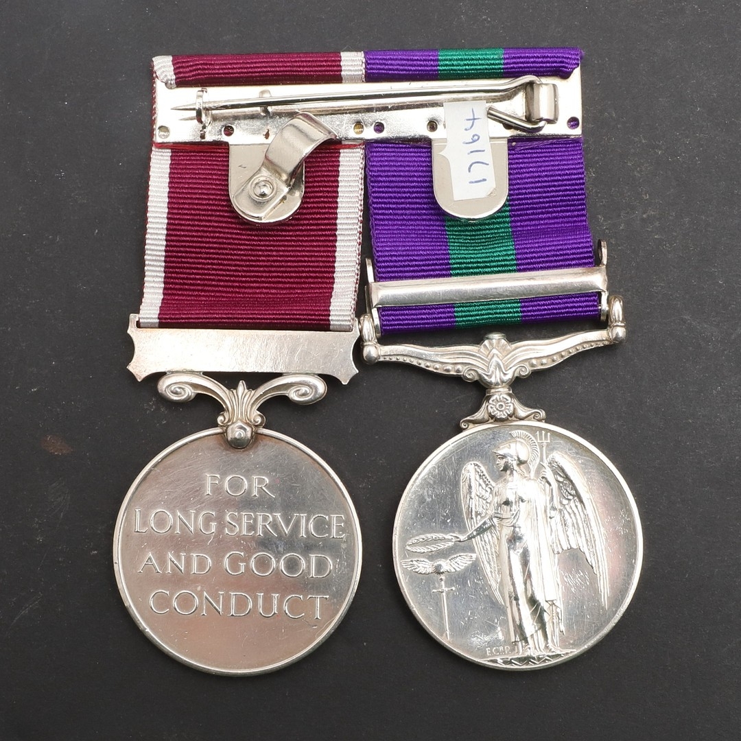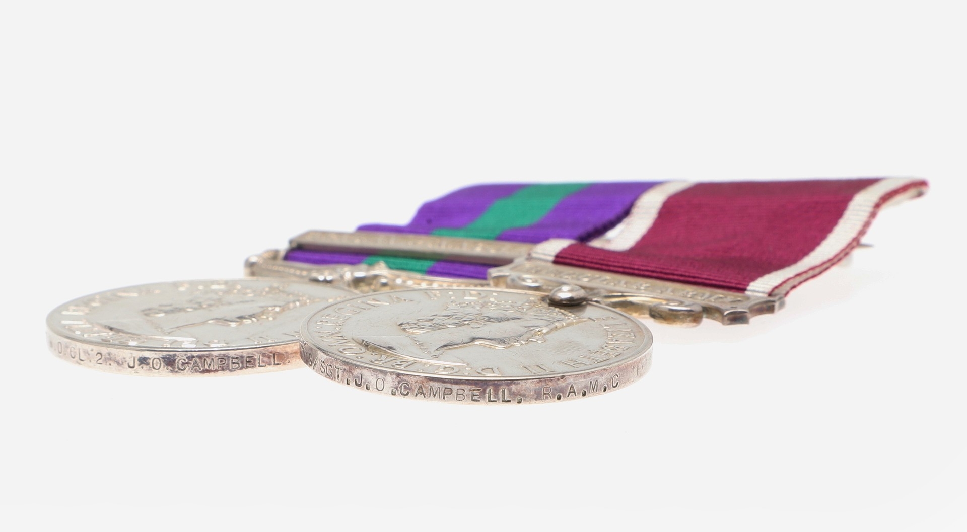 A GENERAL SERVICE AND LONG SERVICE PAIR TO THE ROYAL ARMY MEDICAL CORPS. A General Service medal 1918-62 with Arabian Peninsula clasp named to 7264667 W.O. Cl2 J.O. Campbell R.A.M.C. and Long Service and Good Conduct medal on Regular Army suspension to 7264667 S/Sgt J.O. Campbell R.A.M.C. mounted as worn. James Othno Campbell was born in Aldershot on the 5th July 1920 to a military family. He qualified for his Long Service and Good Conduct award on the 18th September 1956. He died in Aldershot on the 26th January 1986.