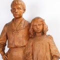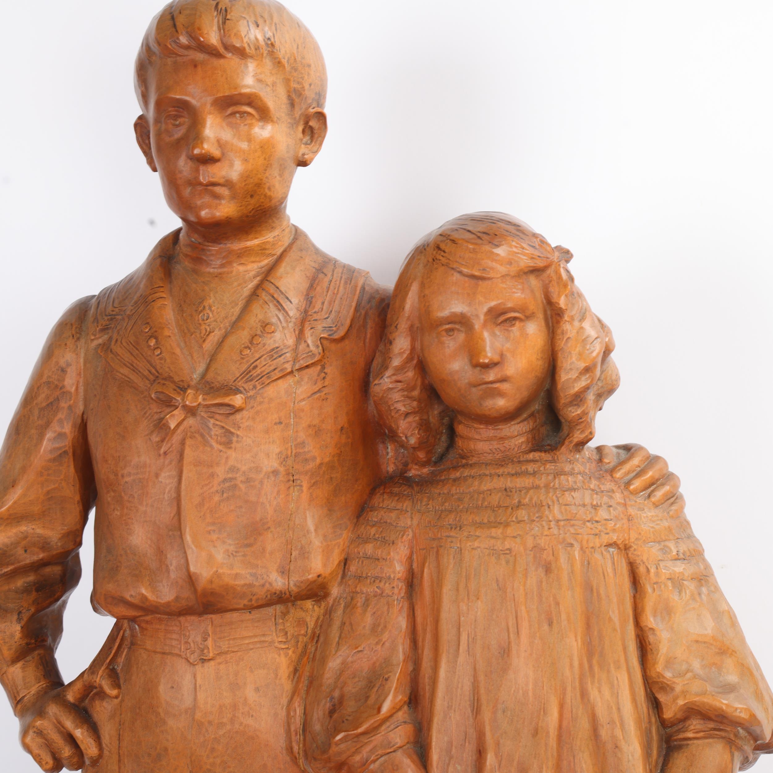 George Iselin (1874 - 1952), a large carved boxwood sculpture, portrait of a boy and girl, signed and dated 1906, height 70cm