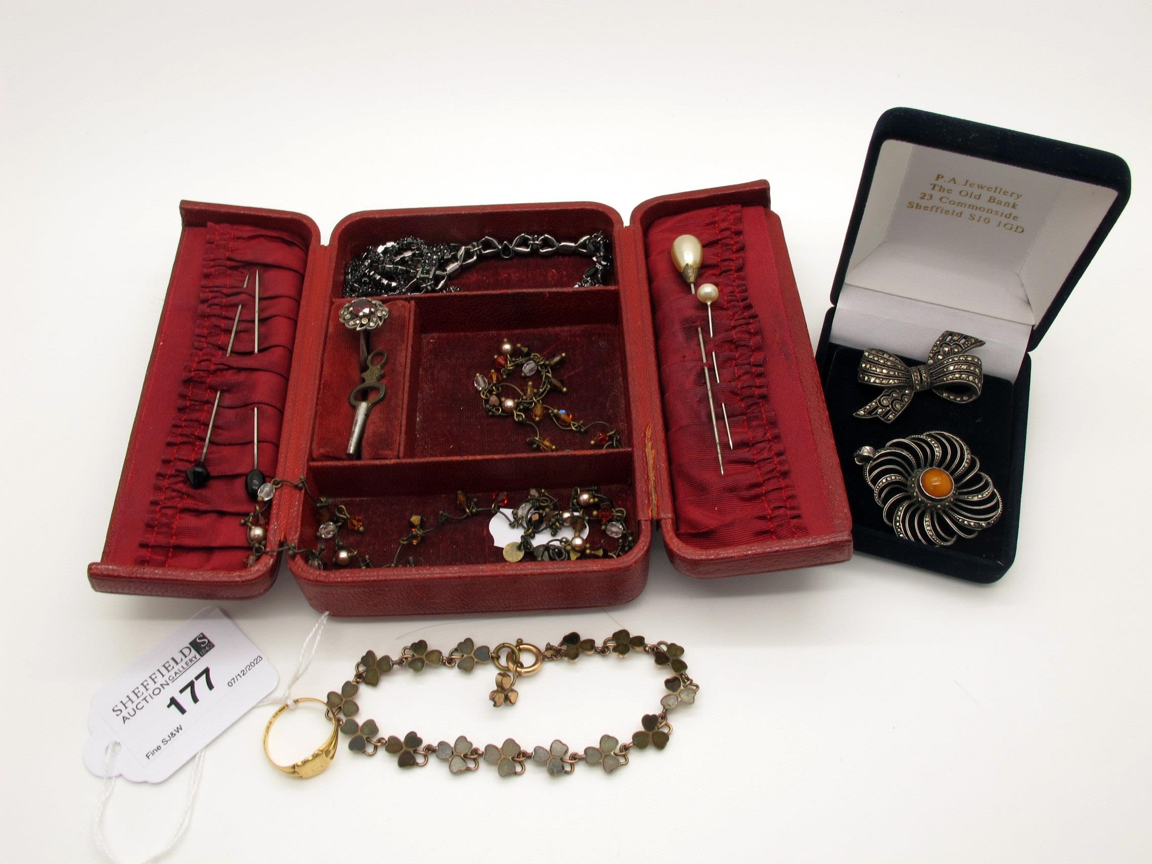 An 18ct Gold Signet Ring, (rubbed) (2.5grams); together with a vintage hardstone inset clover leaf bracelet; marcasite set pendant, marcasite set bow brooch, dress ring, necklaces etc, contained in a trinket case.