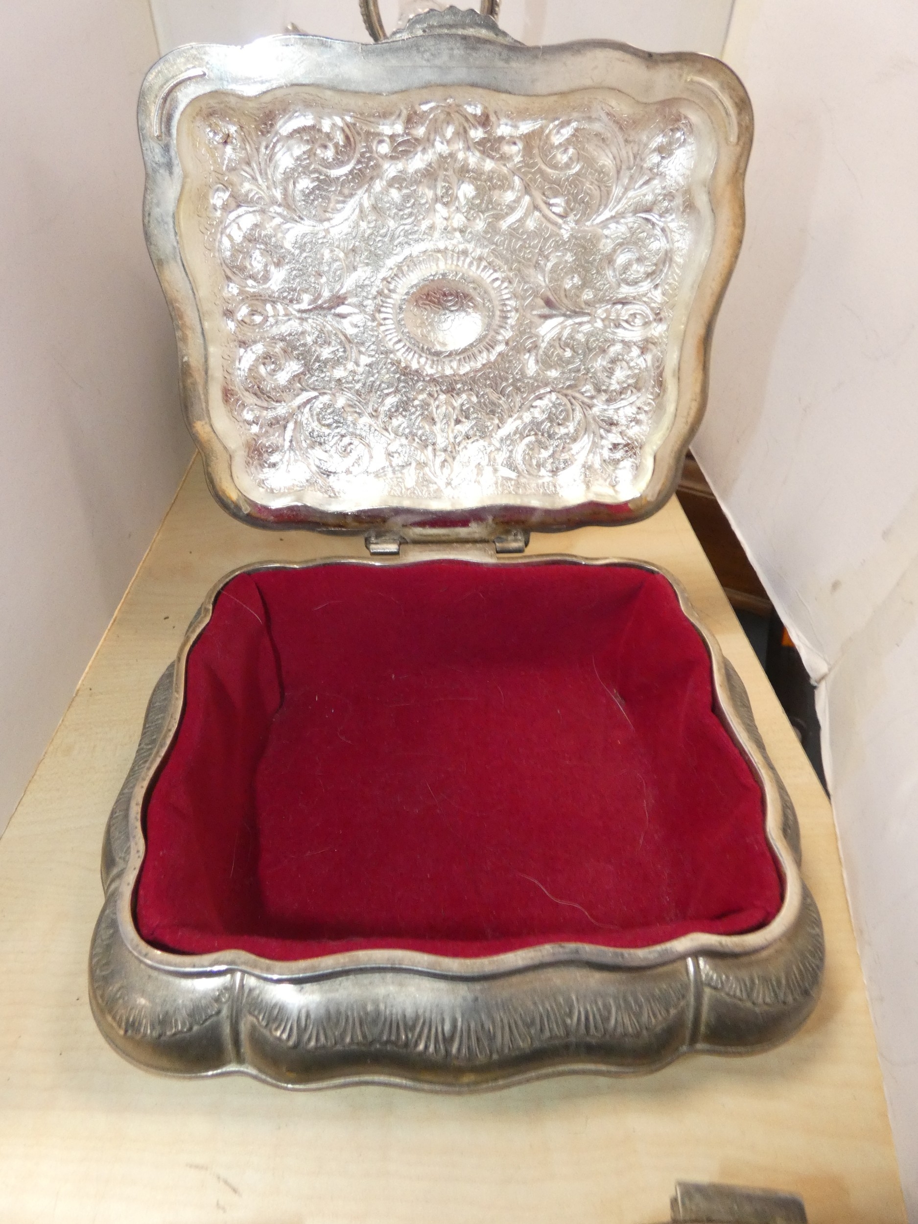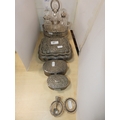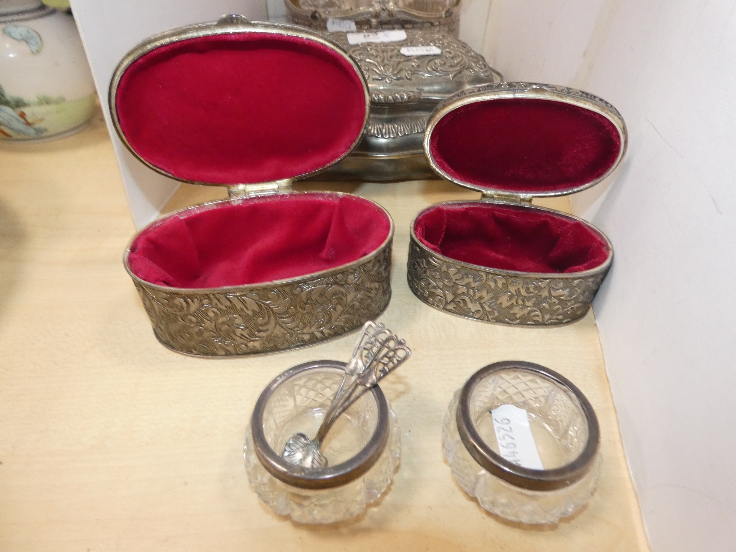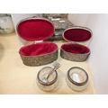 Silver plated cruet set containing glass oil bottles, three white metal boxes, one in the form of a casket, pair of silver-collared and glass salts, and two EP spoons.