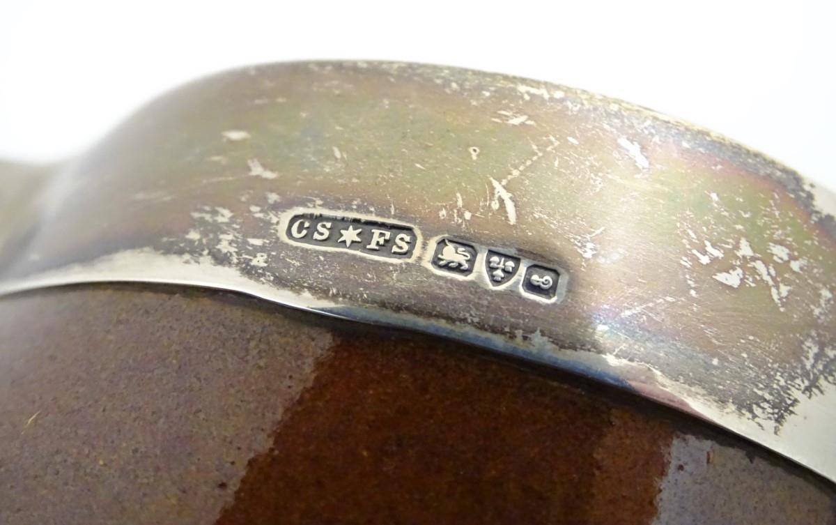 A Royal Doulton two tone salt glaze jug with hallmarked silver rim, Chester 1905, and relief decoration of harvest and hunting scenes, including a deer, dogs, and gentleman on horseback with a hunting horn, trees, a windmill and figures drinking and smoking. Impressed Royal Doulton mark and x2892 to base. Approx. 6 1/2'' high.