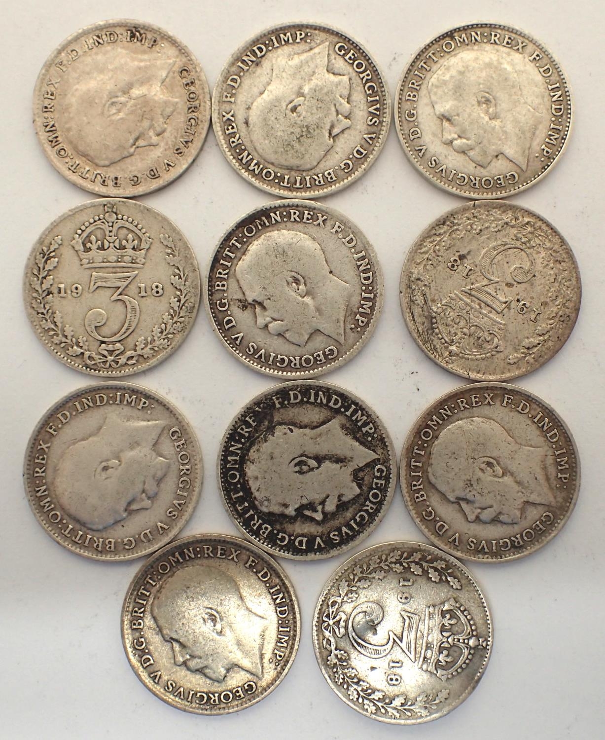 Eleven 1918 silver threepences of George V, varying grades. P&P Group 1 (£14+VAT for the first lot and £1+VAT for subsequent lots)