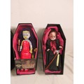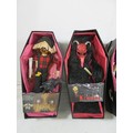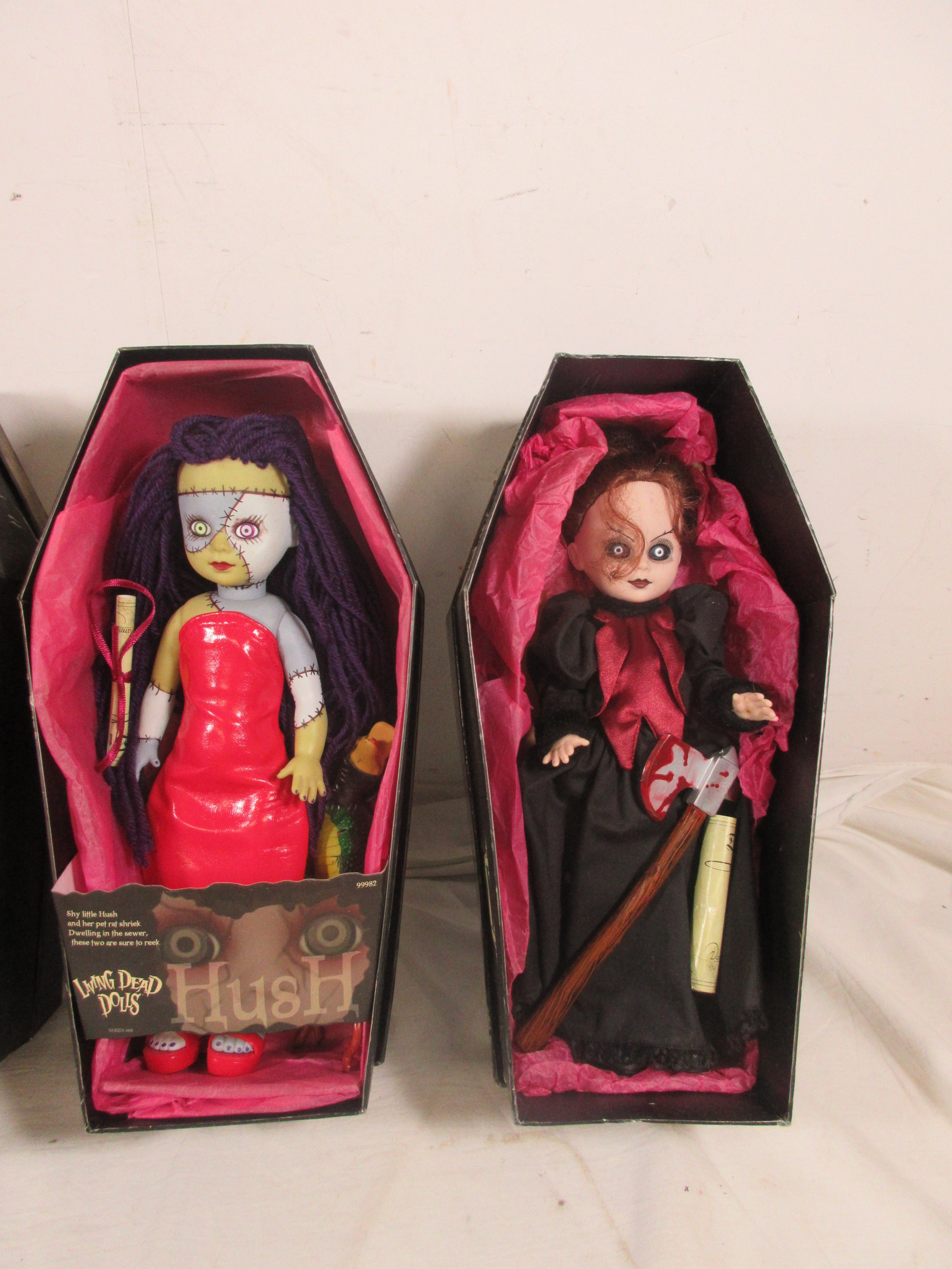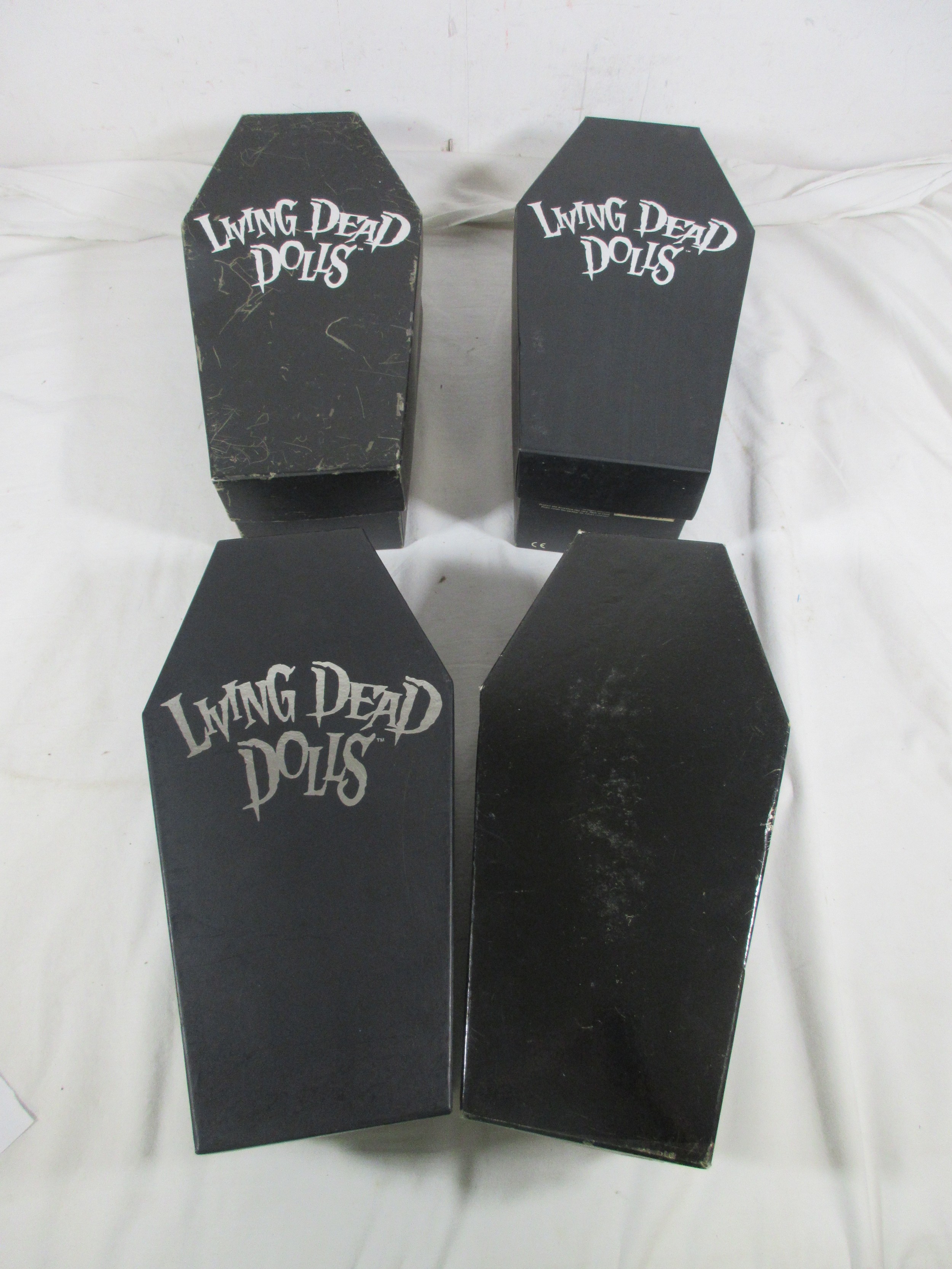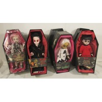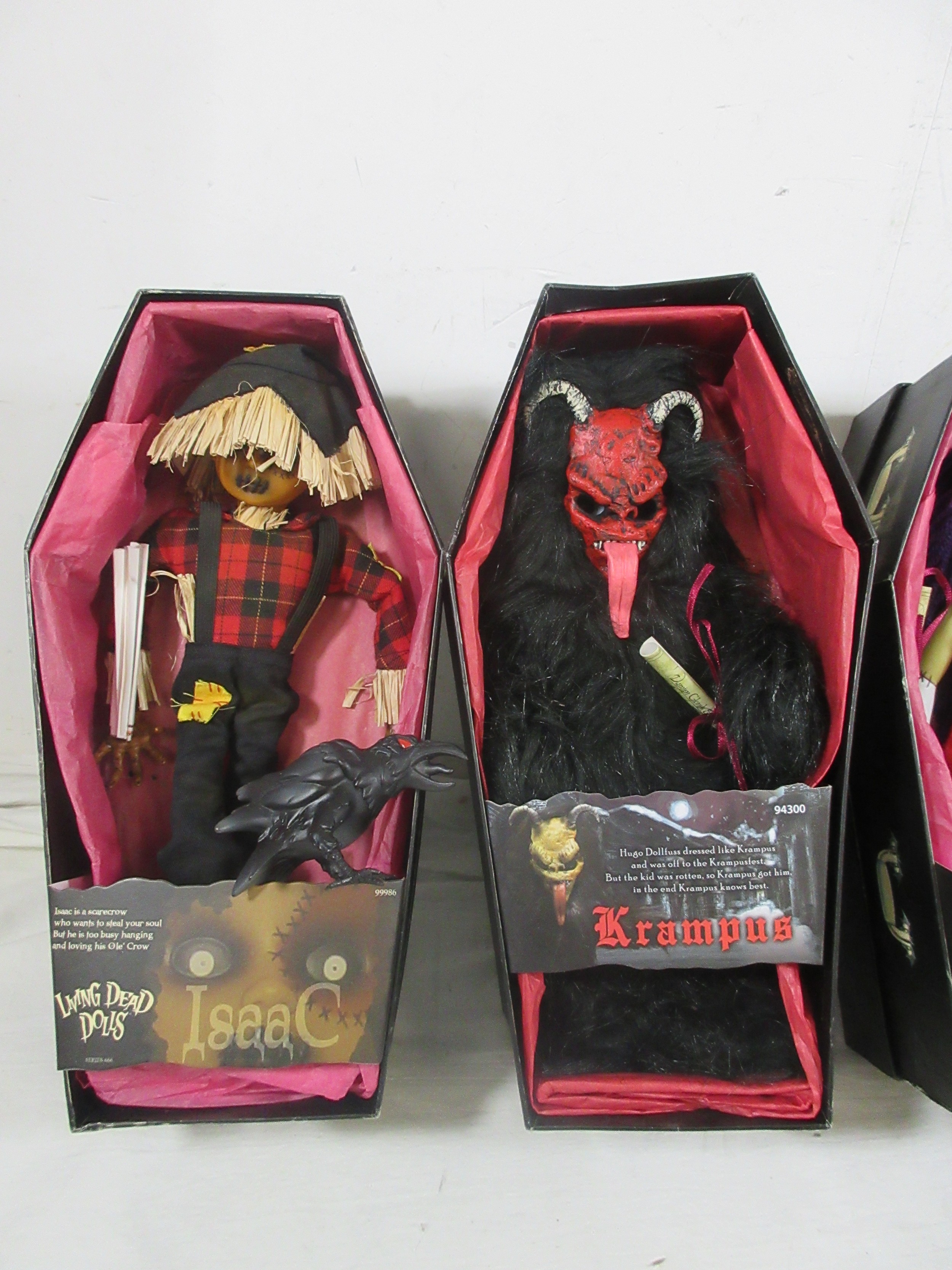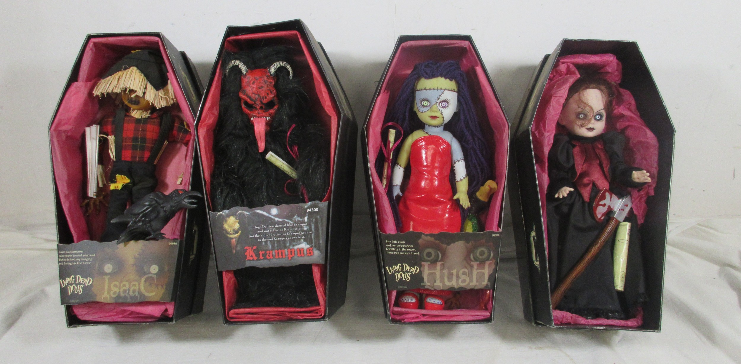 4 Mezco Living Dead Dolls comprising 99986 Isaac, 94300 Krampus, 99982 Hush & 99983 Calico, all in boxes, Calico is missing the name cover, storage wear to boxes