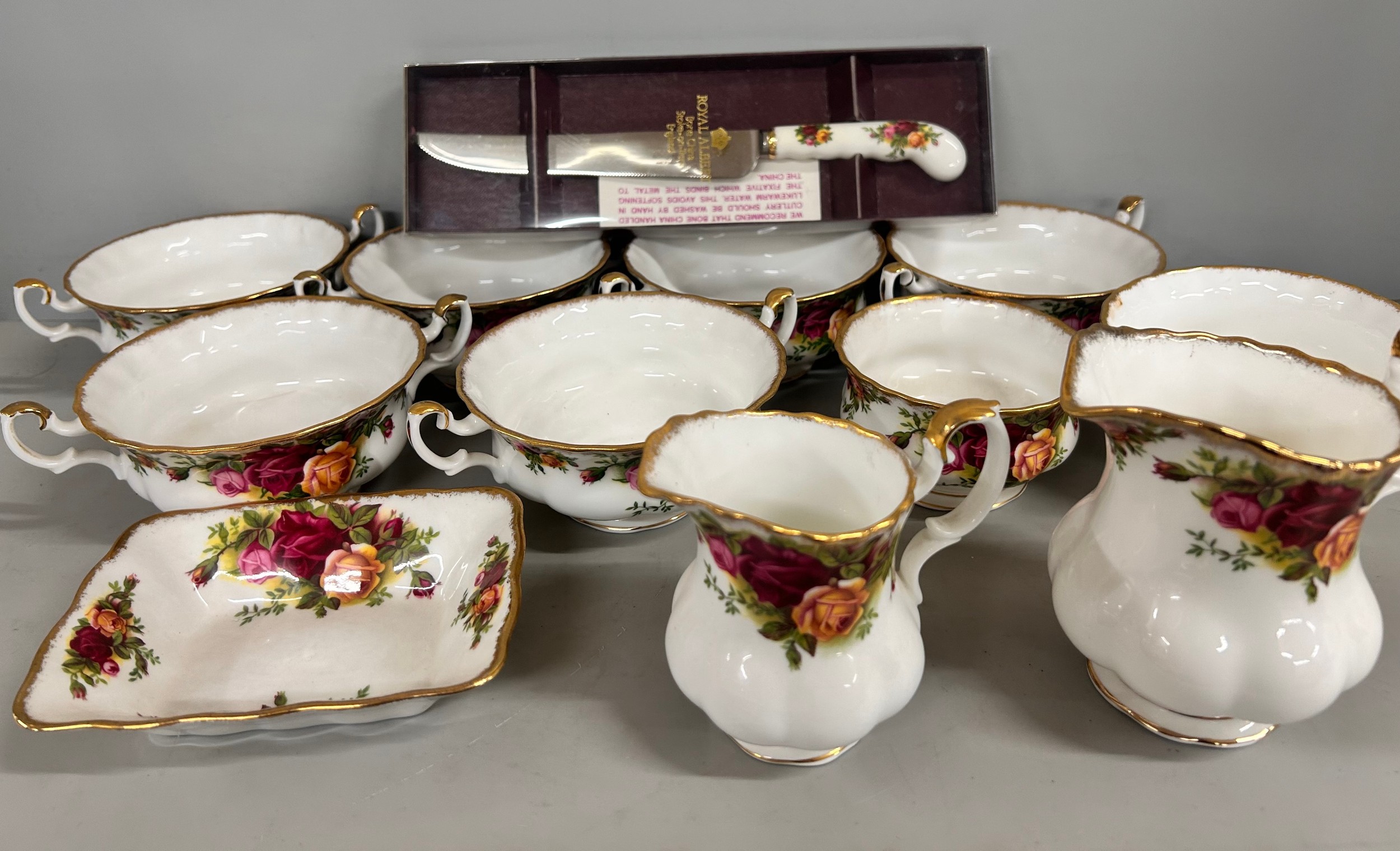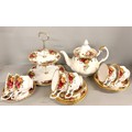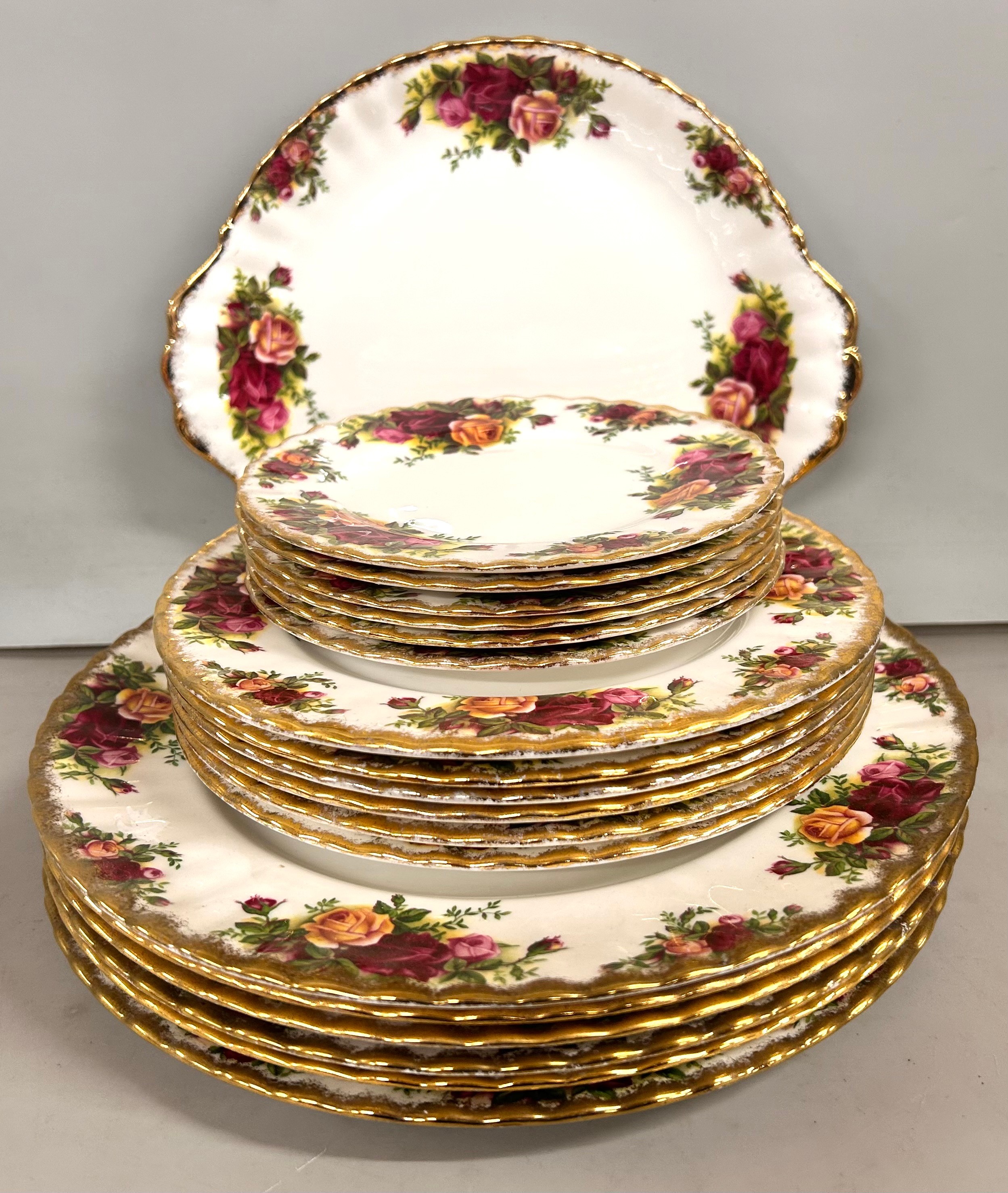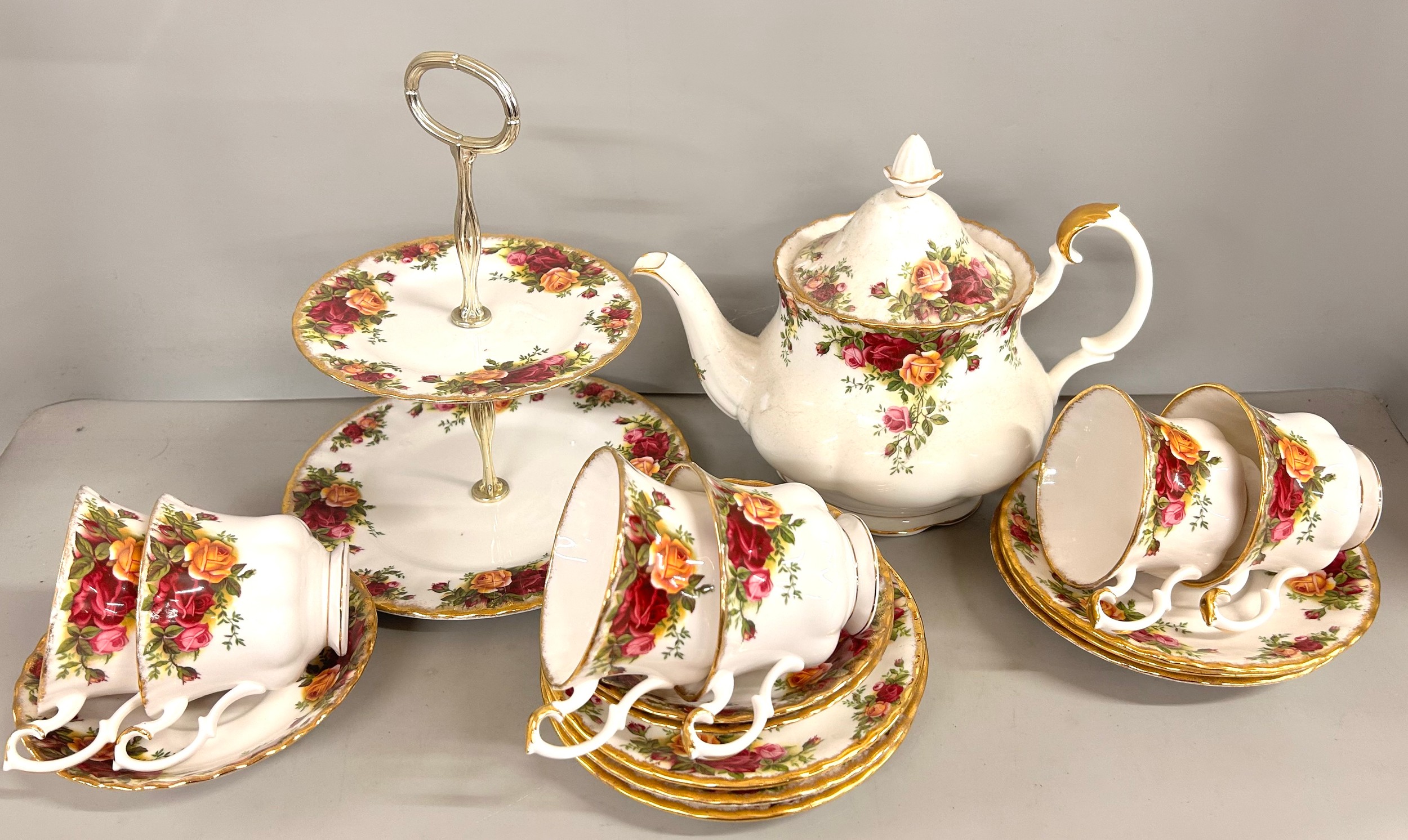 A collection of Royal Albert Old Country Roses china, tea and dinnerware, large tea pot, six cups, six saucers, six side, medium and dinner plates, two cream jugs, also some soup bowls, a cake stand, etc. **THIS LOT IS NOT AVAILABE FOR PACKING AND POSTING**