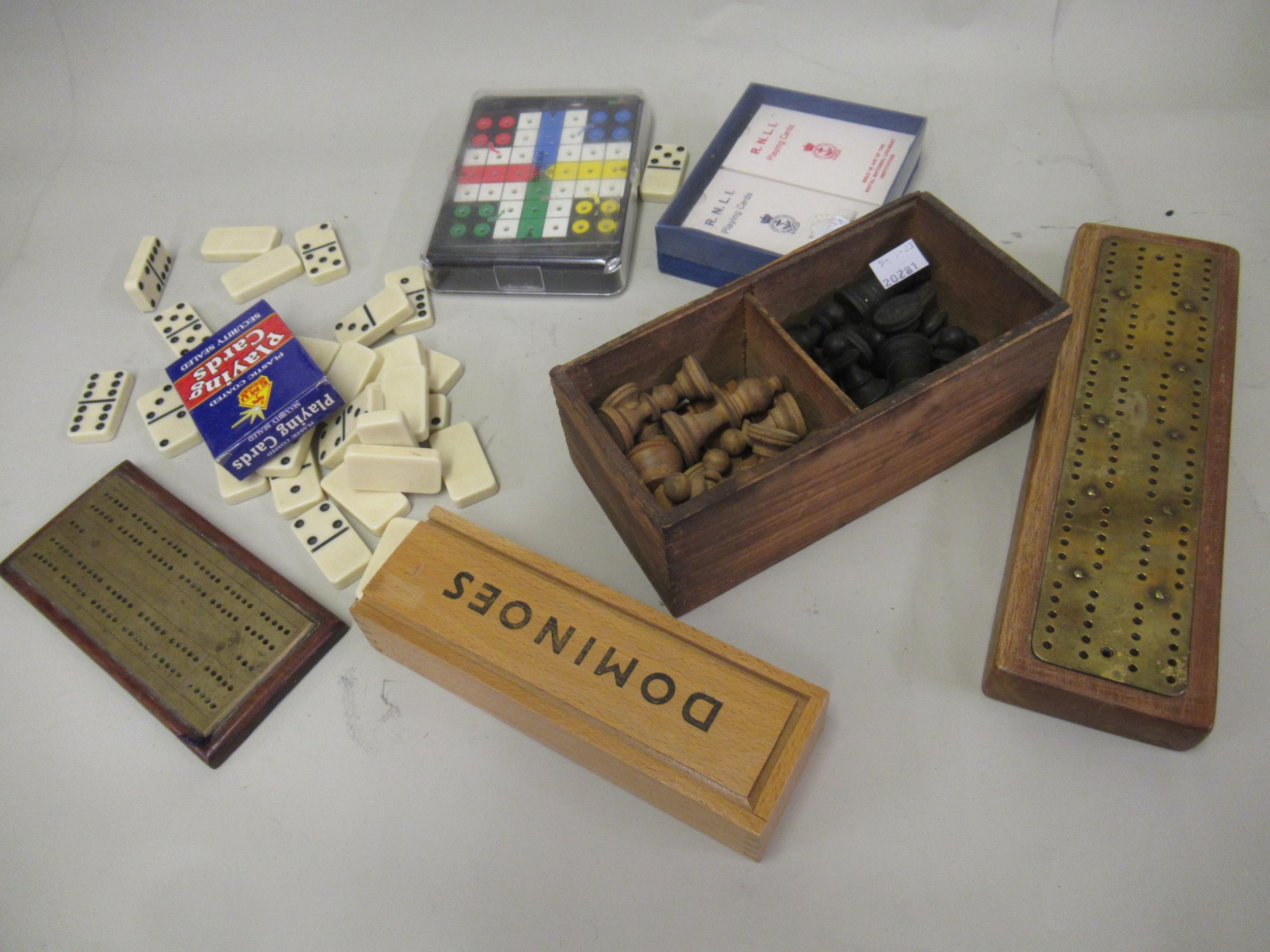 Small quantity of various cribbage boards, dominoes and chess pieces etc.