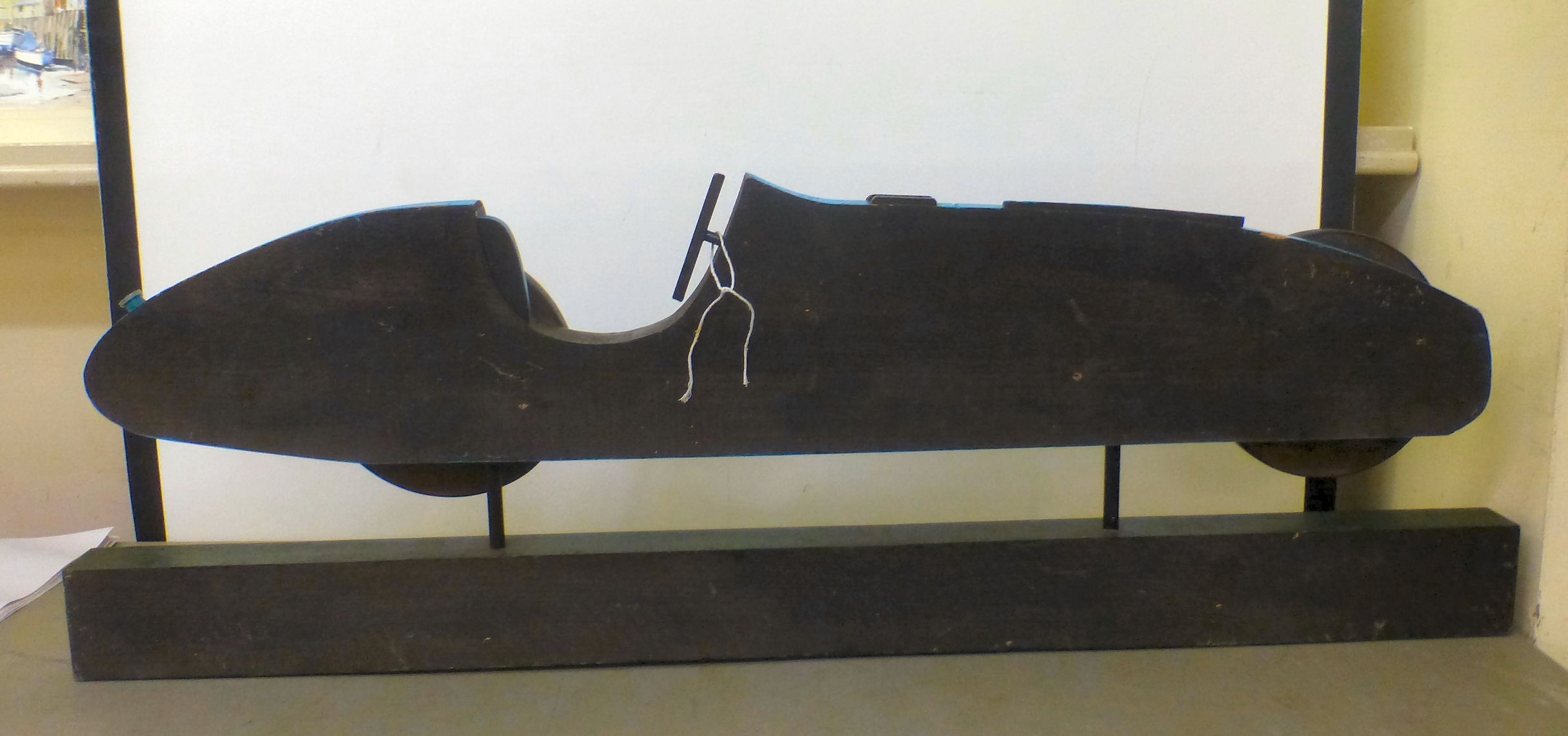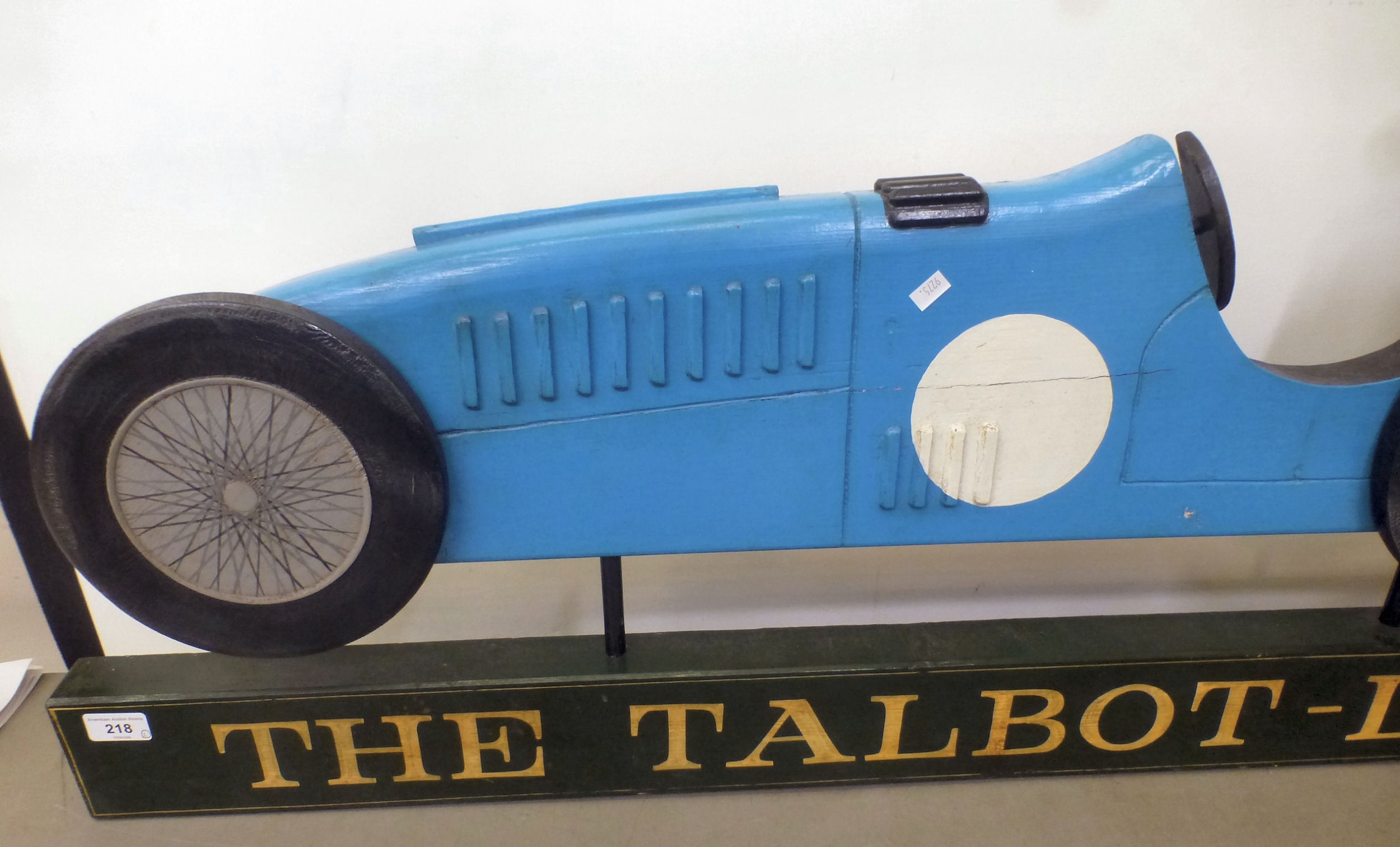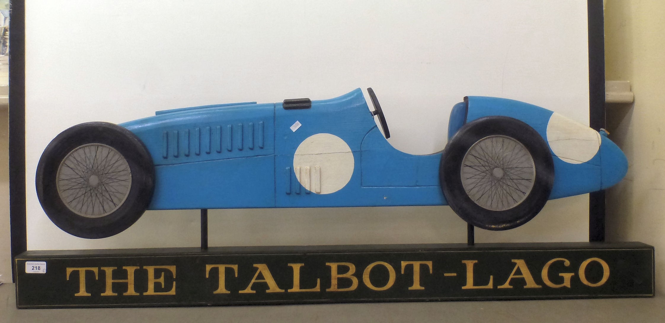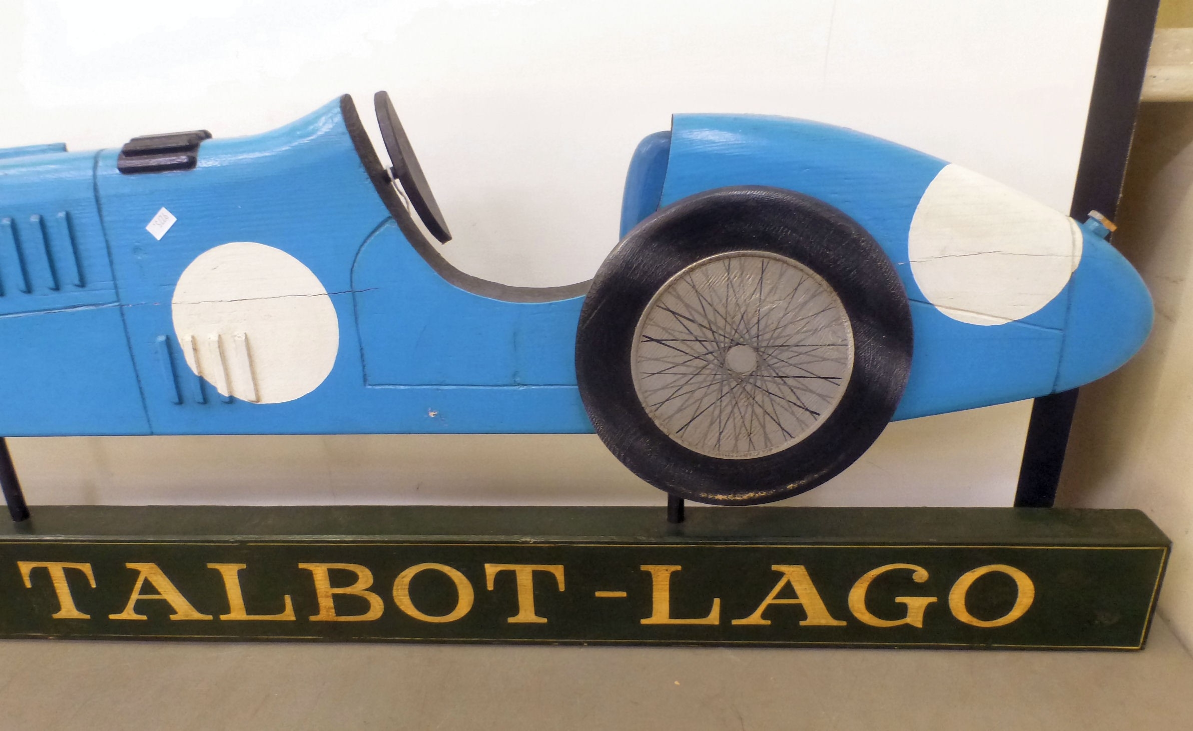 A carved and overpainted wooden sign 'The Talbot-Lago', depicting a vintage racing car 16" x 47"