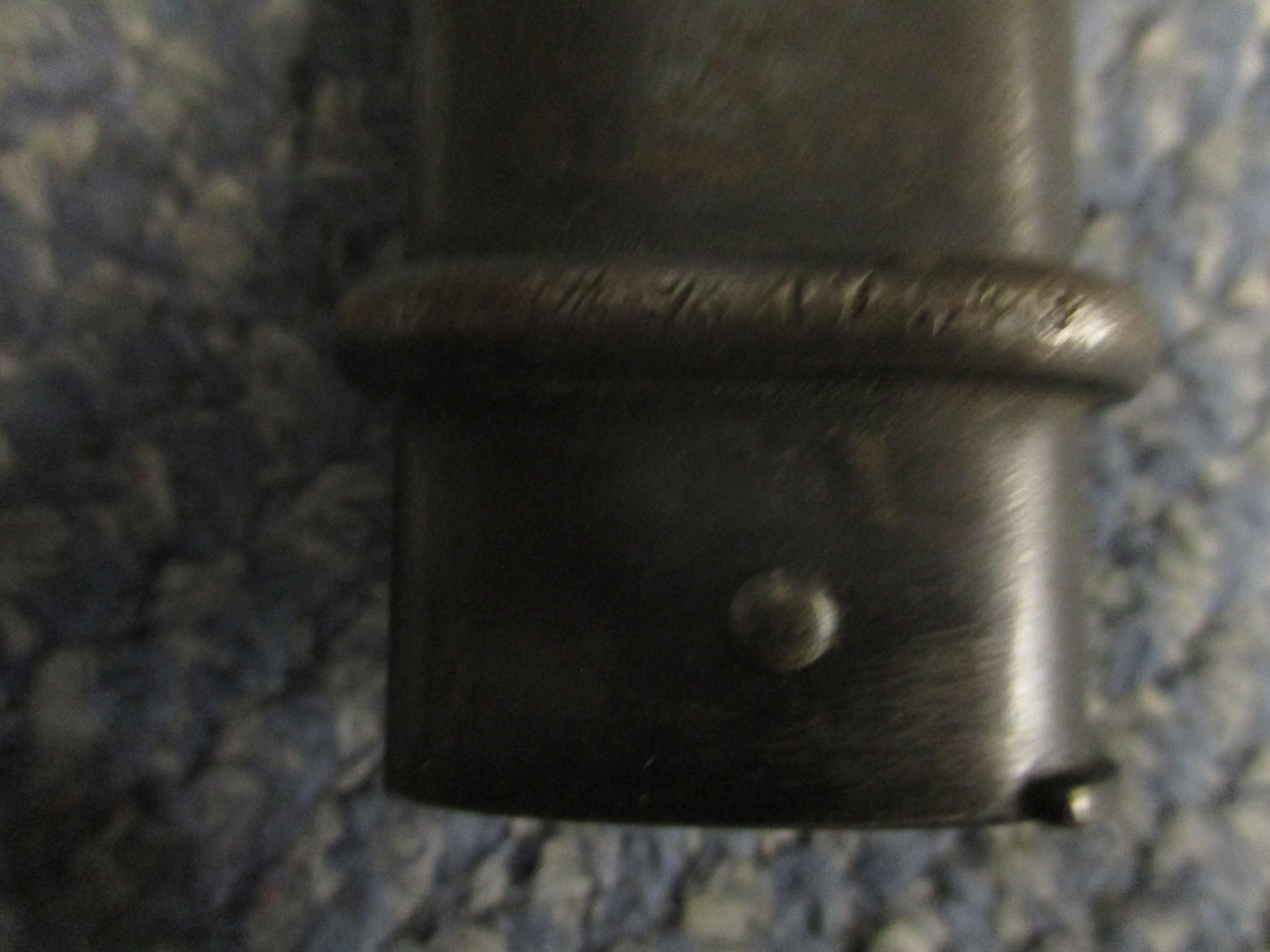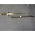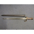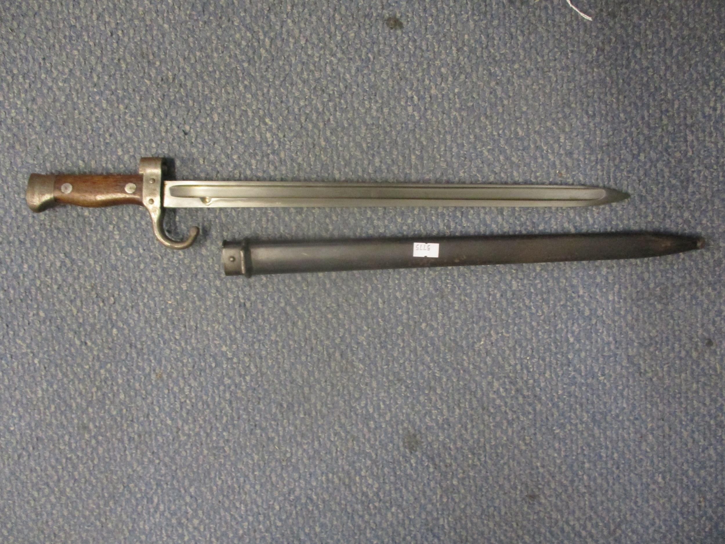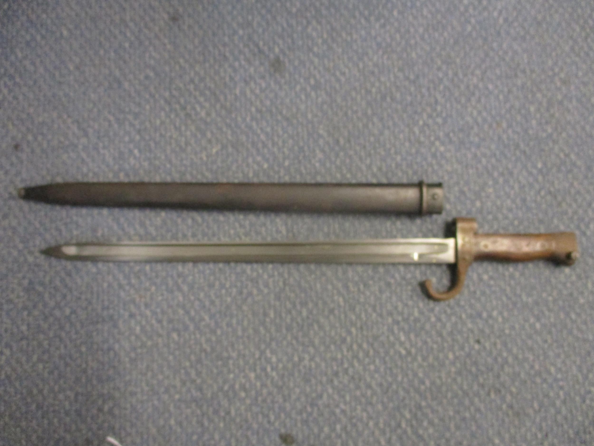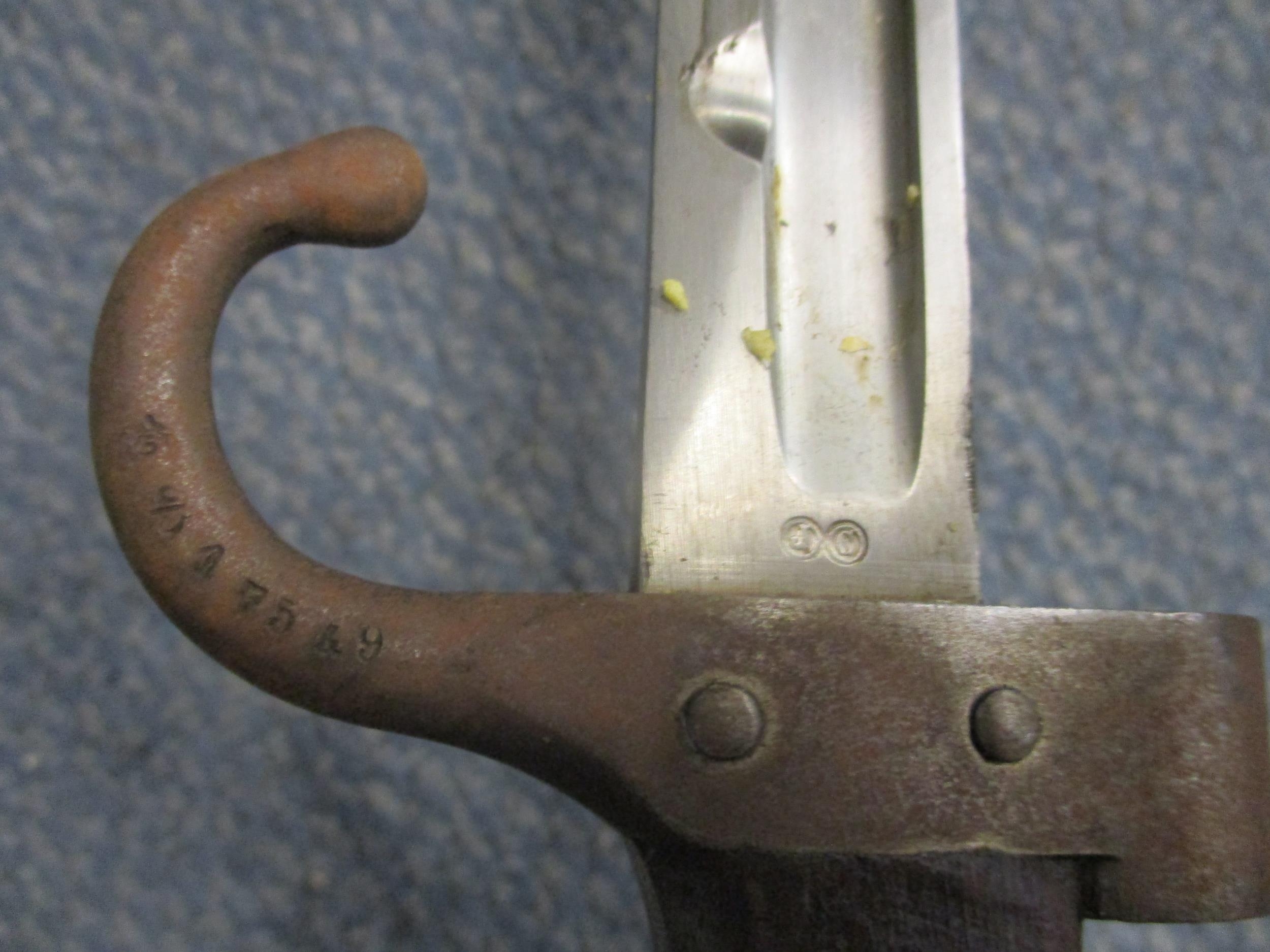 A French model 1892 bayonet fullered blade stamped JC to base quillon No 17549 with metal scabbard bearing matching serial number, length 51.5cm