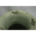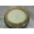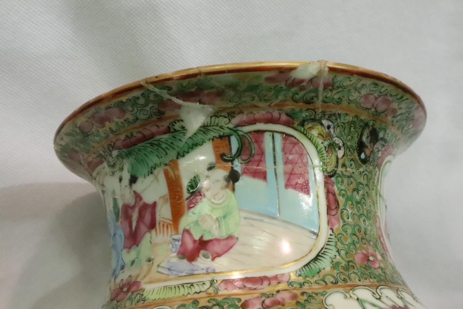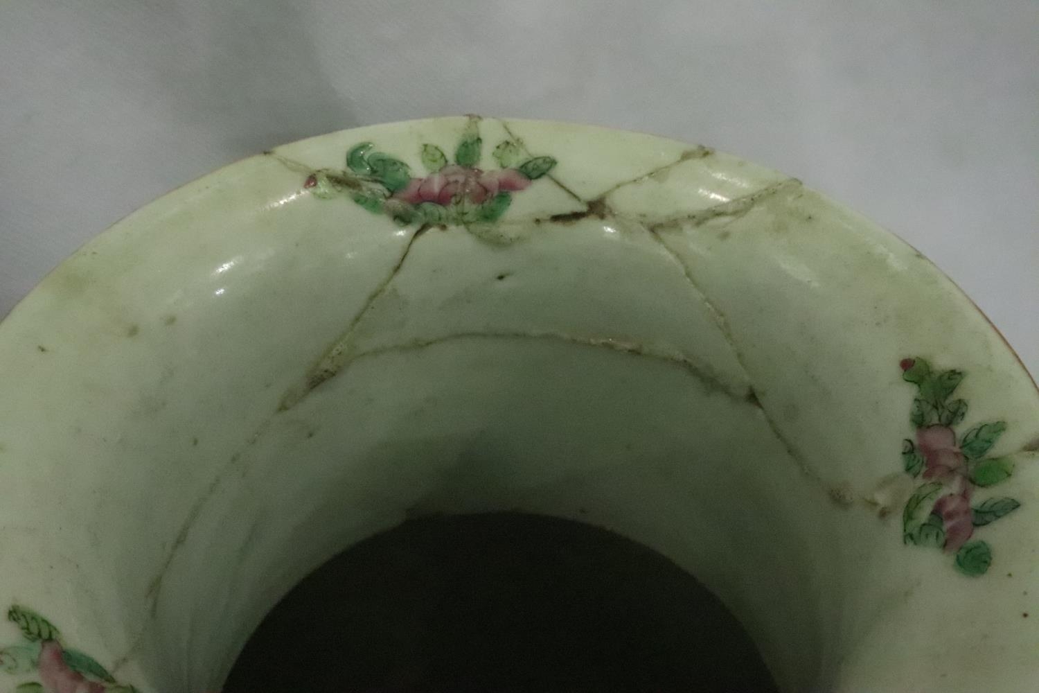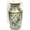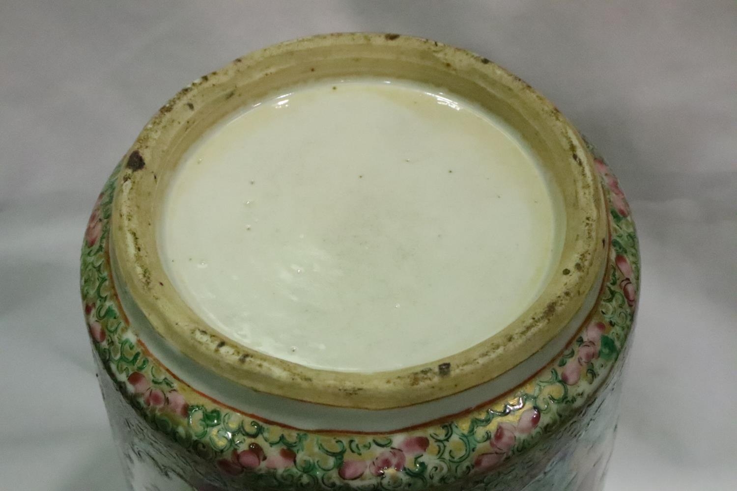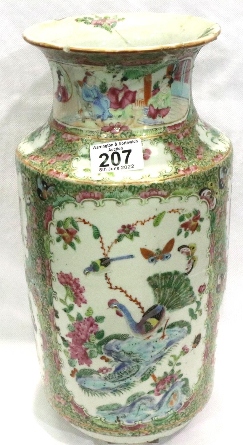 Large Oriental enamelled ceramic cylinder vase, H: 34 cm. Glued repair to rim. P&P Group 3 (£25+VAT for the first lot and £5+VAT for subsequent lots)