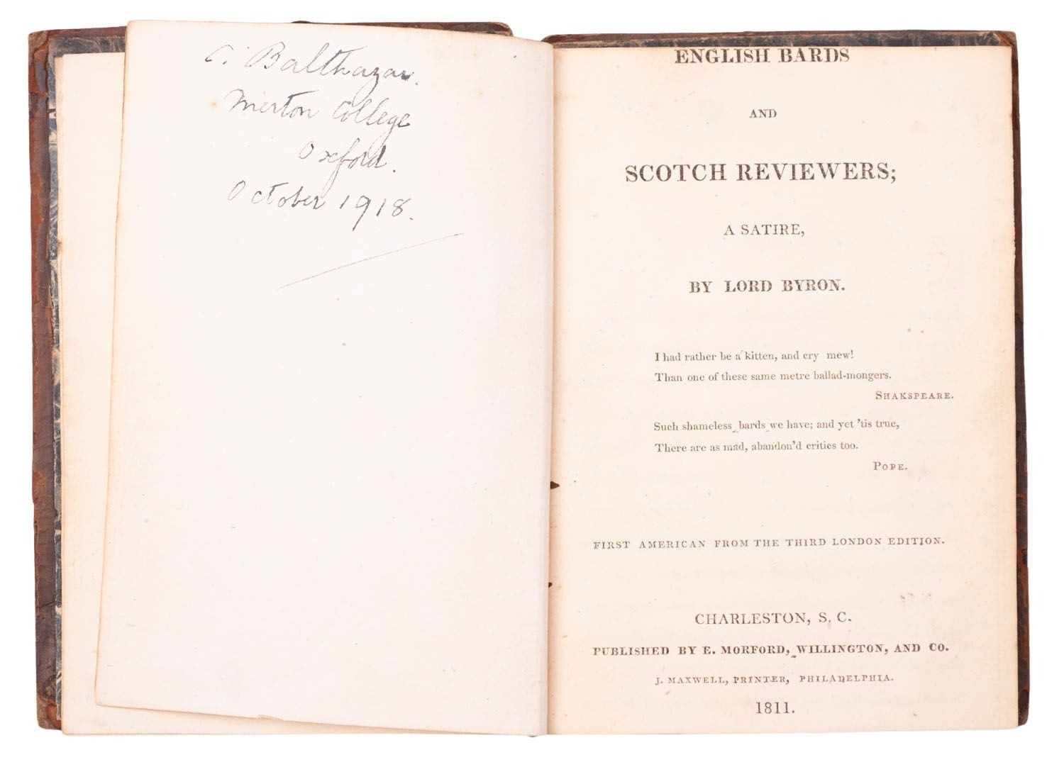 BYRON, George Gordon. English Bards and Scotch Reviewers; A Satire,... first American from the third London edition, Charleston: E. Morford, Willington, and Co., 1811, ink ownership inscription to flyleaf, contemp. panelled calf, boards detached, marbled edges and endpapers, armorial bookplate, 12mo.