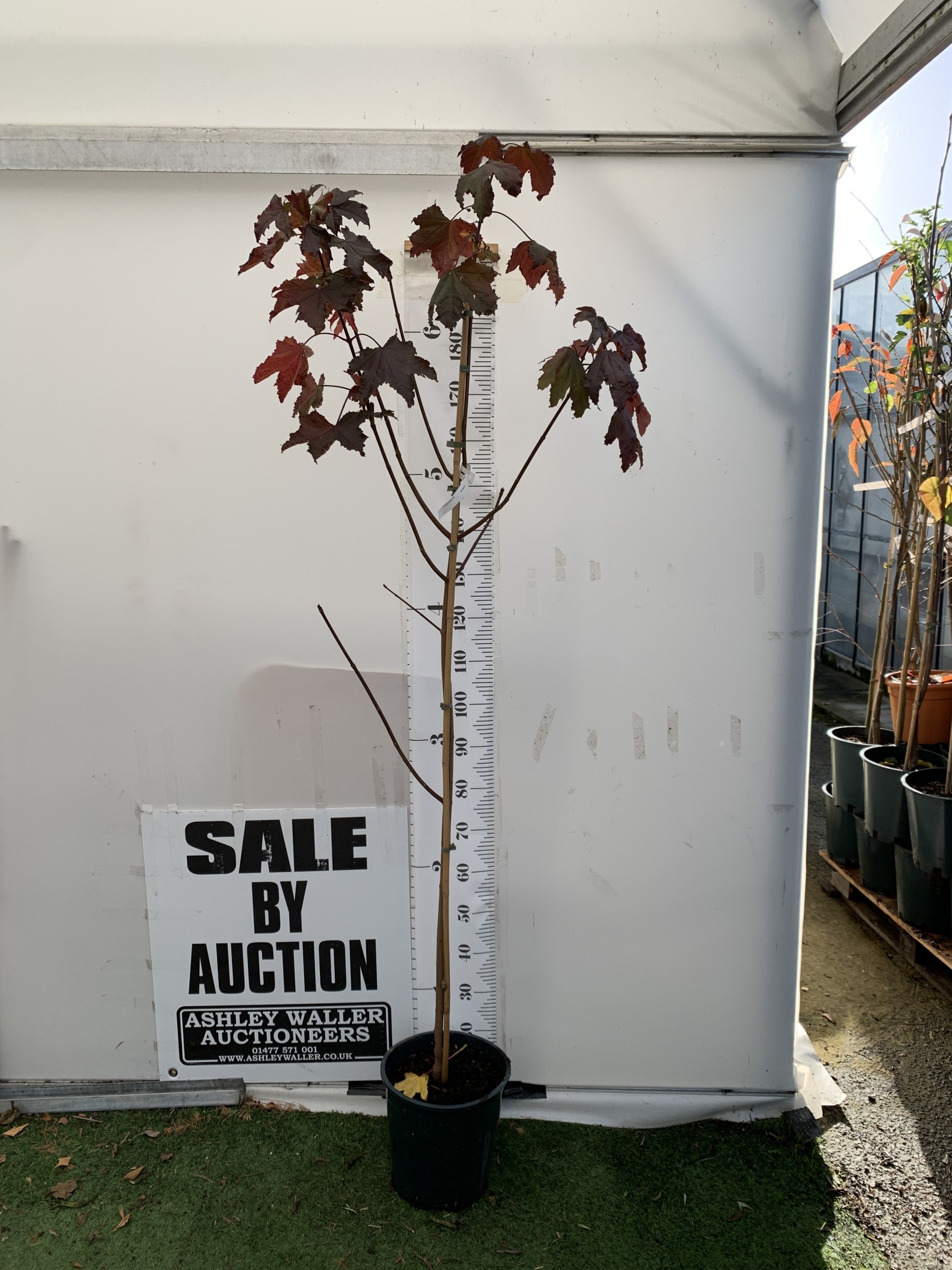ONE ACER PLATANOIDES 'CRIMSON KING' PURPLE MAPLE IN A 12 LTR POT. OVER 2M TALL, THIS ACER HAS LIME GREEN FLOWERS TINGED RED IN APRIL. IT HAS INTENSE PURPLE LEAVES TURNING ORANGE IN AUTUMN.