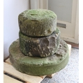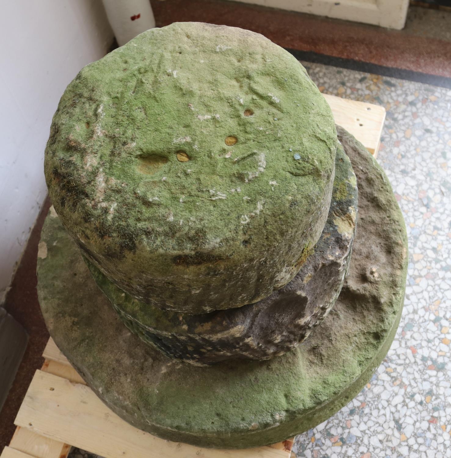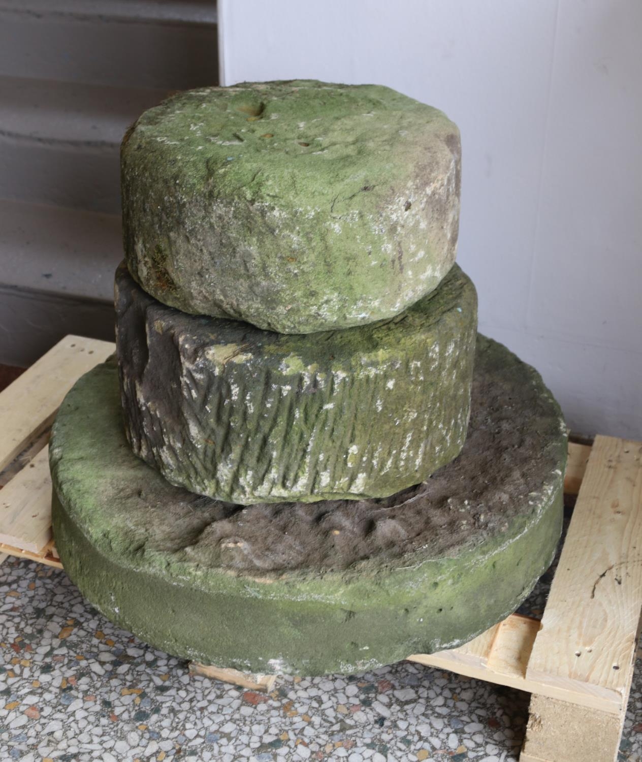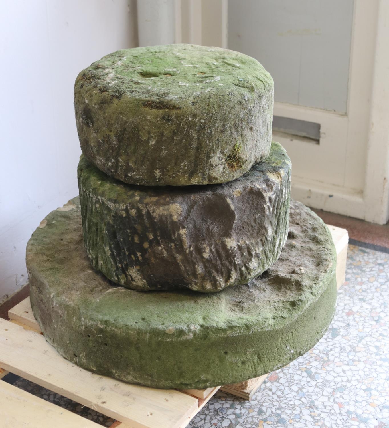 Three carved stone mill stones Large 61cmMedium 39cmSmall 35cm