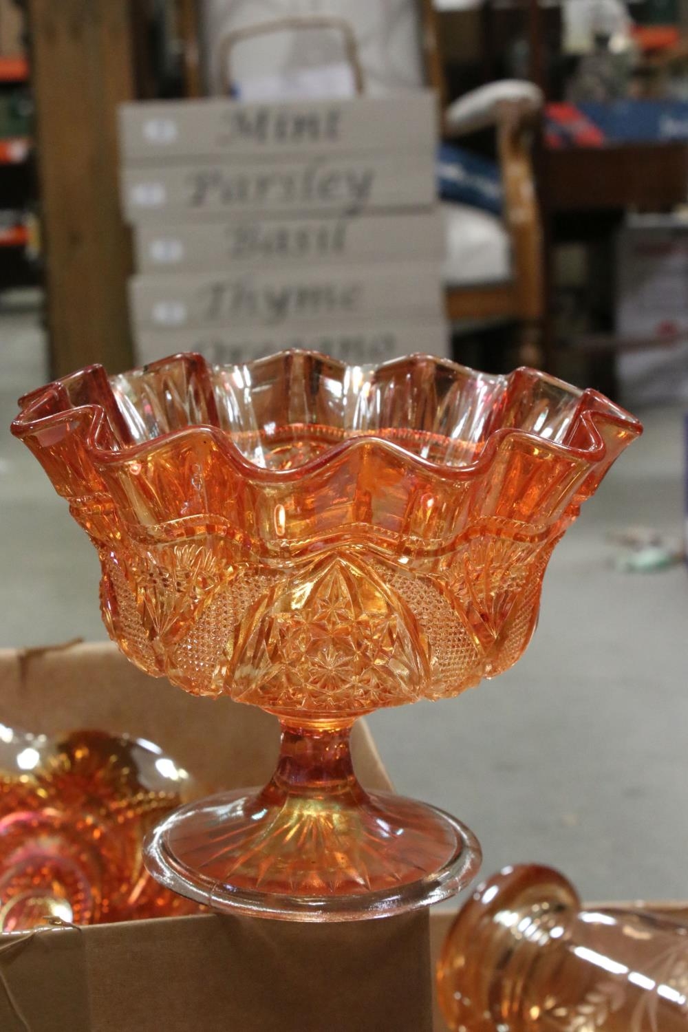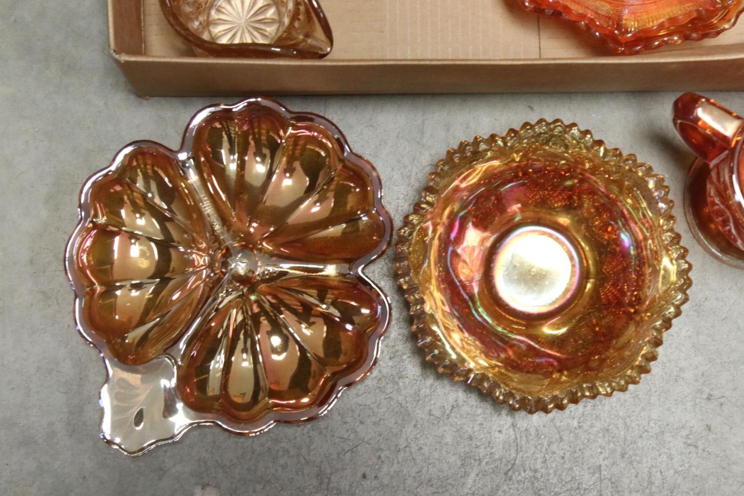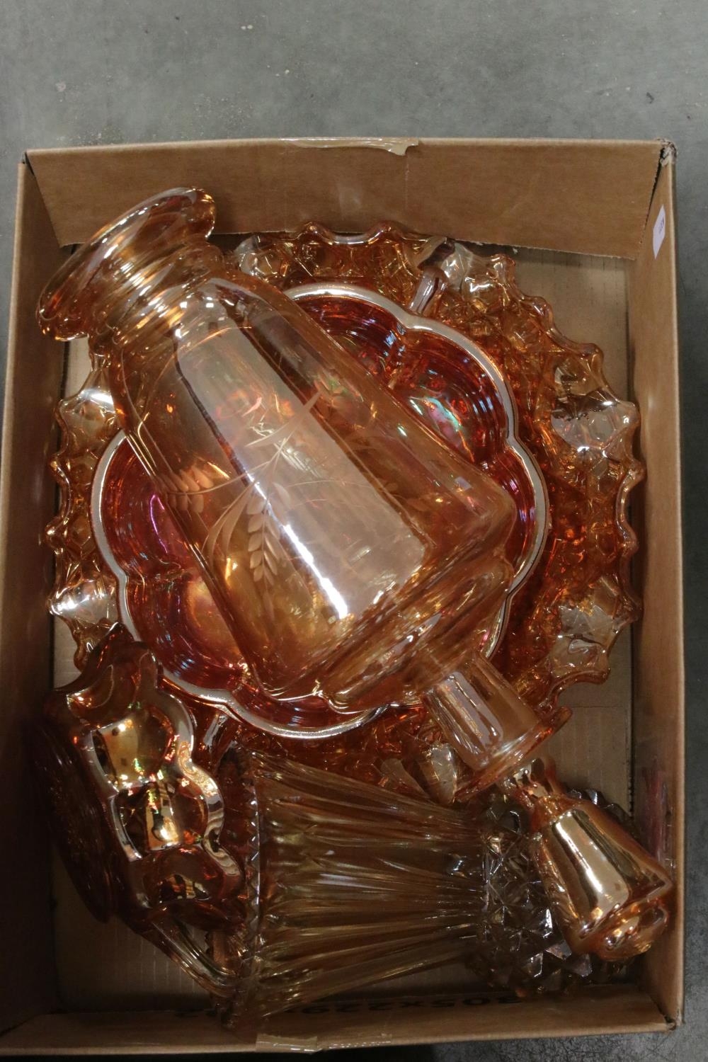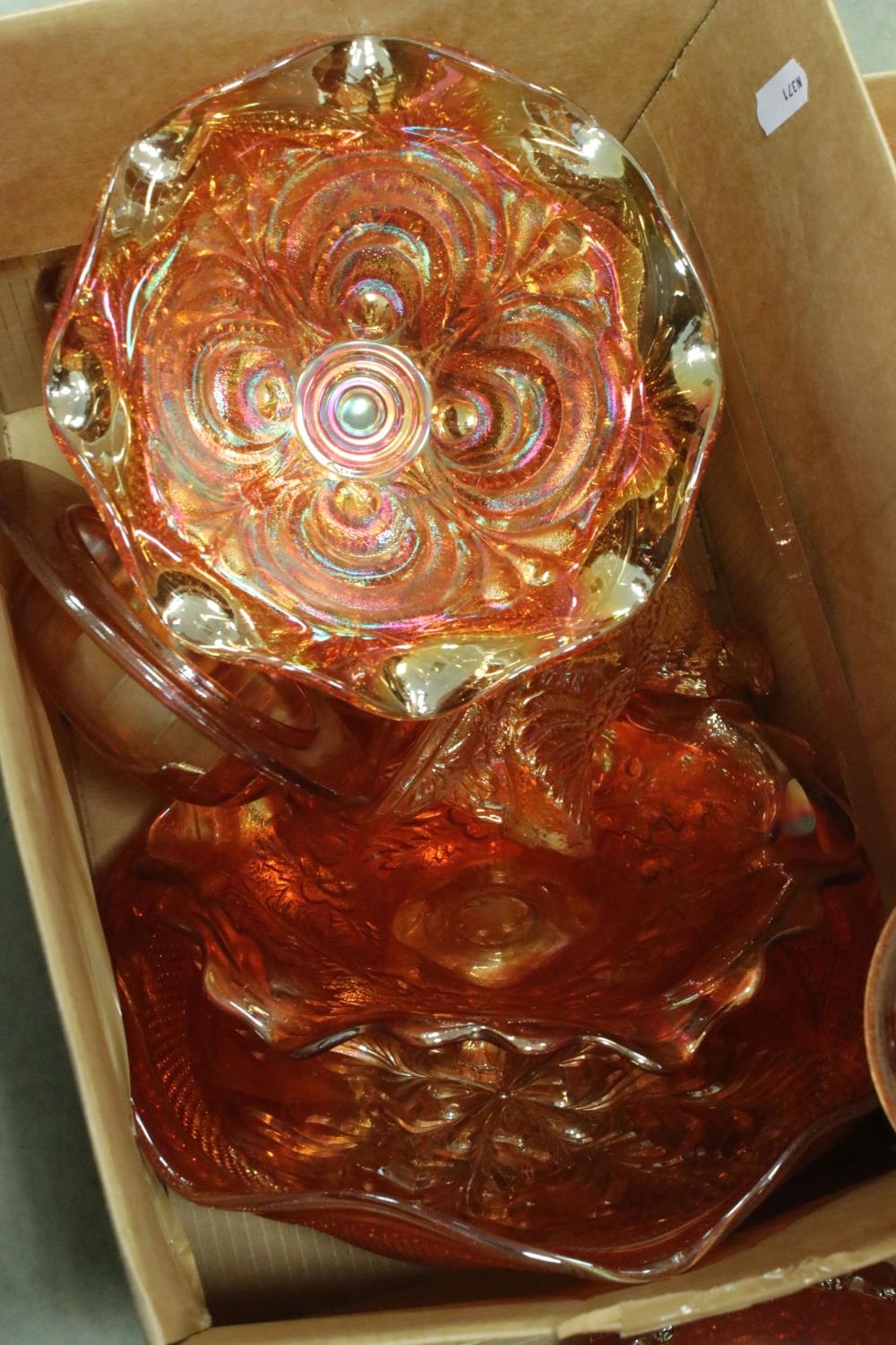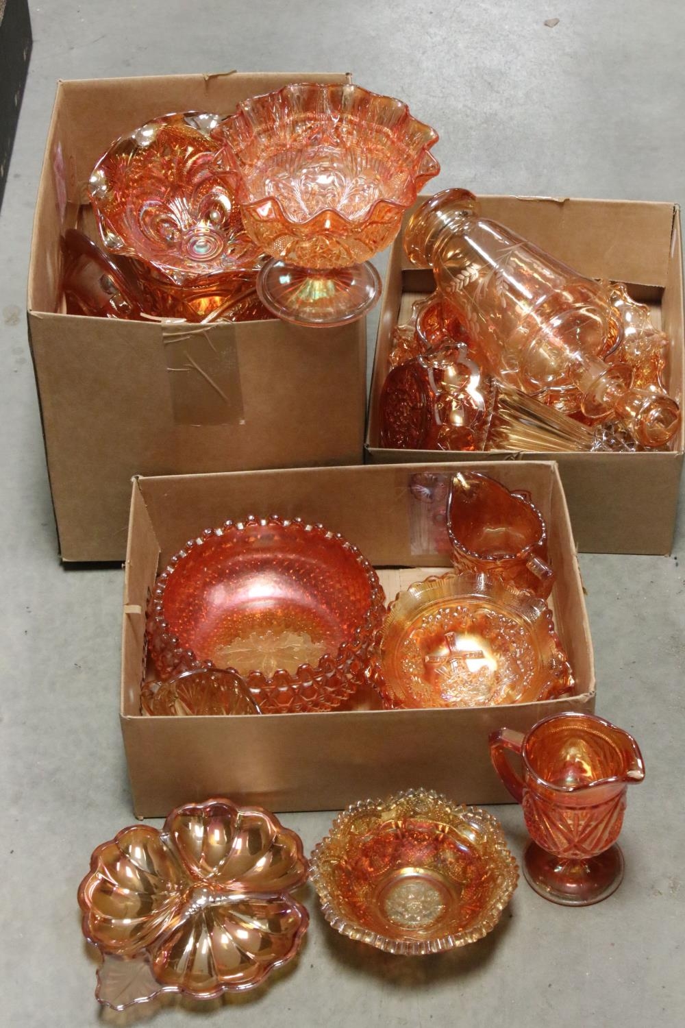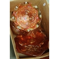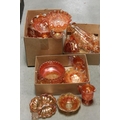 Collection of Orange Carnival Glass including Plates, Bowls, Jugs, Vases, Decanter, approx. 19 pieces in total