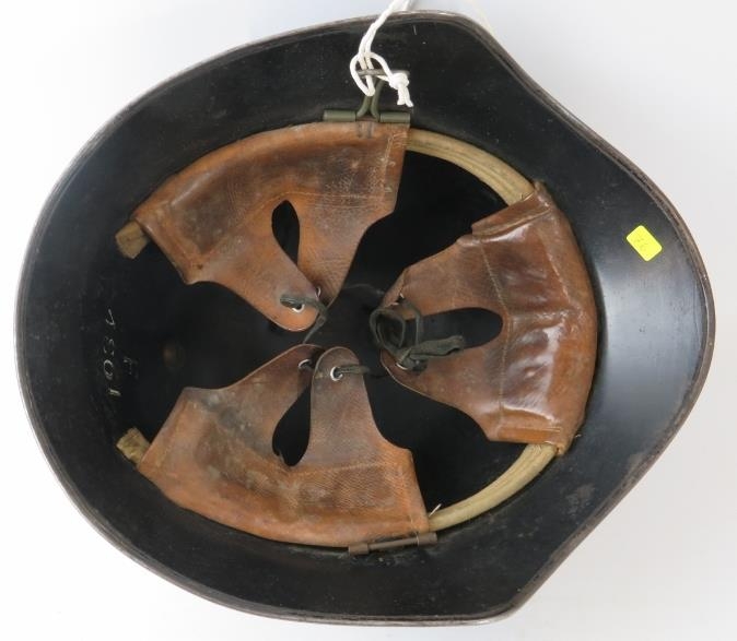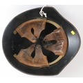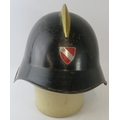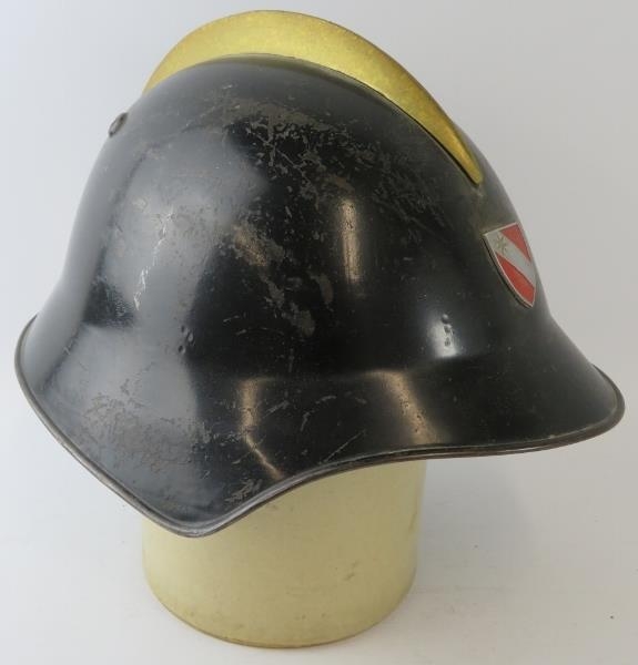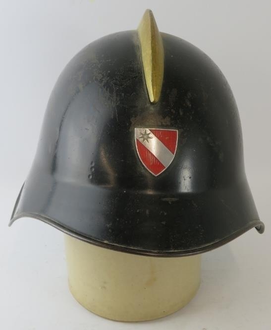 A 1980 Swiss Fire Service black steel fire helmet with brass mount