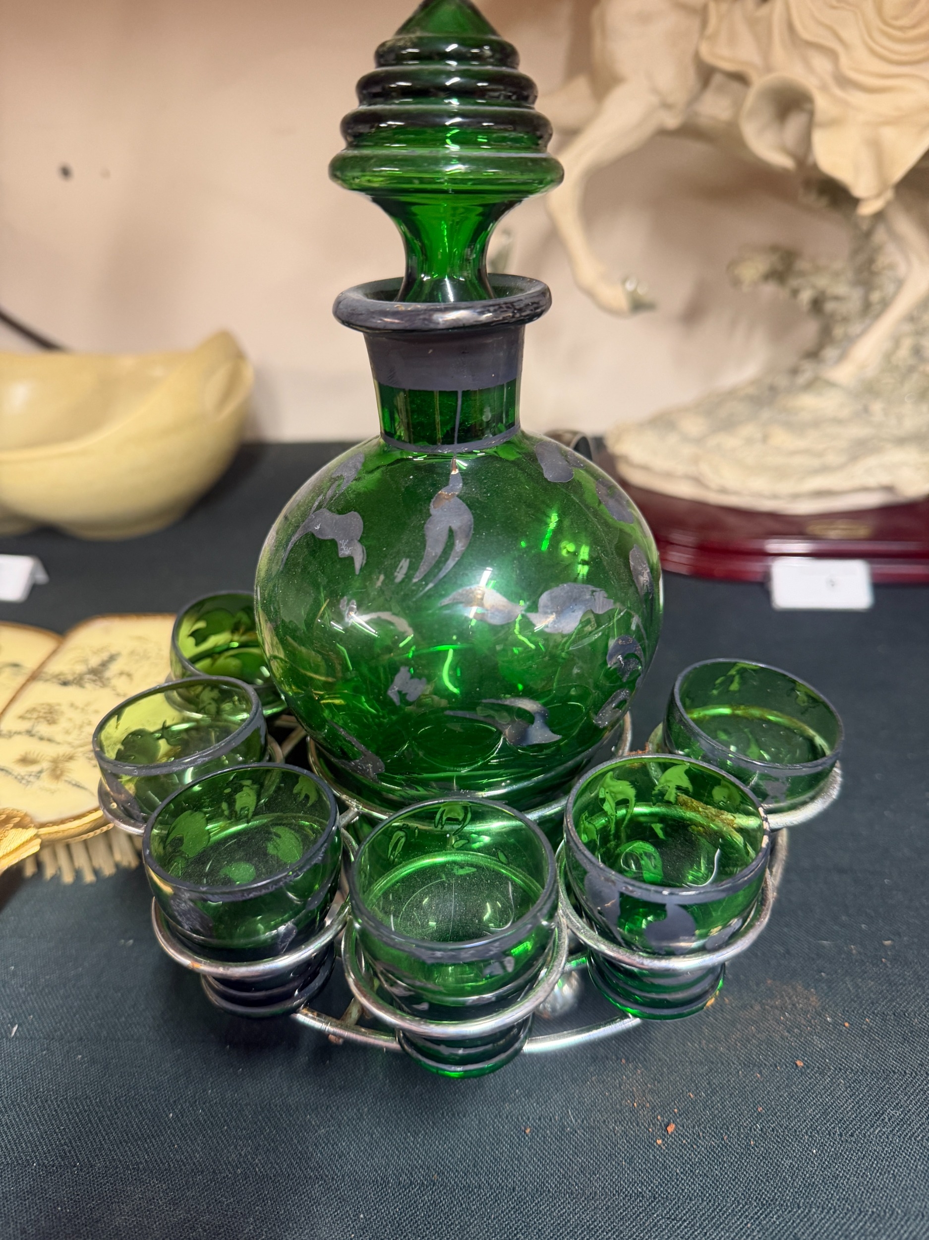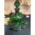 Green Glass Decanter with 6 Cordial Glasses with Silver Plated Tray