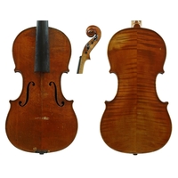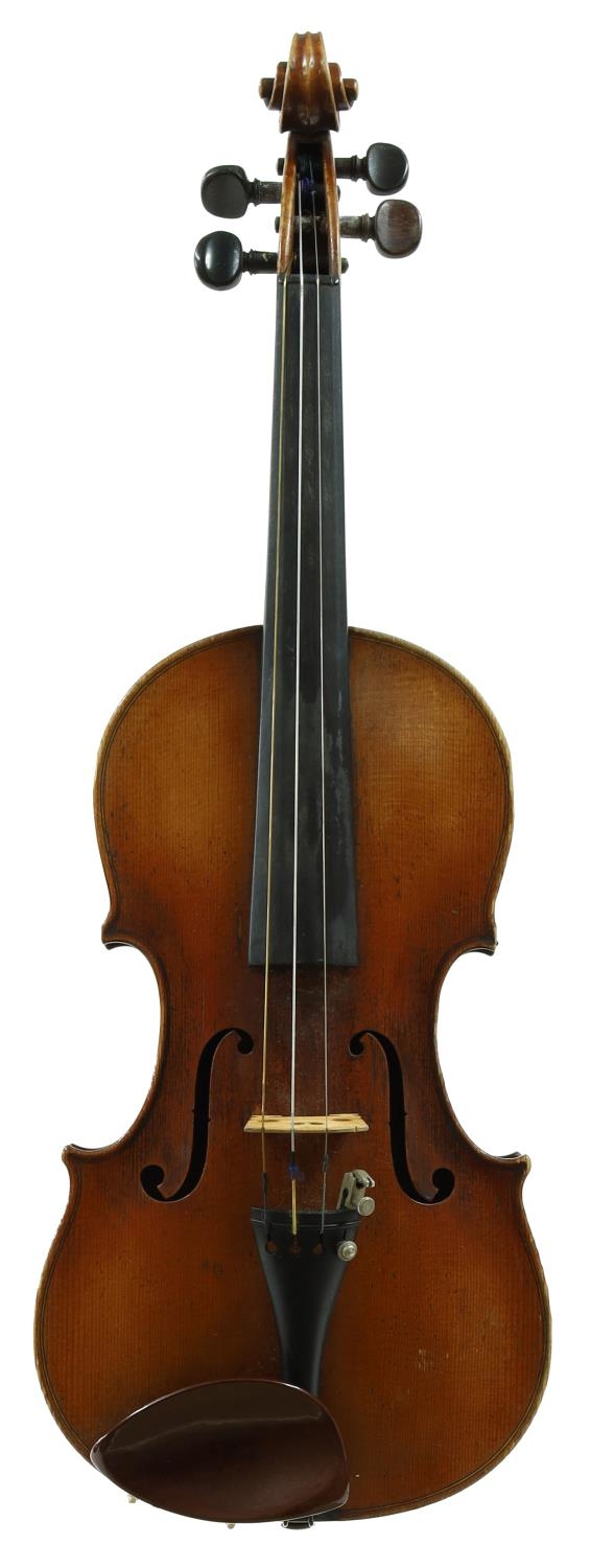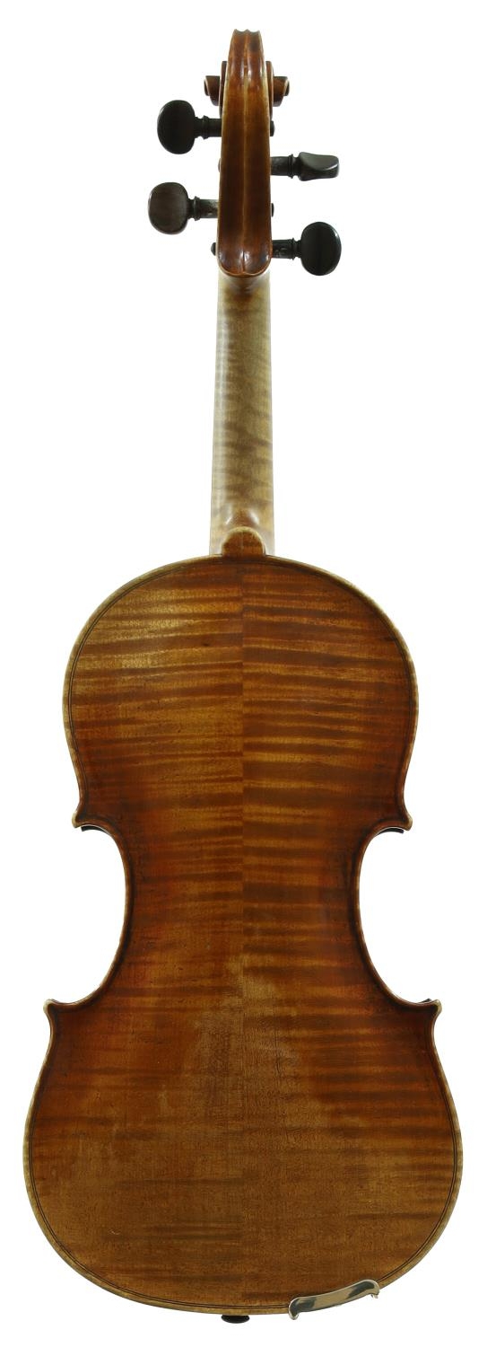 French seven-eighth size violin labelled Copie de Nicolaus Amatius...,; also labelled Violin Ecole Grandini, the two piece back of medium curl with similar wood to the sides and head, the table of a medium width grain and the varnish of a reddish-brown colour on a golden ground, 13 11/16", 34.80cm