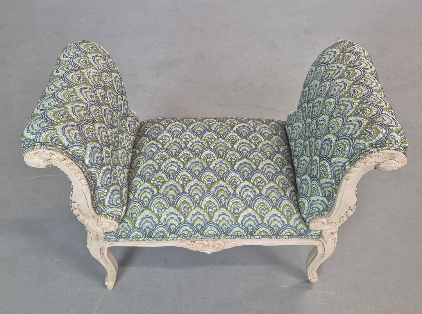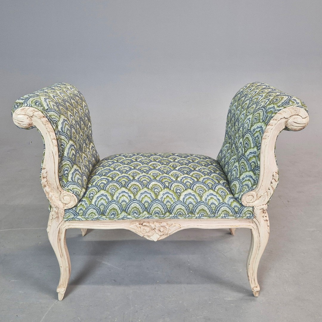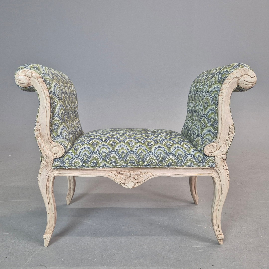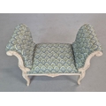 LOUIS XV STYLE PAINTED STOOL. raised ends in blue and green patterned fabric, 68cm H x 87cm W x 45cm D.