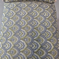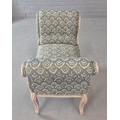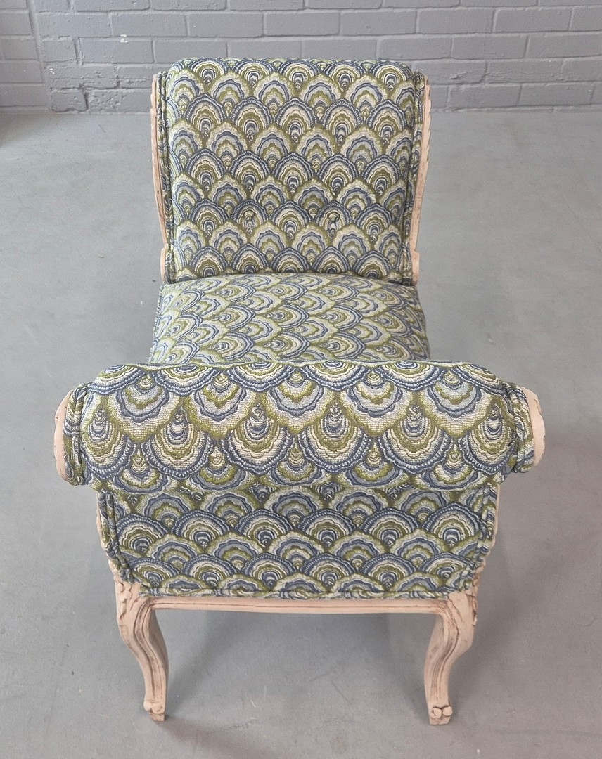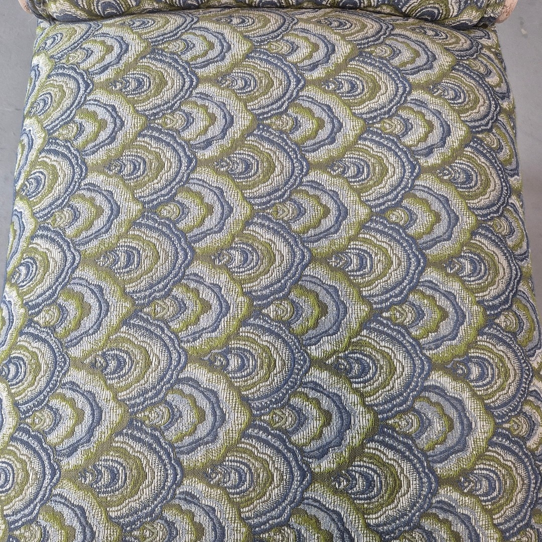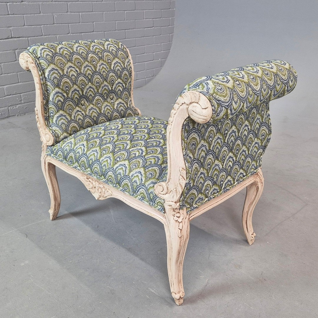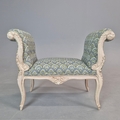 LOUIS XV STYLE PAINTED STOOL. raised ends in blue and green patterned fabric, 68cm H x 87cm W x 45cm D.