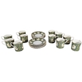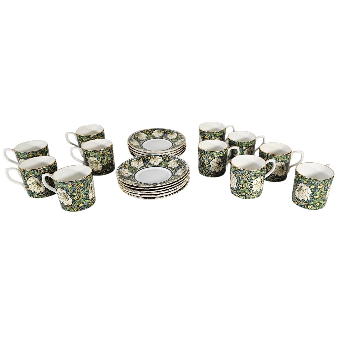 A fine set of eleven bone china coffee cans and saucers by Museum Collections Ltd, England, featuring the iconic 1876 'Pimpernel' floral pattern with deep green foliage and cream blooms, finished with gilt rims. Includes matching saucers, marked to base ‘Museum Collections Ltd’.