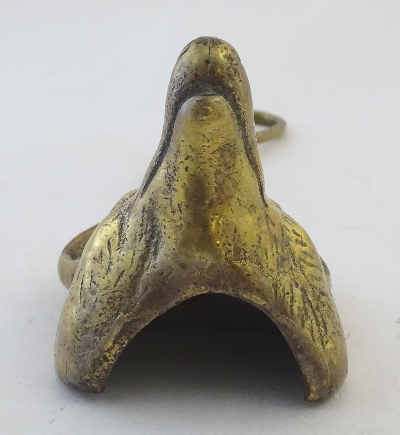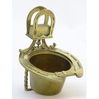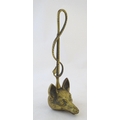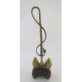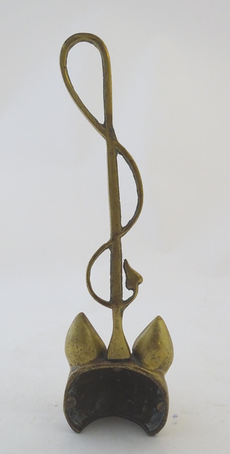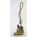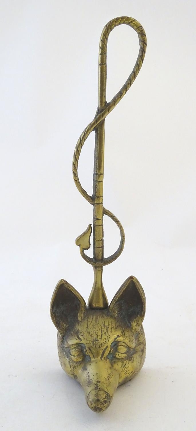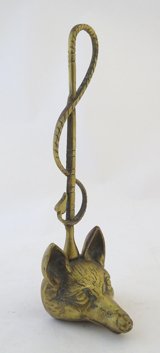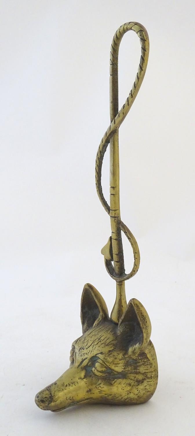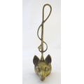A Victorian cast brass figural doorstop/door porter, hunting themed, formed as a fox mask surmounted by a hunting whip. 15" tall