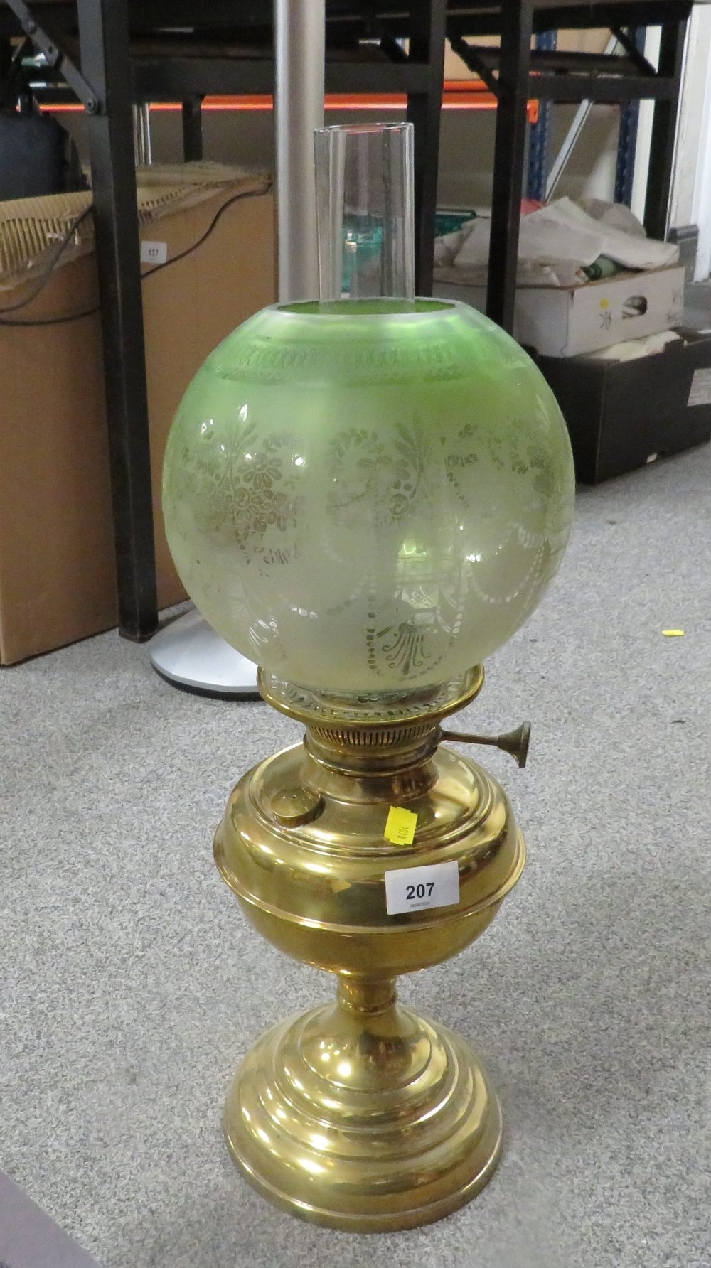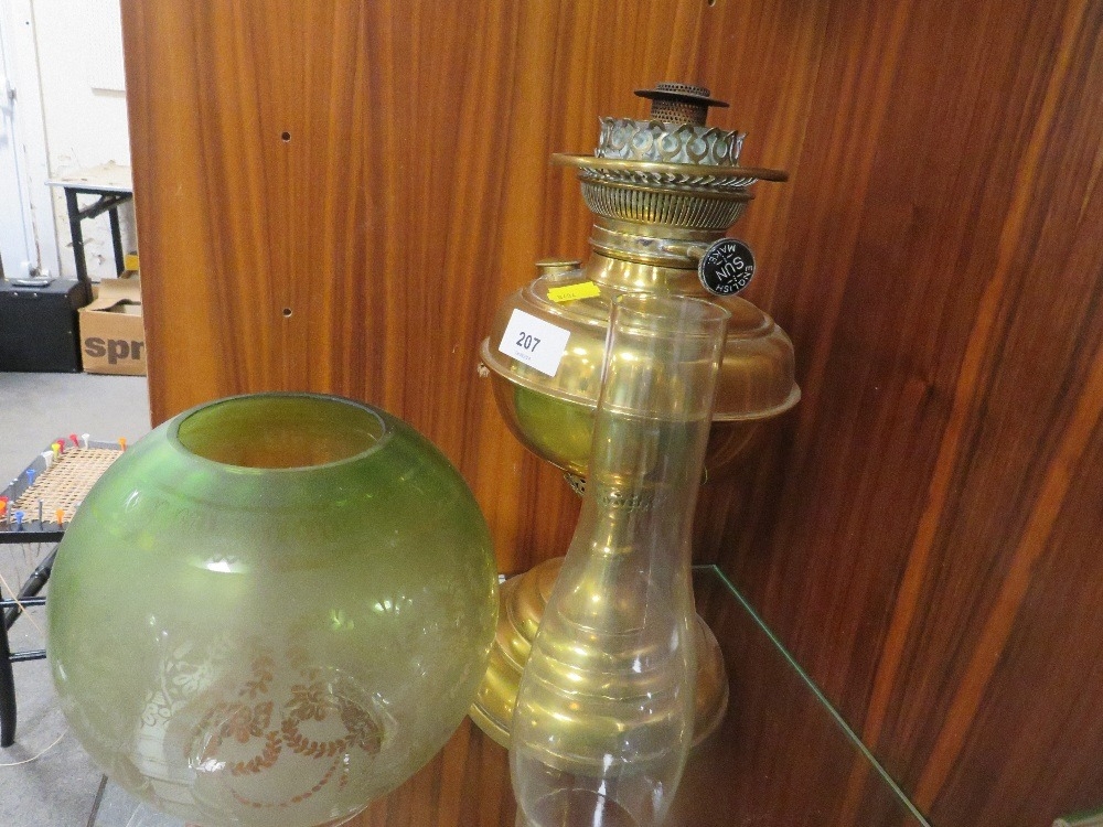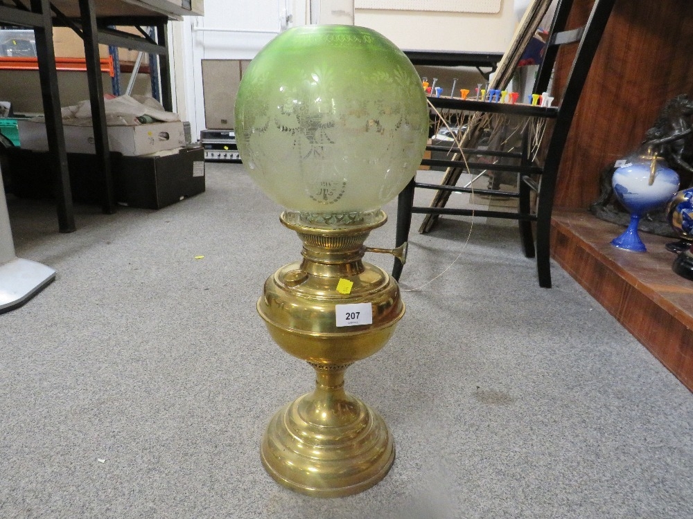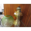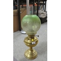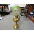 A vintage brass oil lamp together with a green etched shade