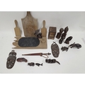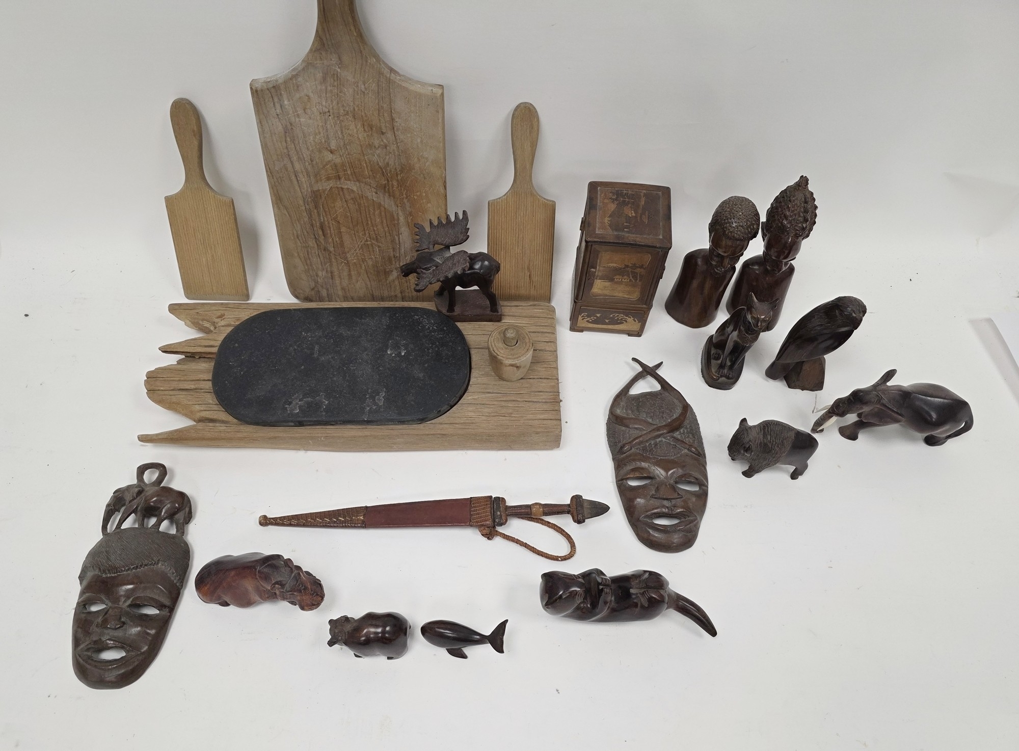 Collection of wooden / treen items including a Japanese cigarette box in the form of a cabinet, 16cm high, eight carved models of animals, pair of African busts, pair of African wall masks, pair of butter pats, two chopping boards and an ethnic knife in leather sheath