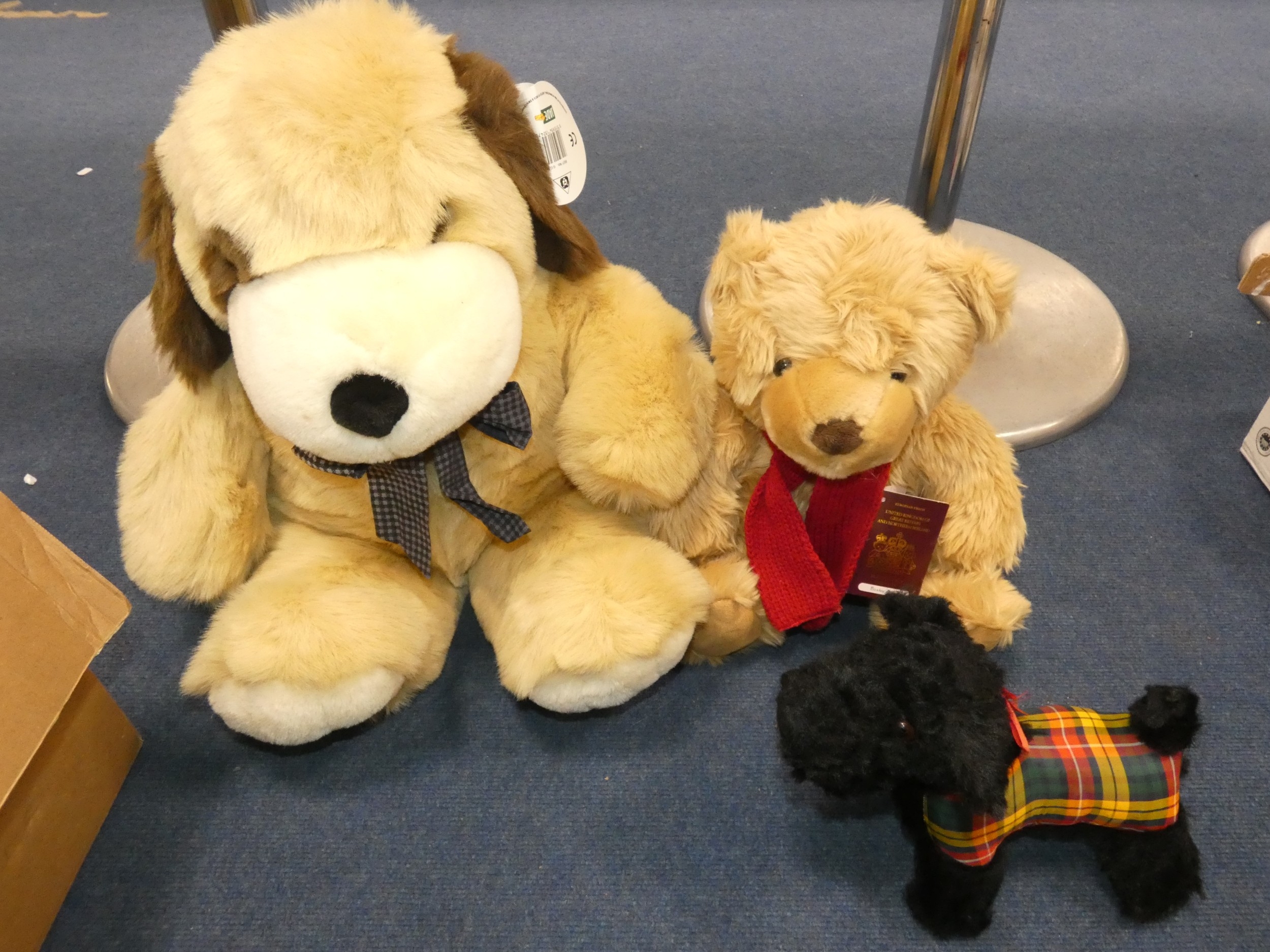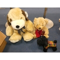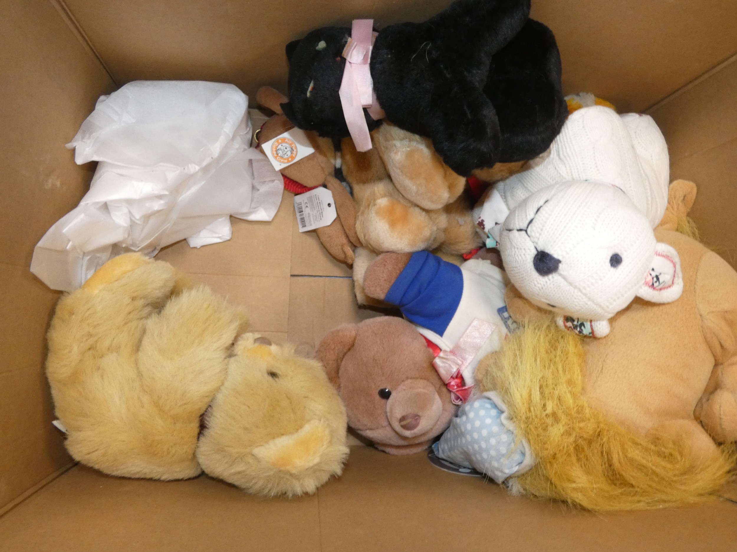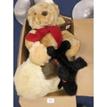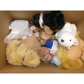 Carton containing soft toys and teddy bears, mainly modern examples.