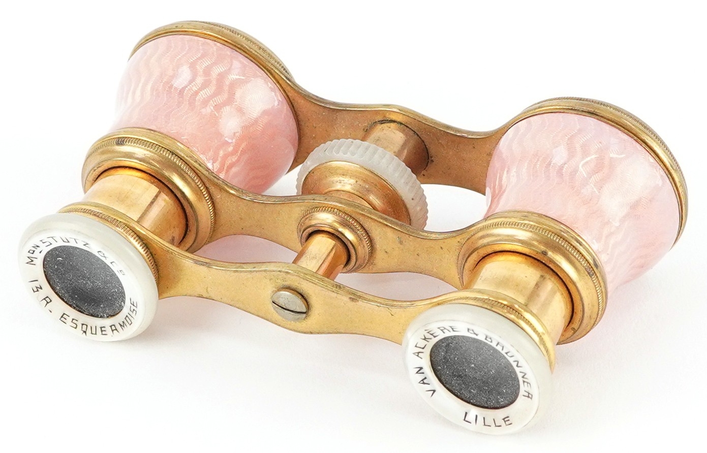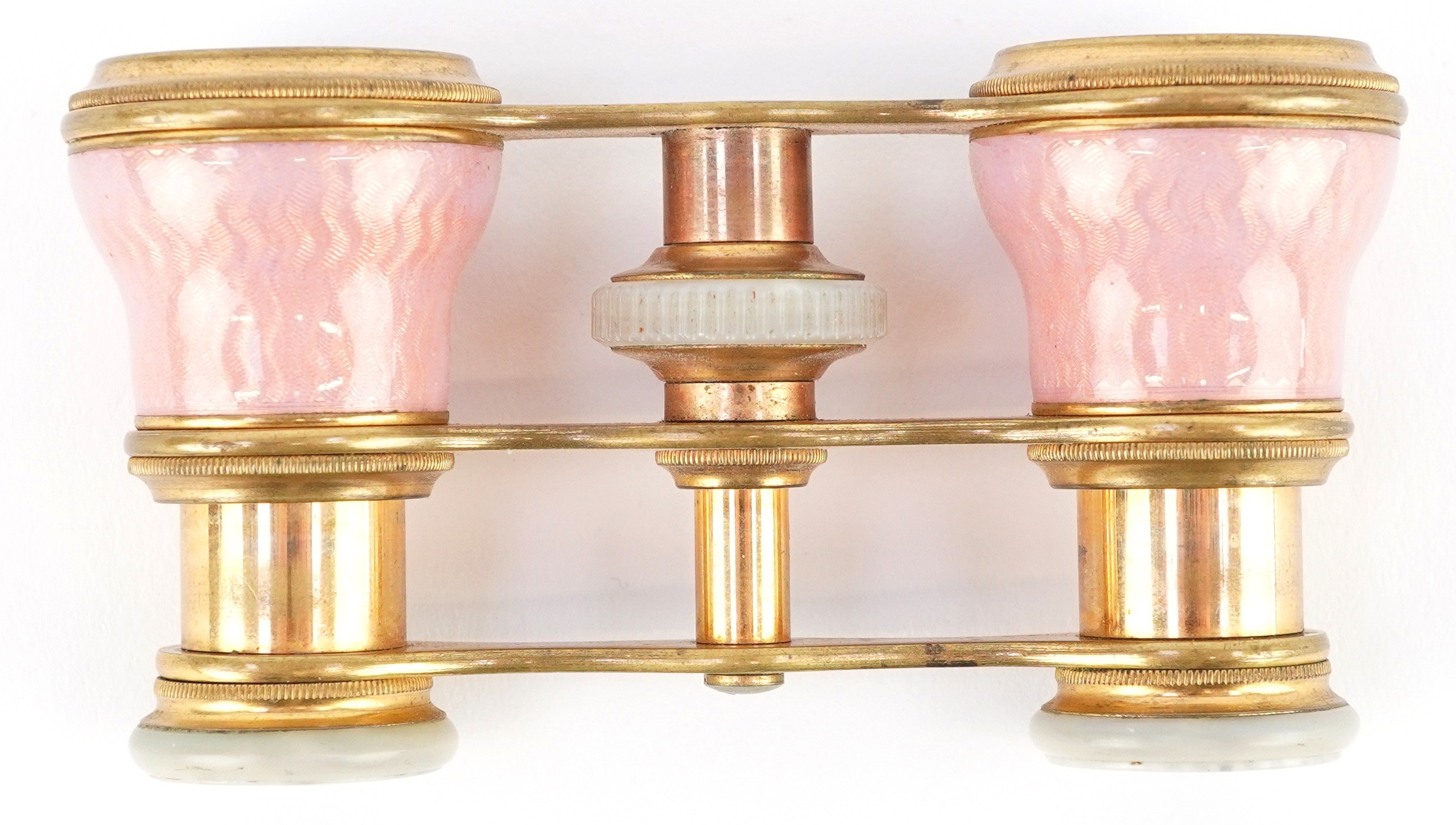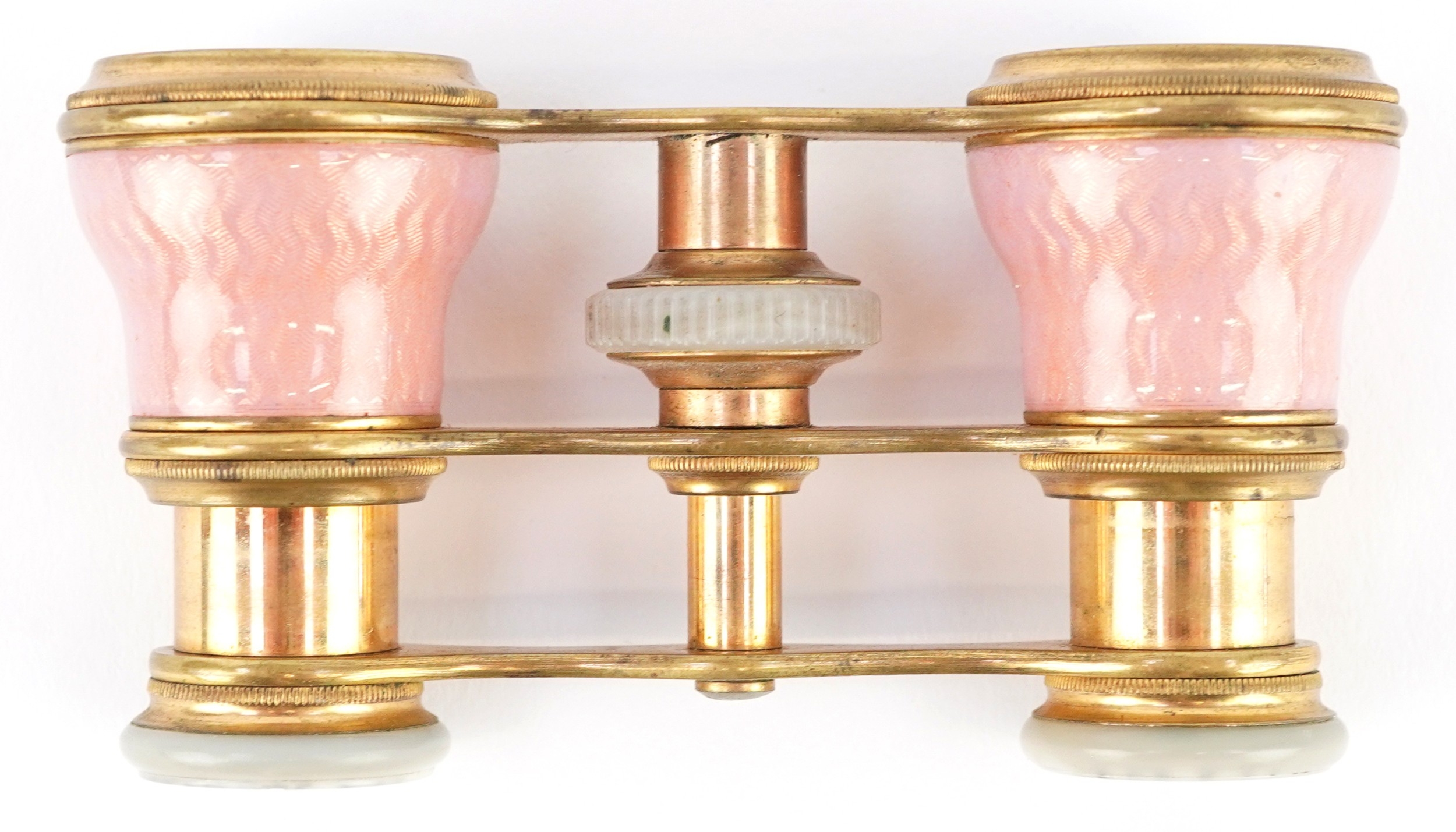A pair of early 20th century French brass and pink guilloche enamel opera glasses, 9cm wide.