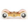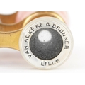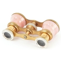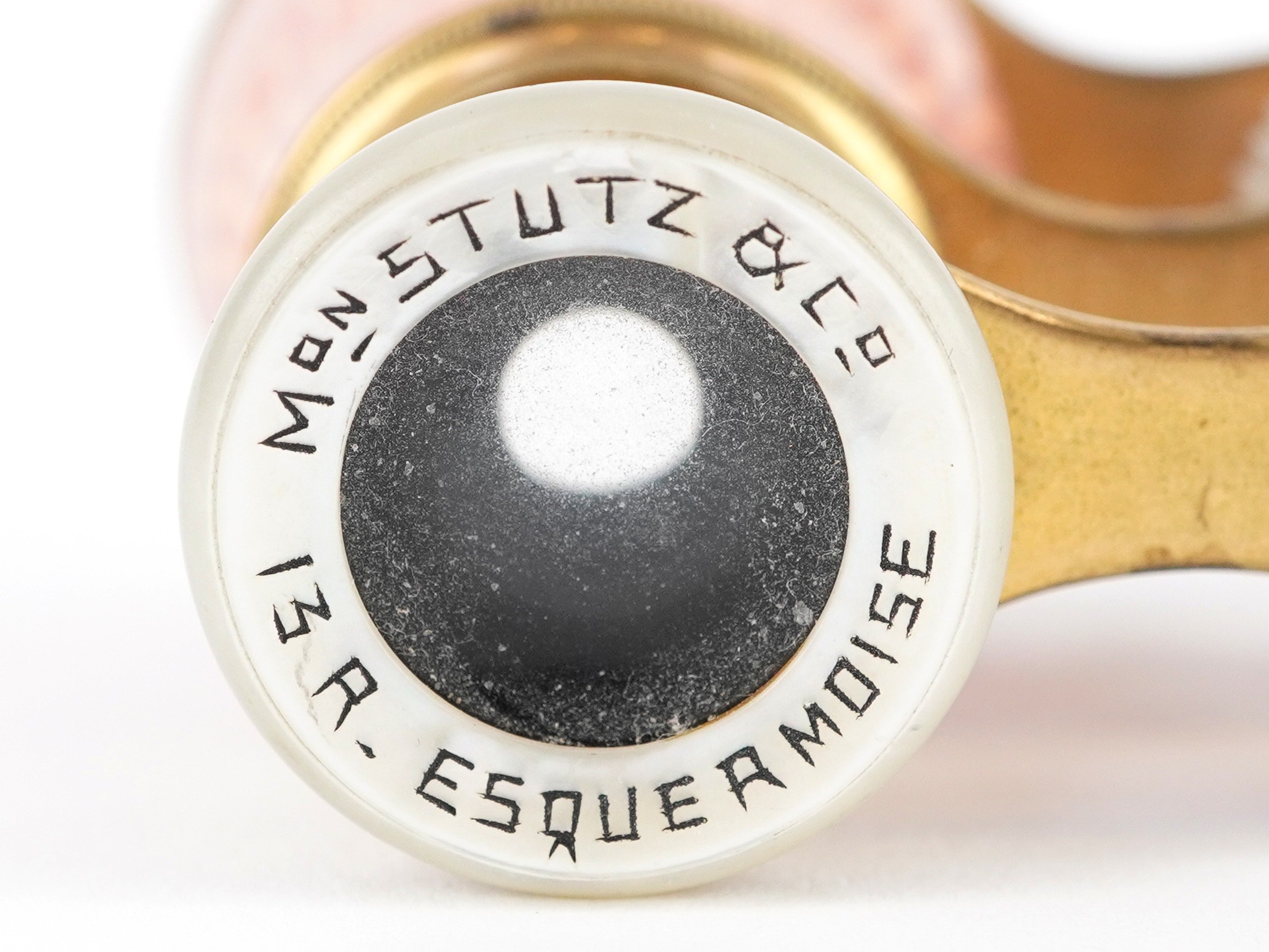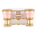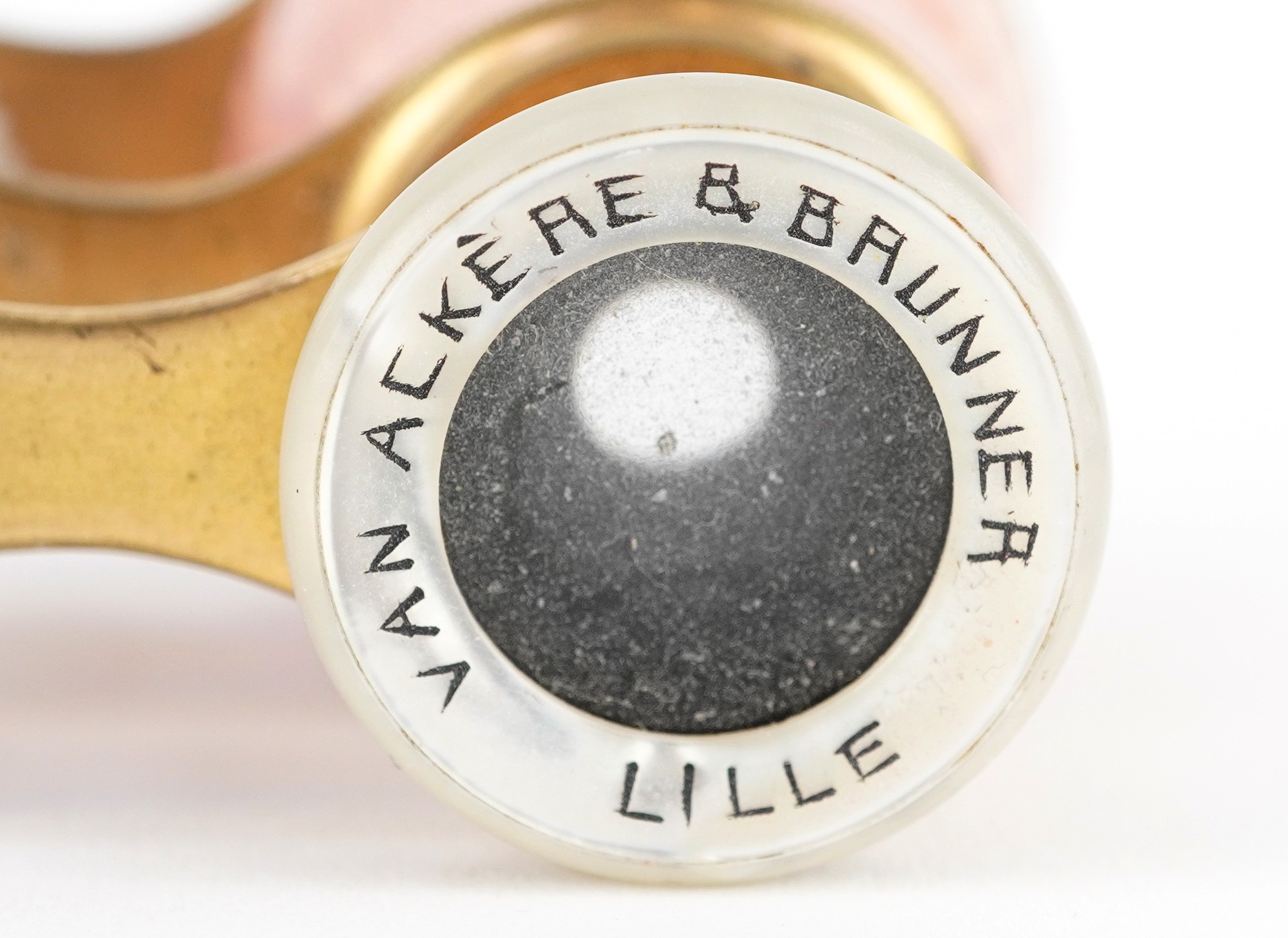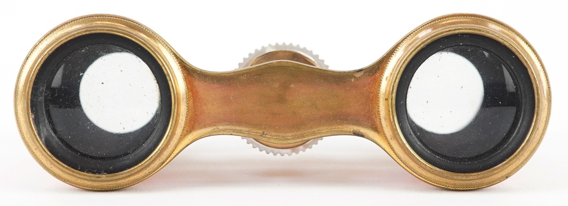 A pair of early 20th century French brass and pink guilloche enamel opera glasses, 9cm wide.