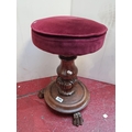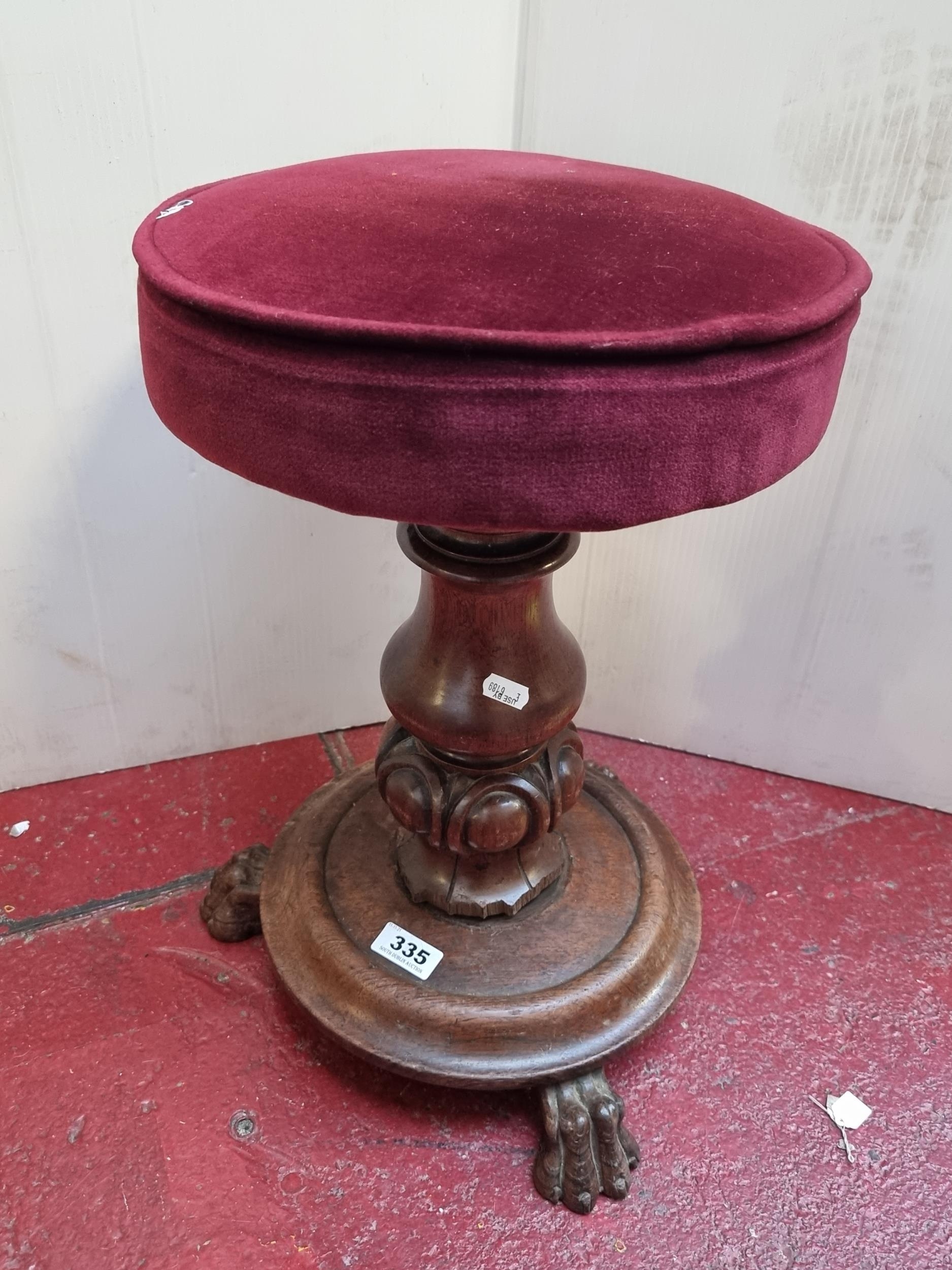An elegant Irish Victorian piano stool with a red velvet seat. Boasts lovely clawed feet in the Irish style typical of the period.